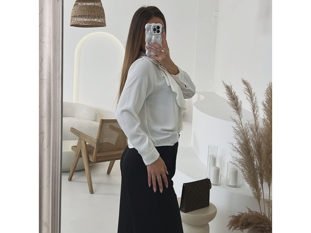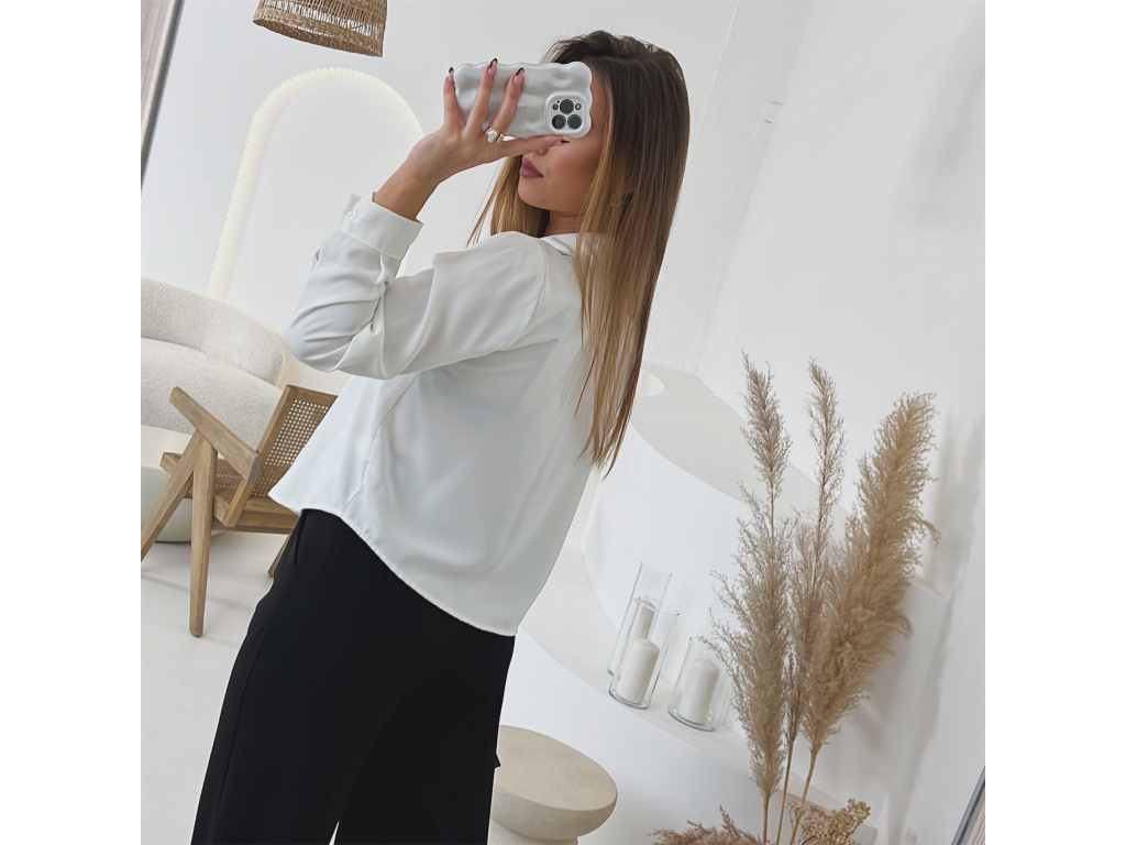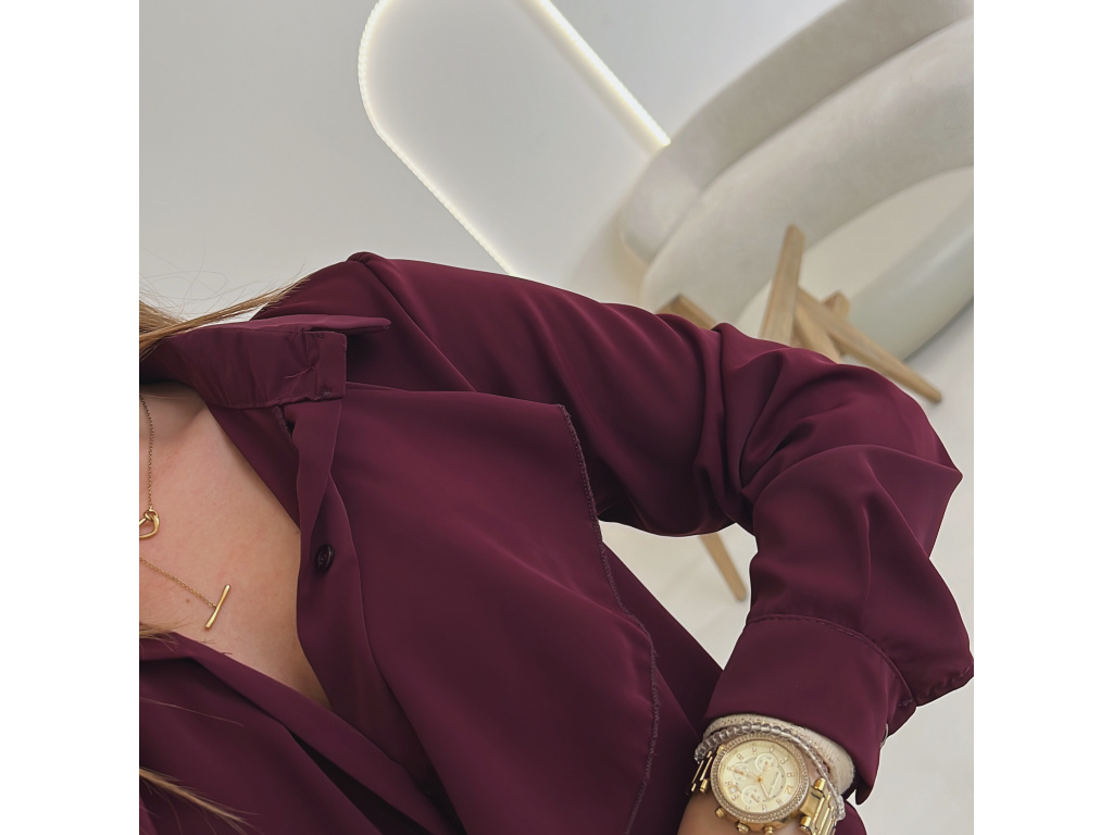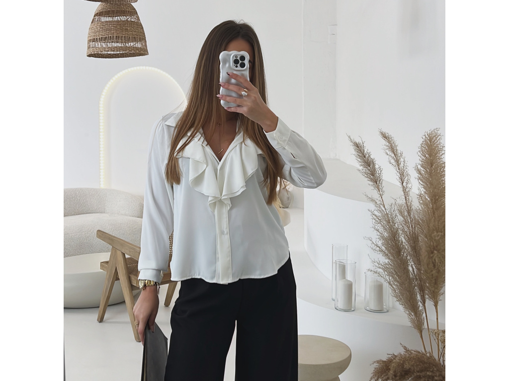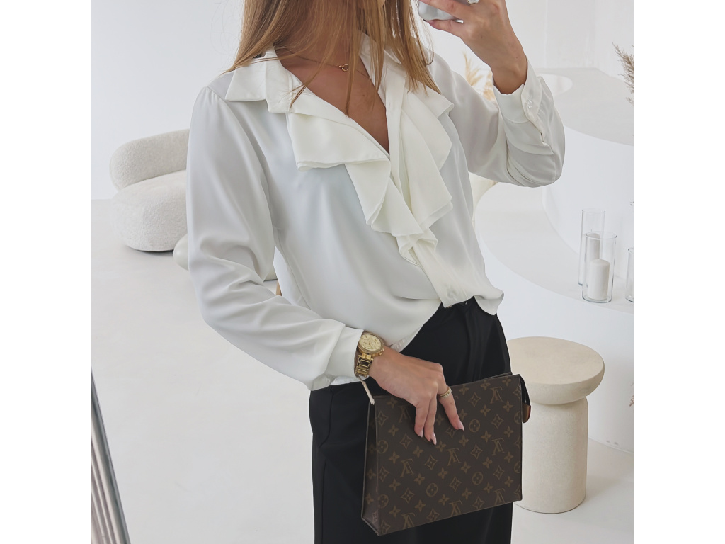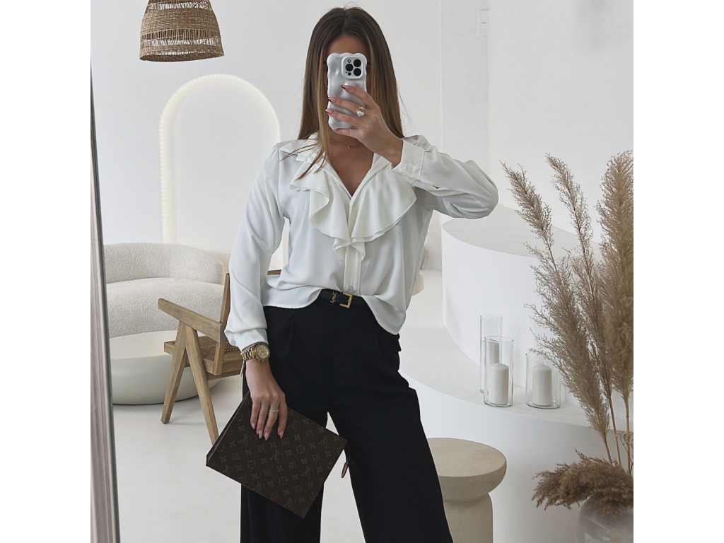 Elegantní košile s jemným volánem podél výstřihu dodá každému outfitu ženskost a šarm. Lehký, příjemný materiál krásně splývá a vytváří sofistikovaný vzhled vhodný jak do práce, tak i na večerní příležitosti. Dostupná ve dvou barvách – vínové a bílé.