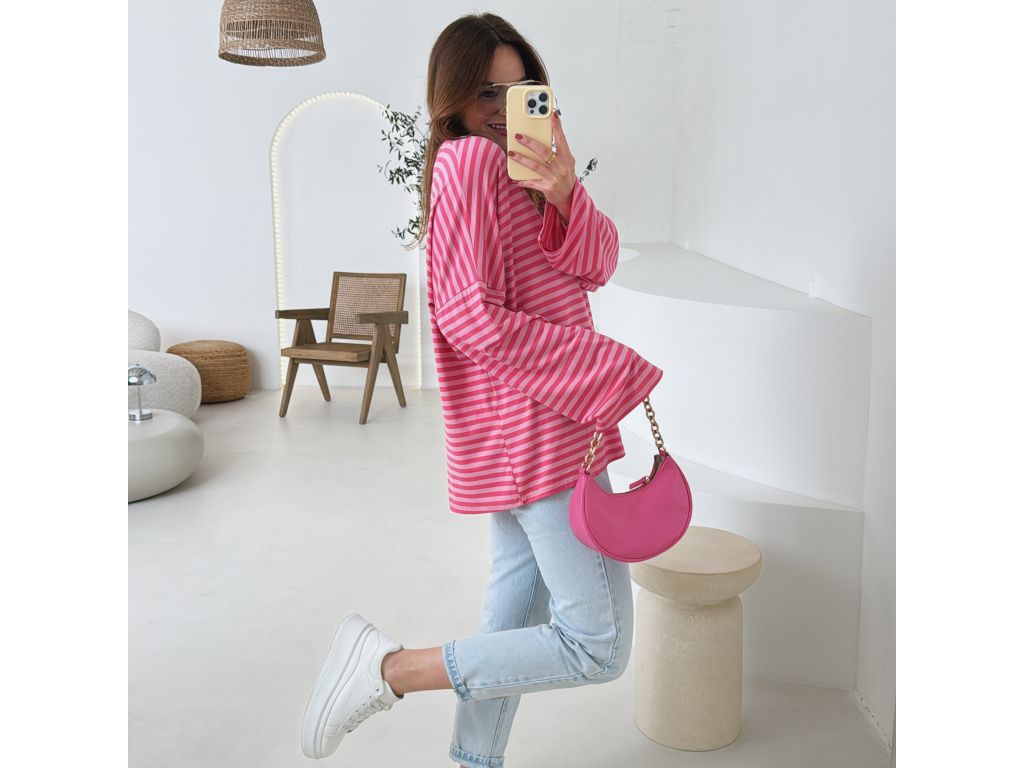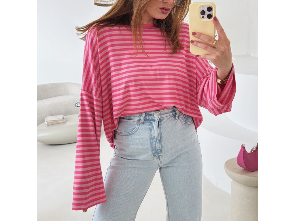 Stylové pruhované tričko v oversize střihu, které zaujme na první pohled. Má moderní široké rukávy, které jsou velkým trendem této sezóny, a velmi příjemný, poddajný materiál pro pohodlné nošení. Díky volnějšímu střihu krásně sedí a snadno se kombinuje k džínům i elegantnějším kalhotám. Dostupné je ve dvou barevných variantách: hnědá–růžová a růžová–světle růžová.