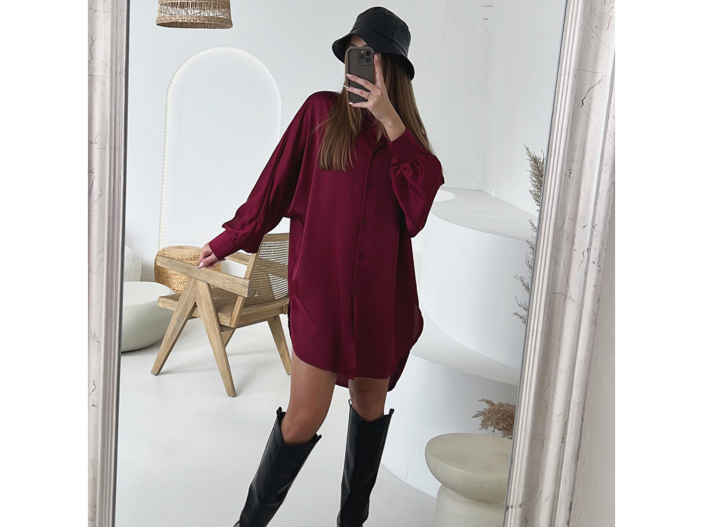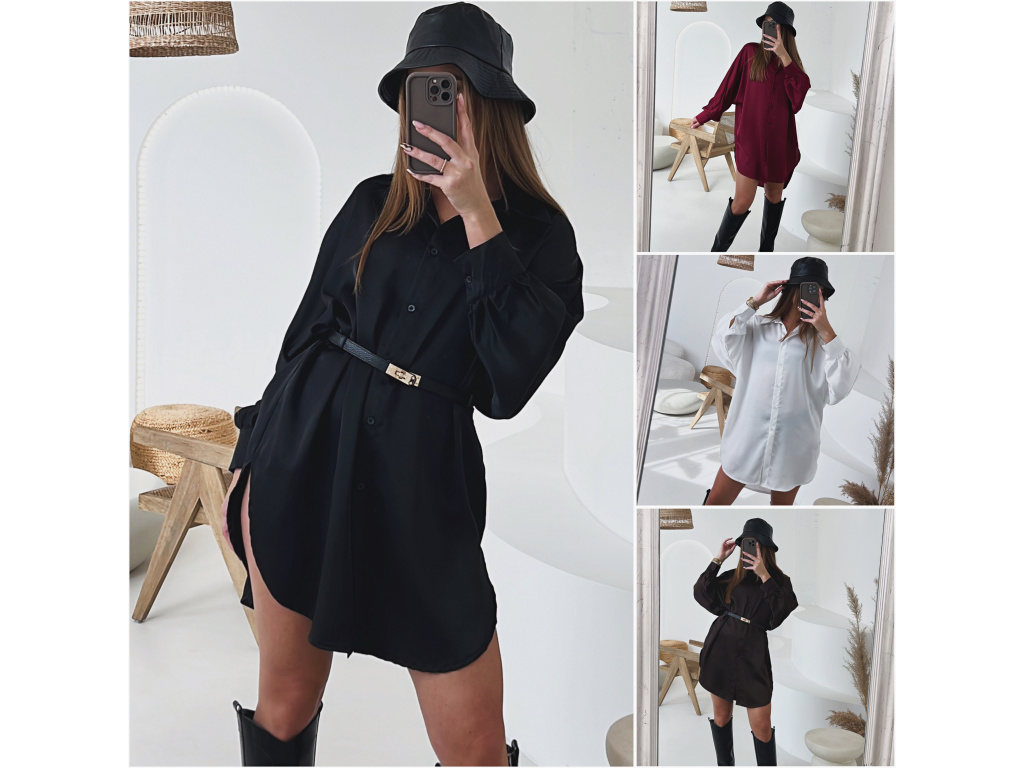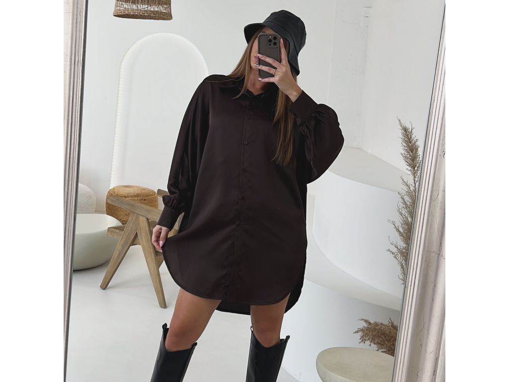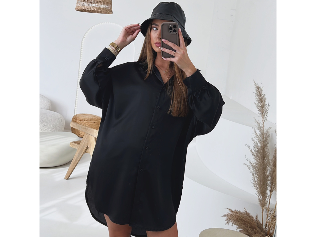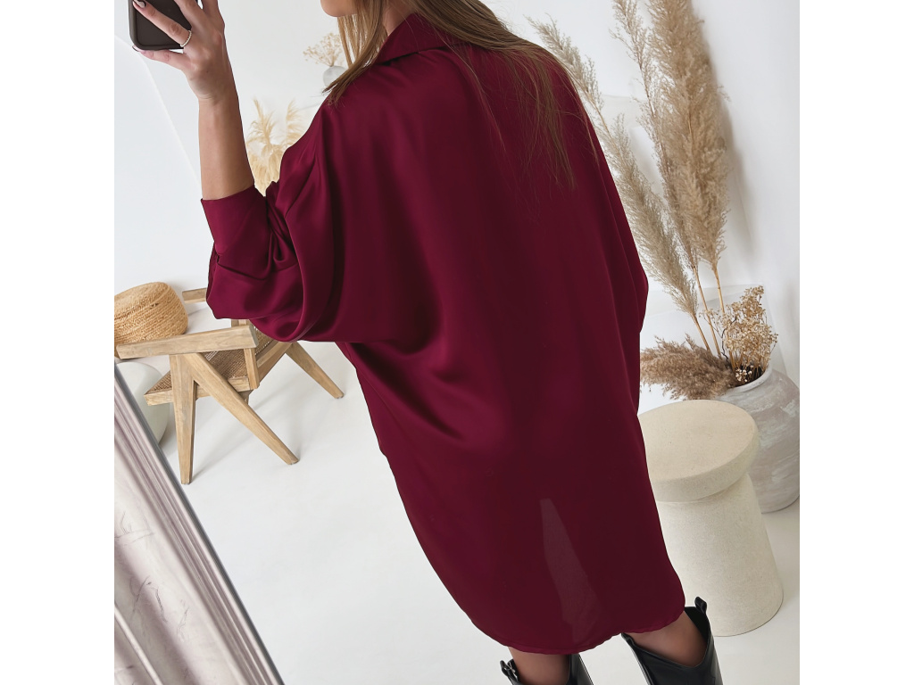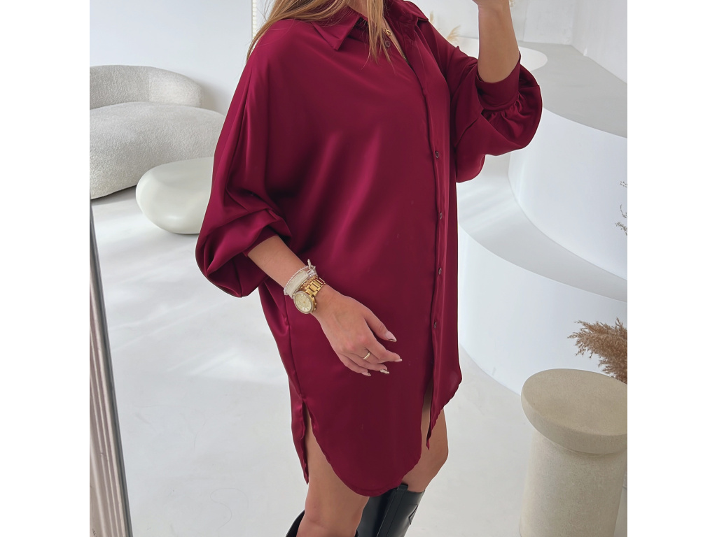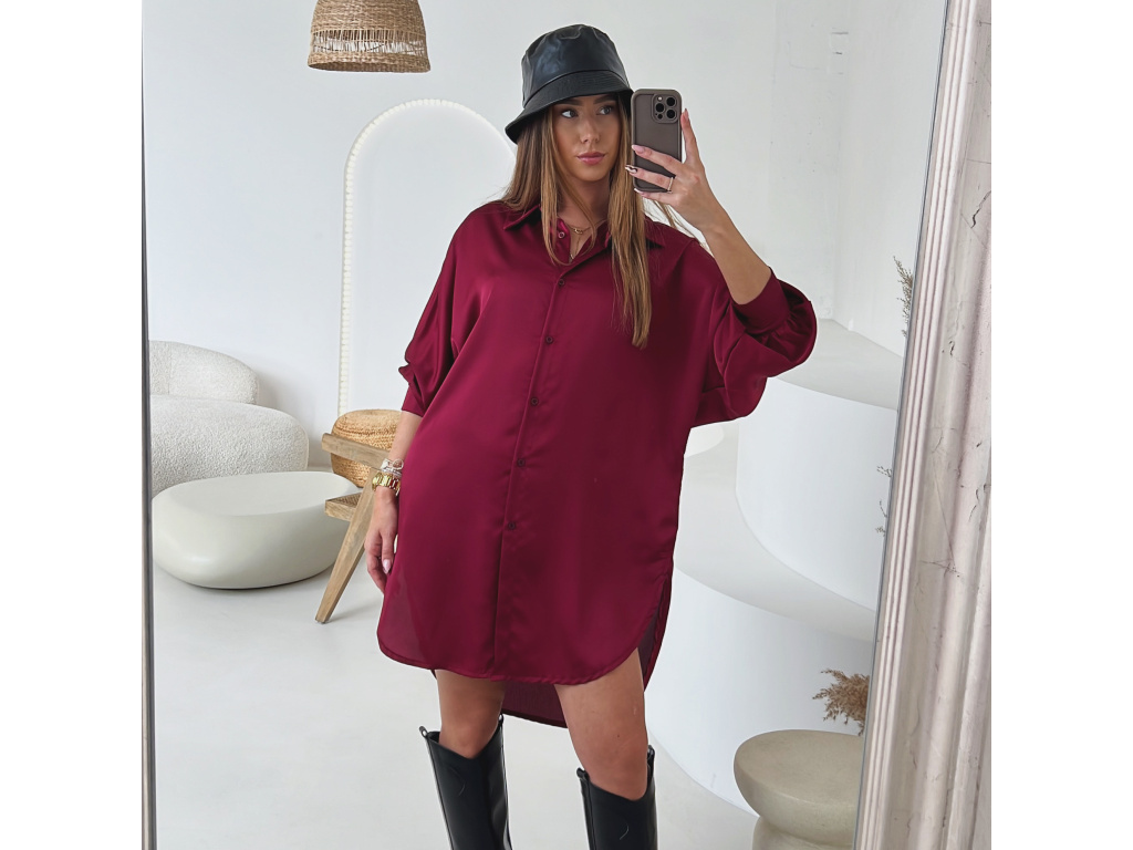 Elegantní prodloužená košile z jemného saténového materiálu, který působí luxusně a krásně splývá na postavě. Košile má volnější střih, dlouhý rukáv s manžetou a zapínání na knoflíky po celé délce. Díky své univerzálnosti ji můžeš nosit jako košili, šaty nebo vrstvený top – skvěle vypadá s páskem, který však není součástí balení (slouží pouze jako inspirace). Dostupná v několika elegantních barvách – černá, hnědá, bílá a vínová. Velikost je univerzální, sedí na XS - L.