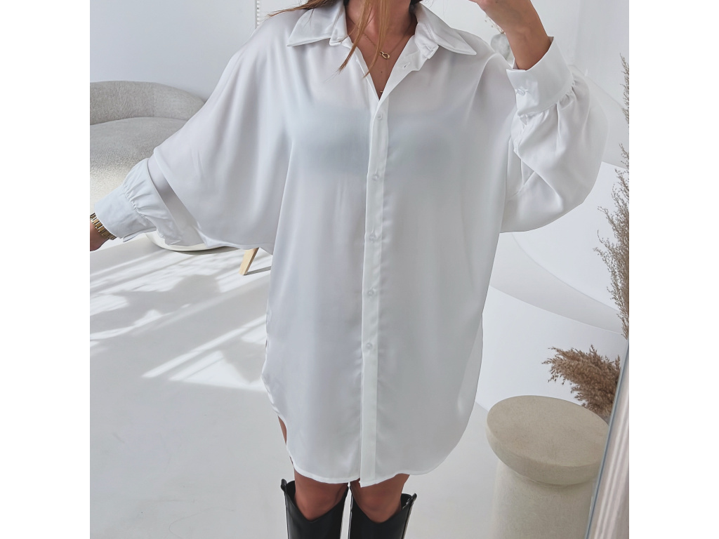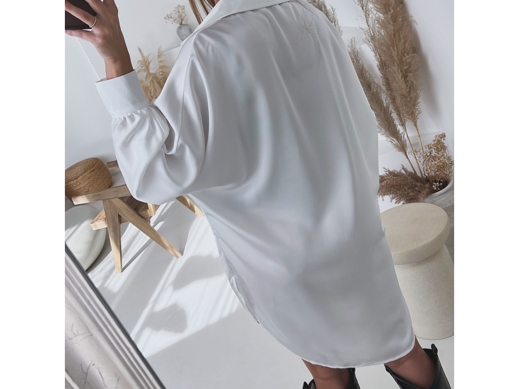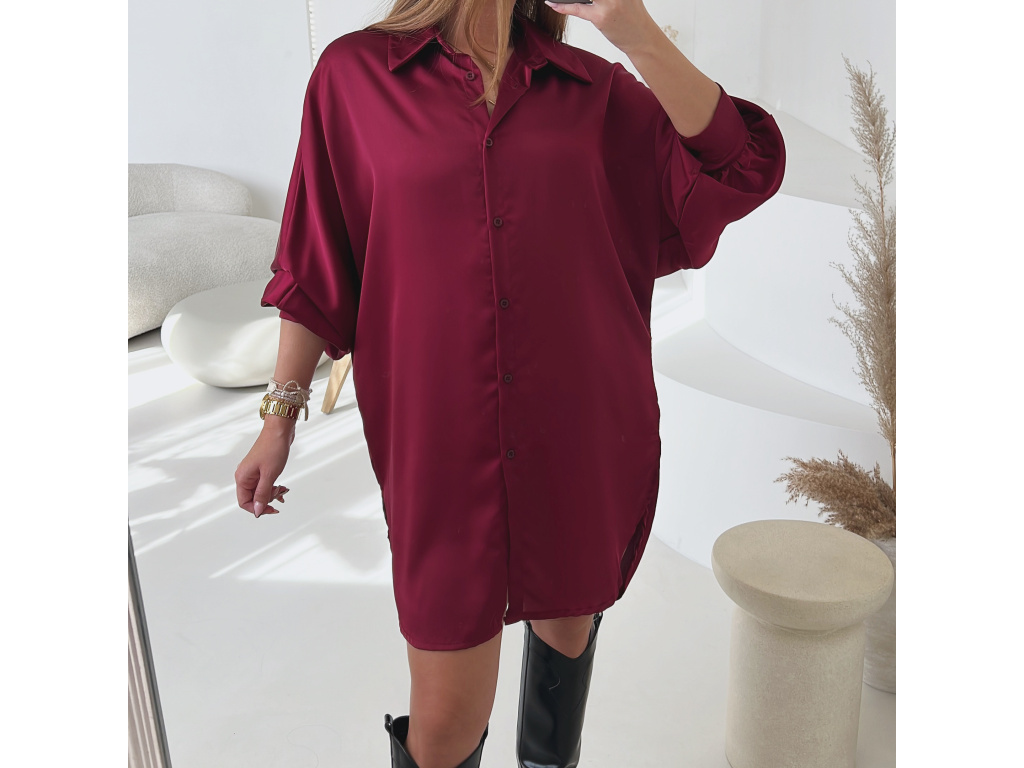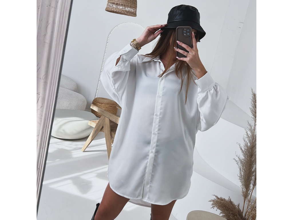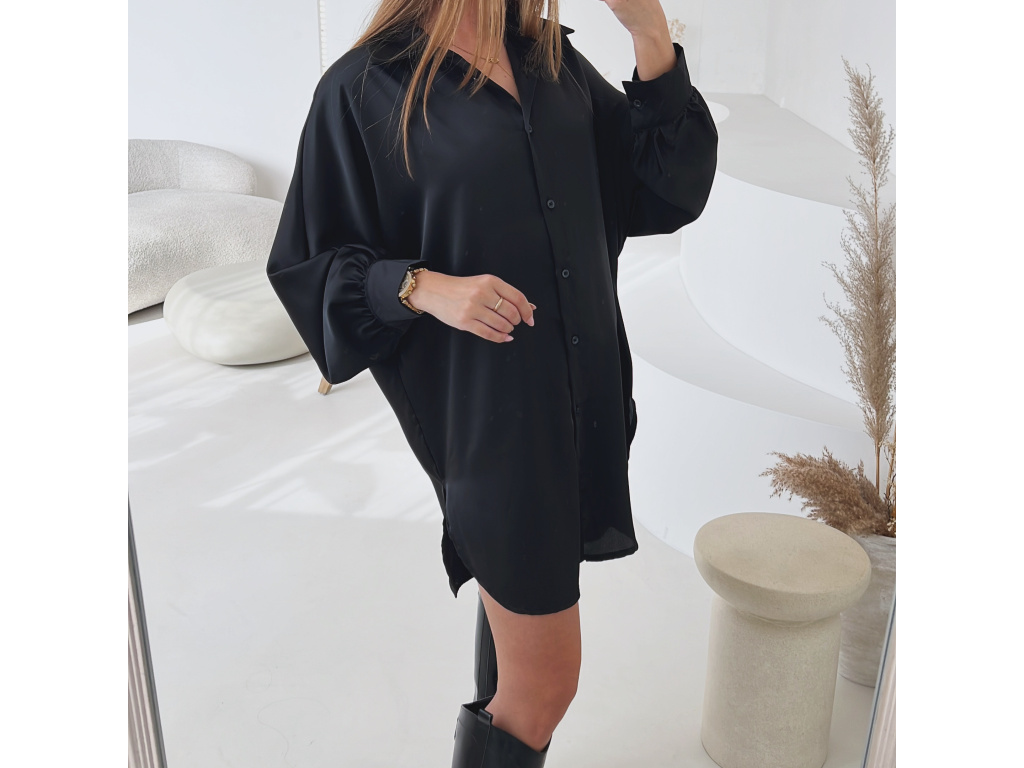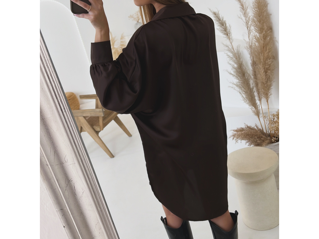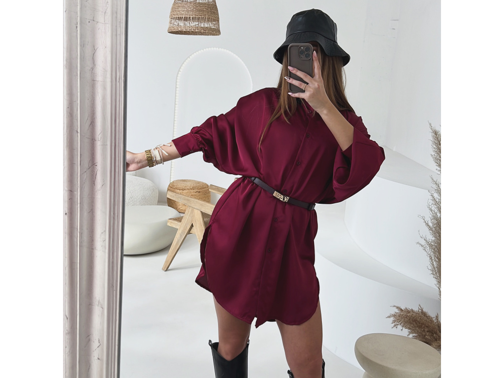 Elegantní prodloužená košile z jemného saténového materiálu, který působí luxusně a krásně splývá na postavě. Košile má volnější střih, dlouhý rukáv s manžetou a zapínání na knoflíky po celé délce. Díky své univerzálnosti ji můžeš nosit jako košili, šaty nebo vrstvený top – skvěle vypadá s páskem, který však není součástí balení (slouží pouze jako inspirace). Dostupná v několika elegantních barvách – černá, hnědá, bílá a vínová. Velikost je univerzální, sedí na XS - L.