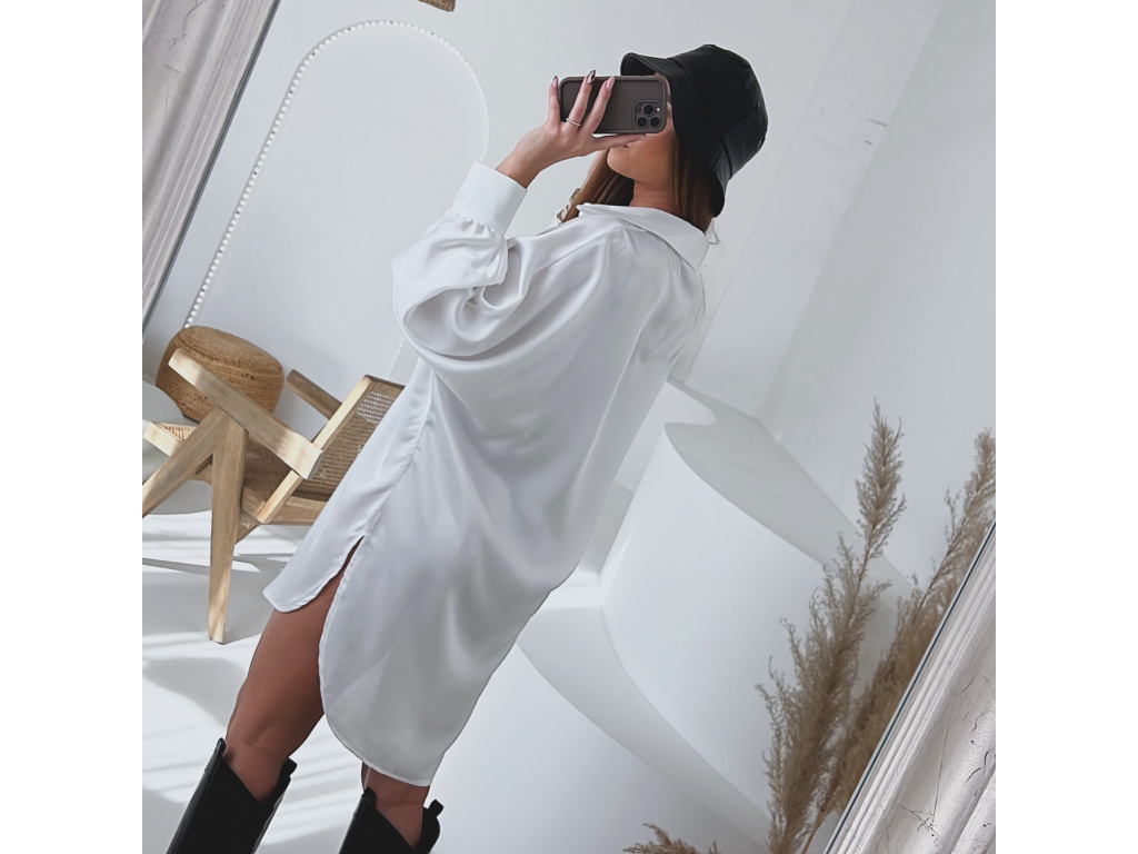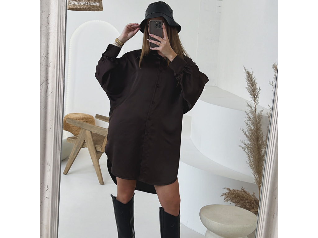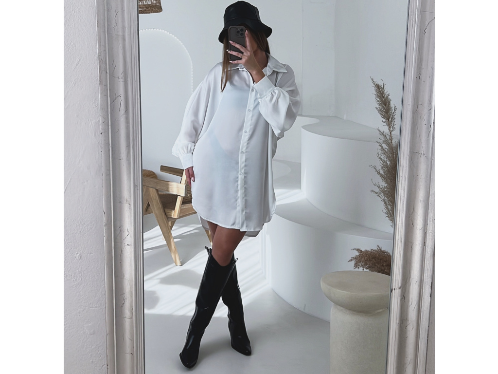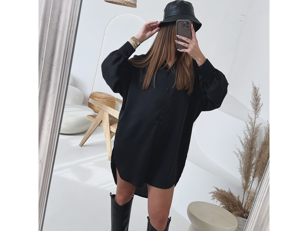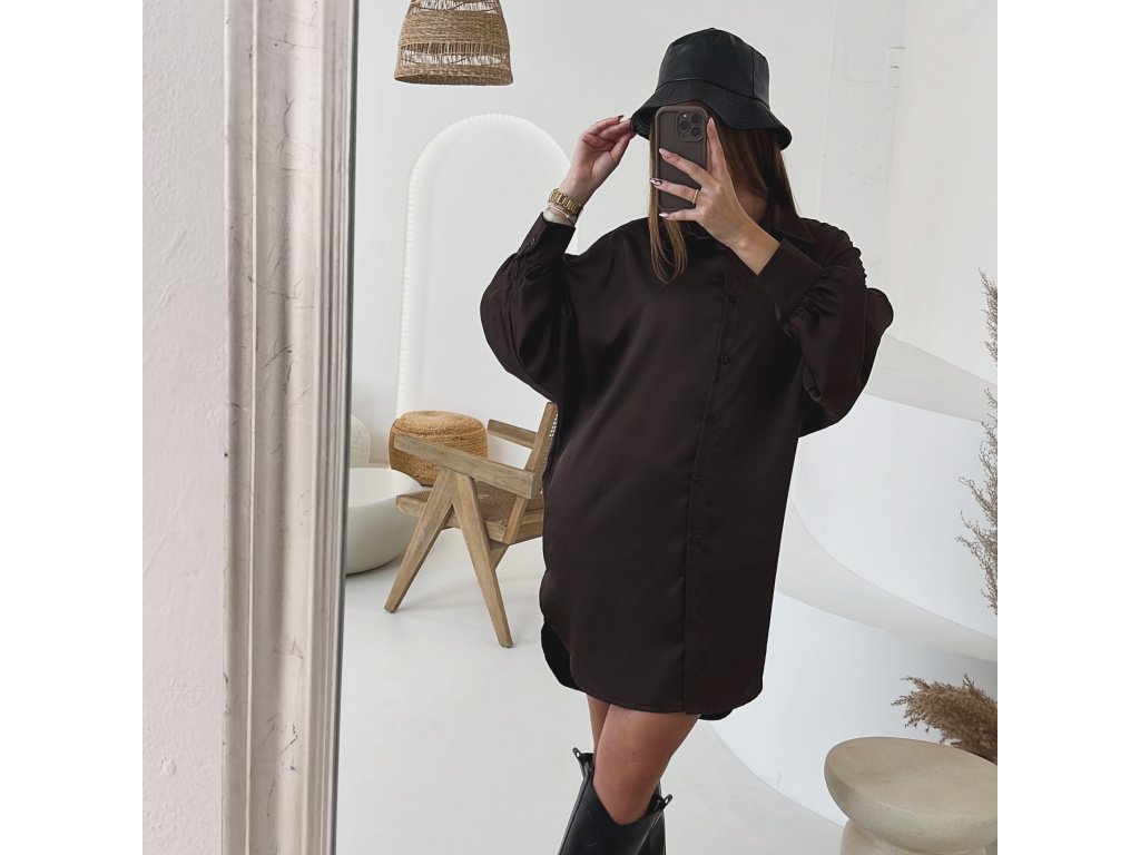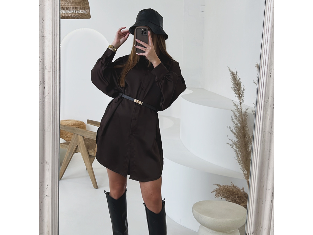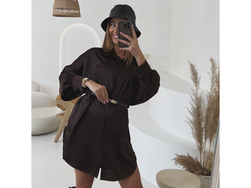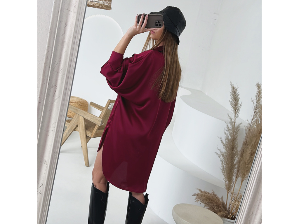 Elegantní prodloužená košile z jemného saténového materiálu, který působí luxusně a krásně splývá na postavě. Košile má volnější střih, dlouhý rukáv s manžetou a zapínání na knoflíky po celé délce. Díky své univerzálnosti ji můžeš nosit jako košili, šaty nebo vrstvený top – skvěle vypadá s páskem, který však není součástí balení (slouží pouze jako inspirace). Dostupná v několika elegantních barvách – černá, hnědá, bílá a vínová. Velikost je univerzální, sedí na XS - L.