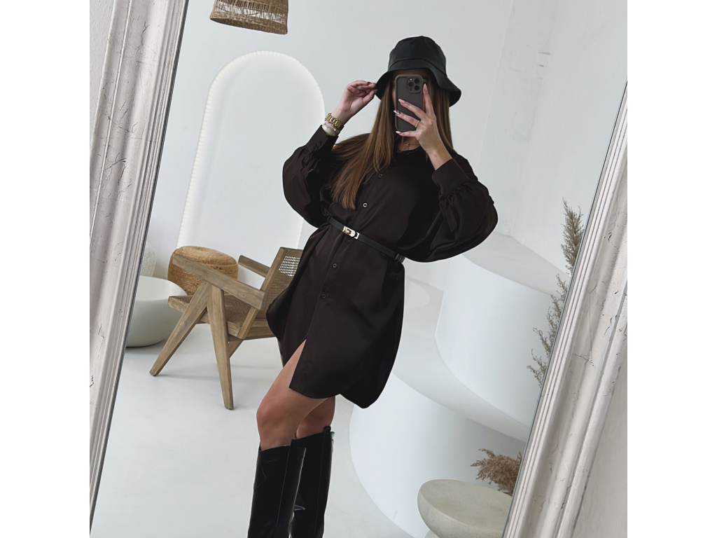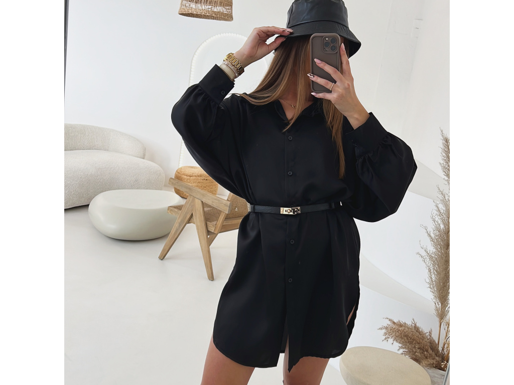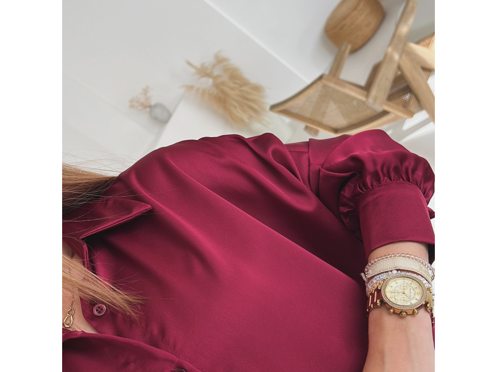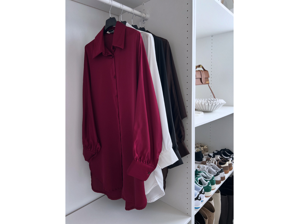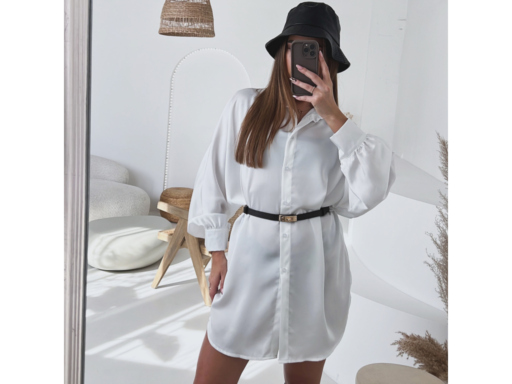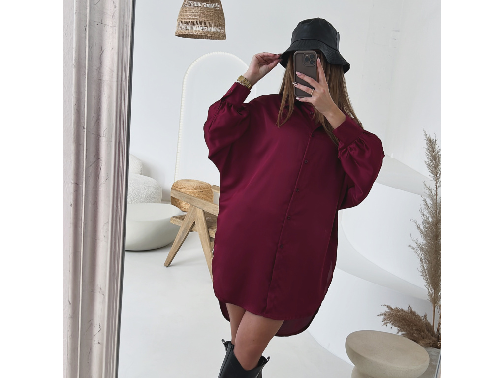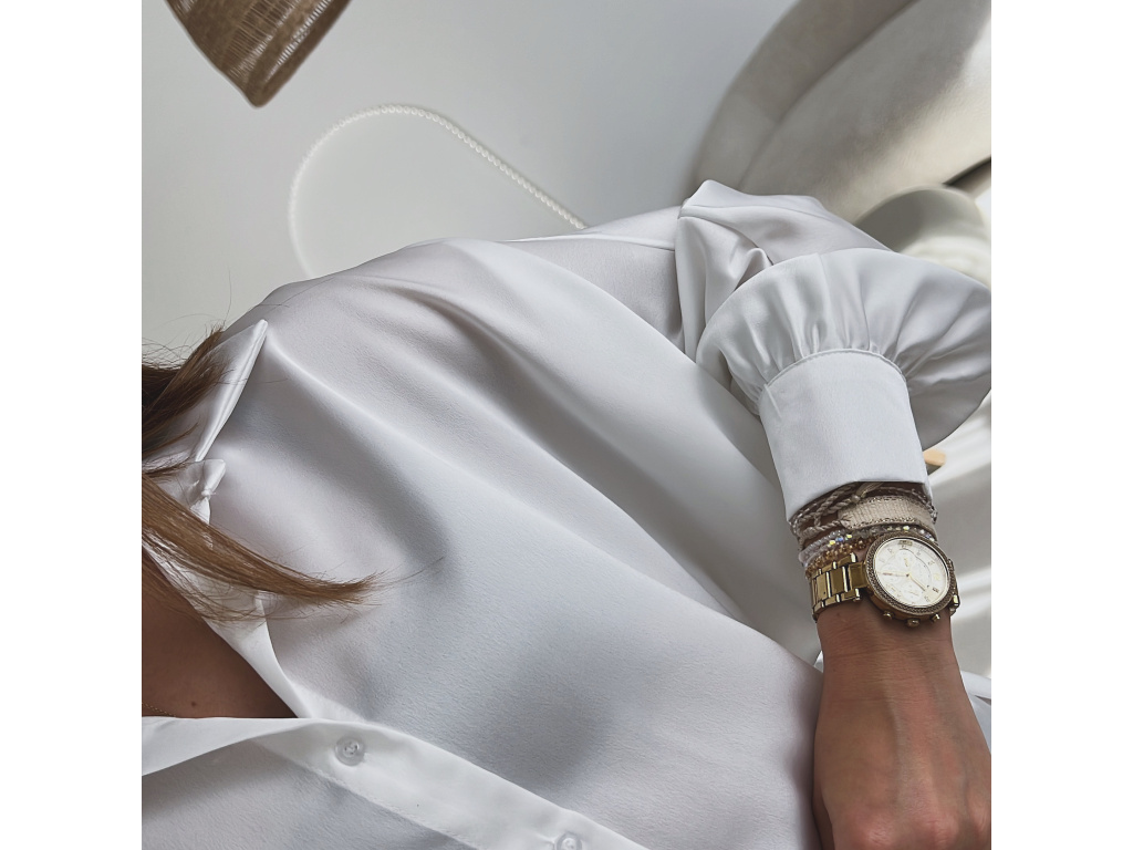 Elegantní prodloužená košile z jemného saténového materiálu, který působí luxusně a krásně splývá na postavě. Košile má volnější střih, dlouhý rukáv s manžetou a zapínání na knoflíky po celé délce. Díky své univerzálnosti ji můžeš nosit jako košili, šaty nebo vrstvený top – skvěle vypadá s páskem, který však není součástí balení (slouží pouze jako inspirace). Dostupná v několika elegantních barvách – černá, hnědá, bílá a vínová. Velikost je univerzální, sedí na XS - L.