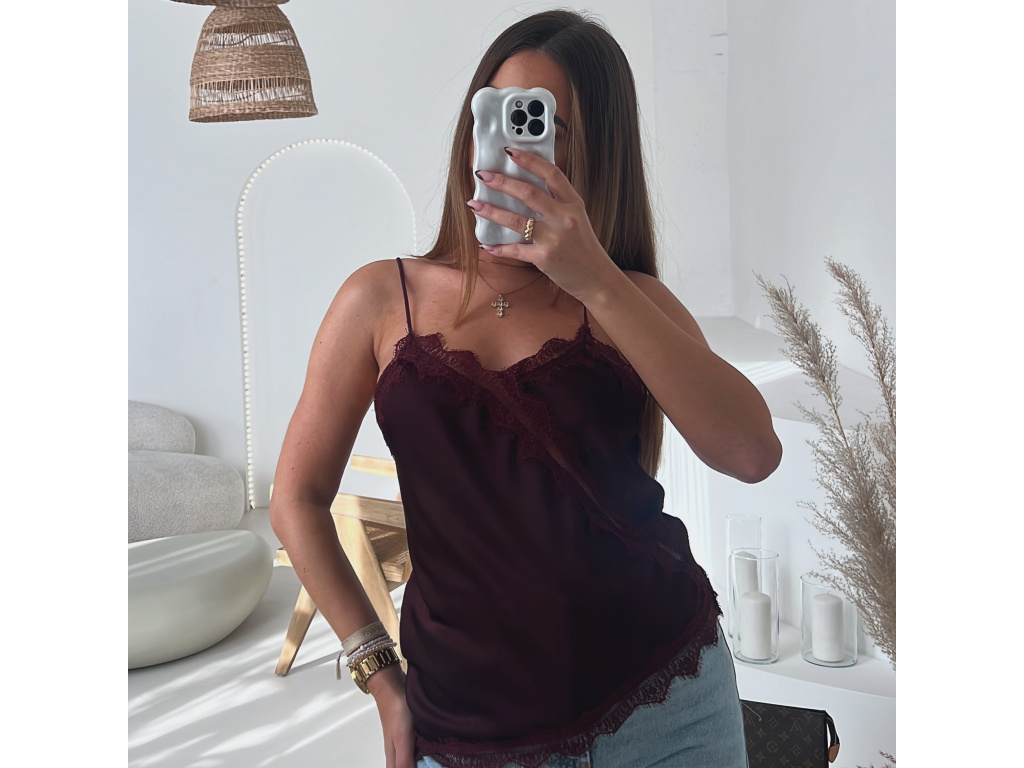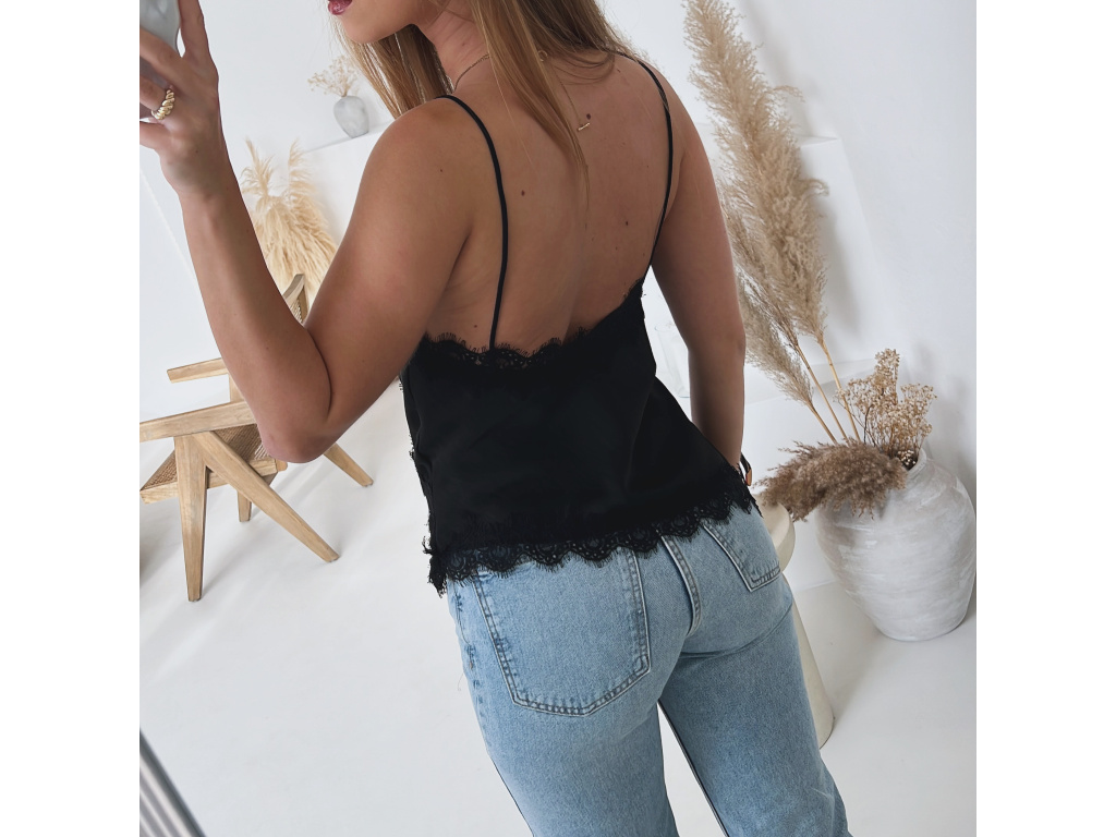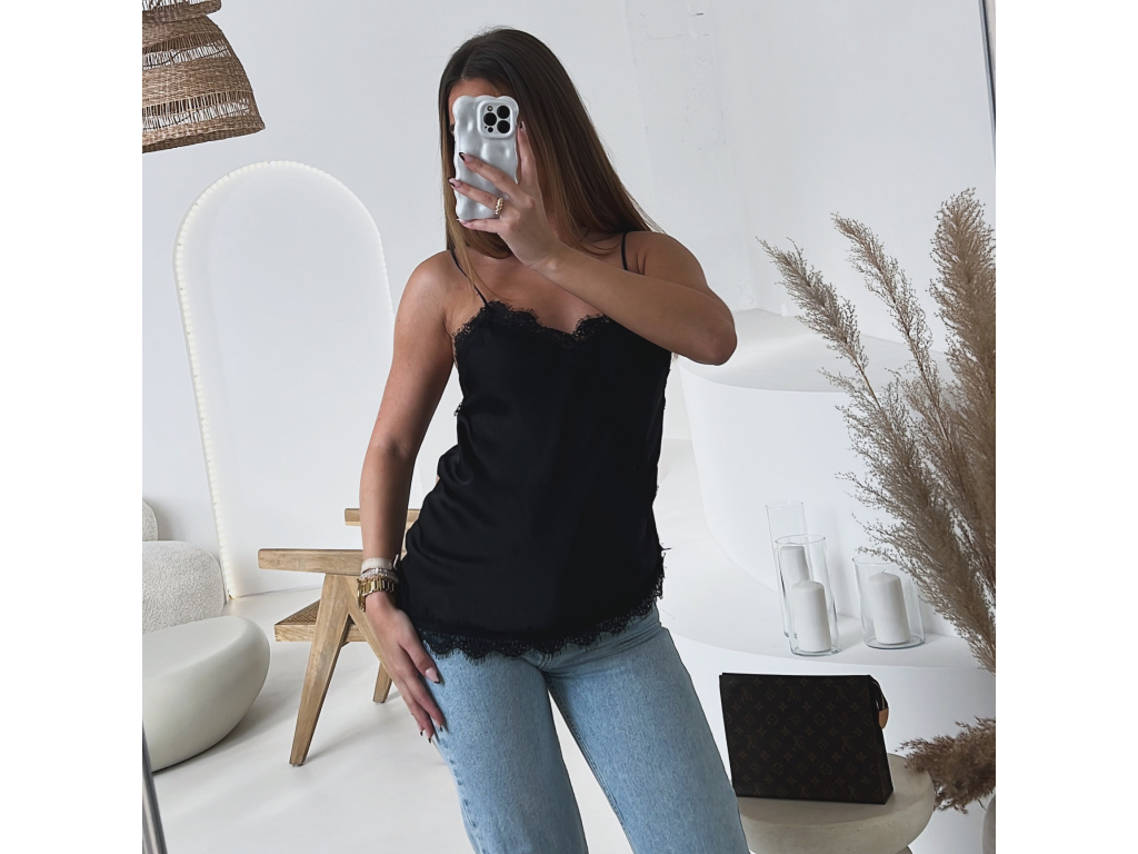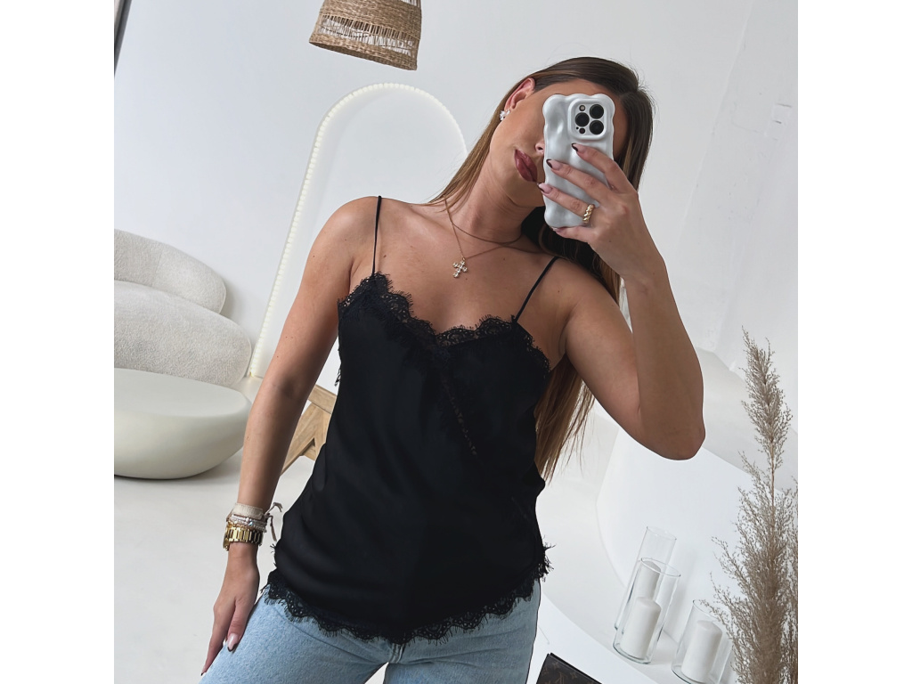Elegantní saténové tílko s jemnou krajkou je nadčasový kousek, který nesmí chybět v žádném šatníku. Díky špagetovým elastickým ramínkům a hlubokému výstřihu na zádech působí ženským a smyslným dojmem. Lehký saténový materiál je příjemný na těle a krásně se přizpůsobí postavě. Tílko má univerzální velikost, která sedí na XS–M.
