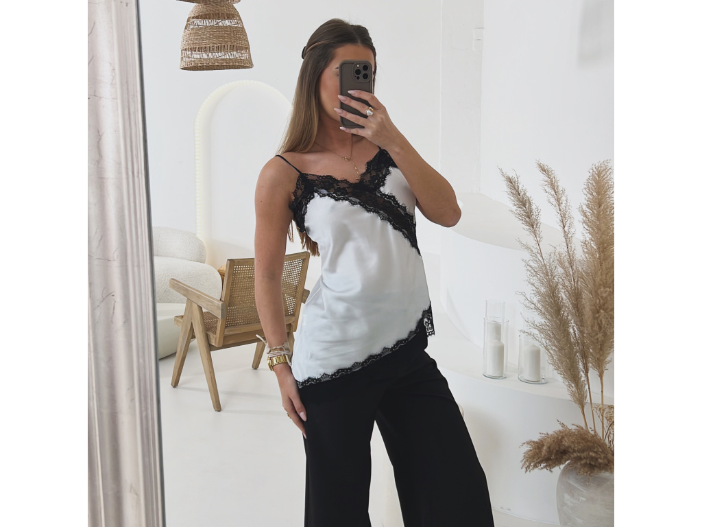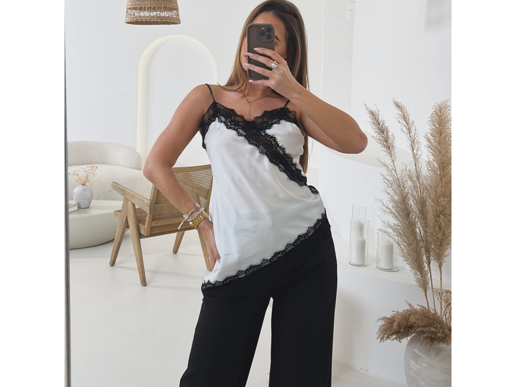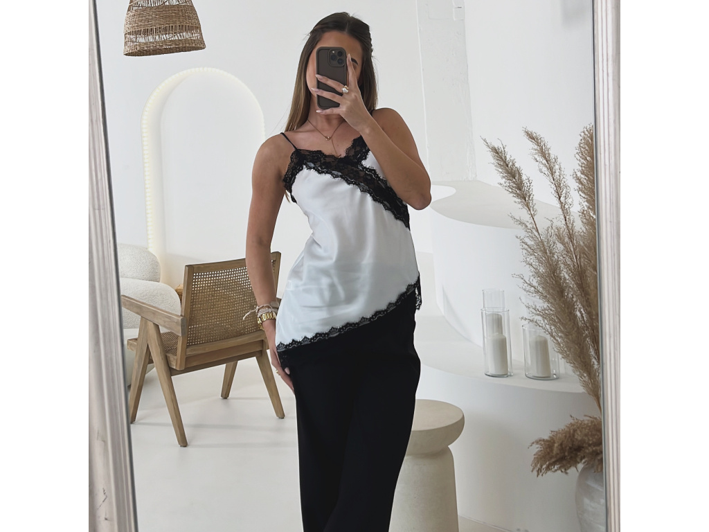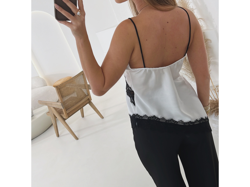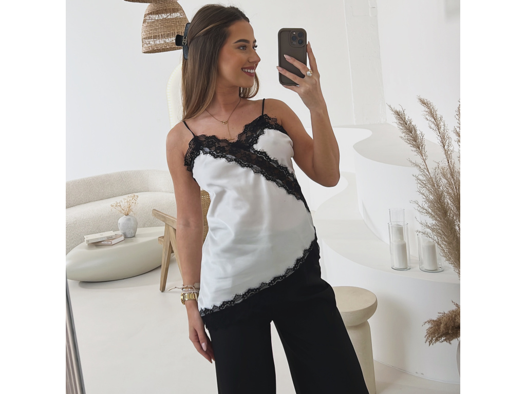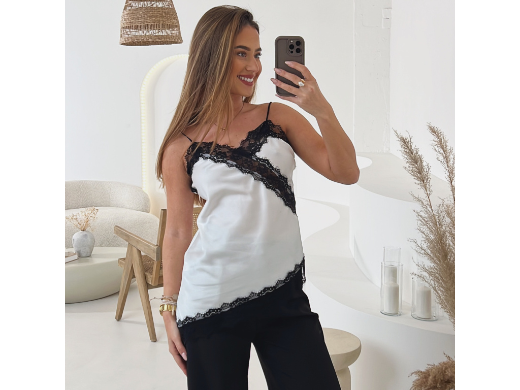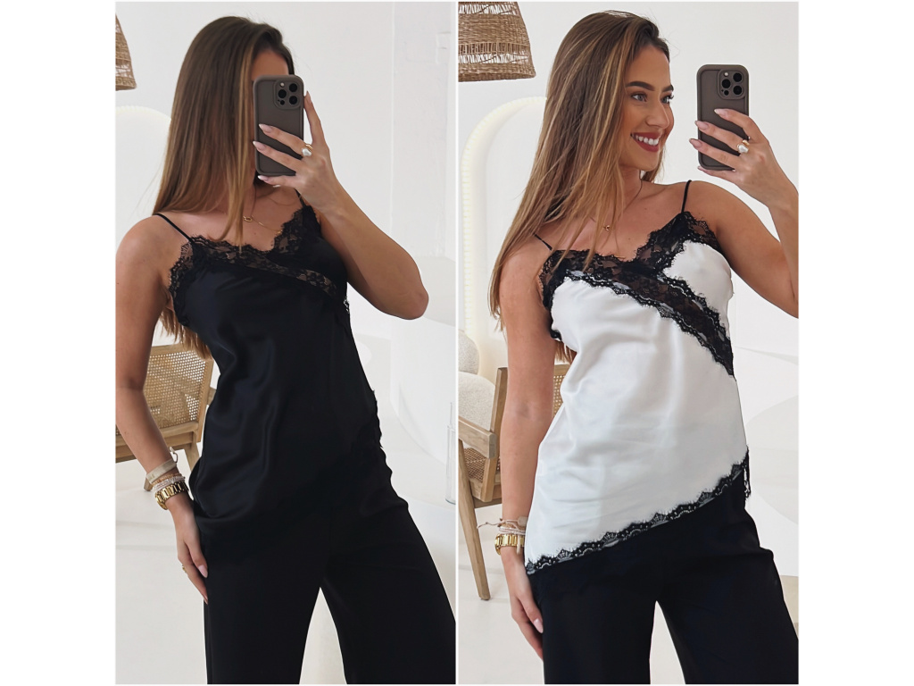 Elegantní saténový nátělník s jemnou krajkou, který dodá každému outfitu ženský a luxusní nádech. Má pružná špagetová ramínka pro maximální pohodlí a univerzální velikost, která krásně padne. Dostupný v černé a bílé variantě. Sedí na velikost XS - M.
