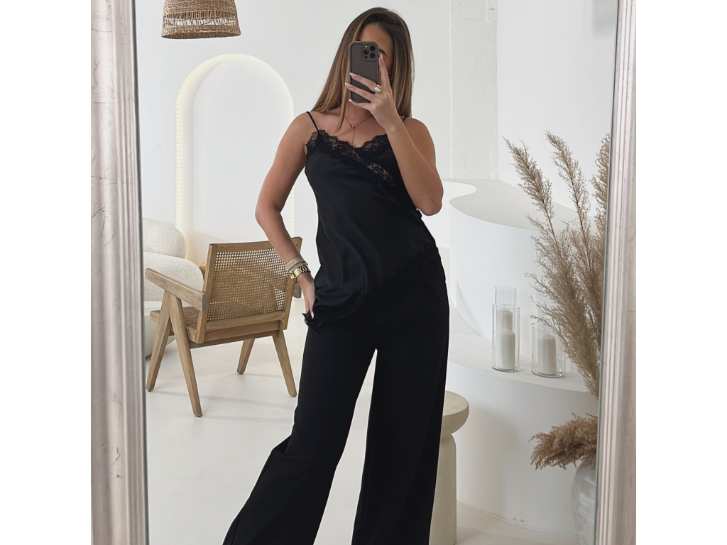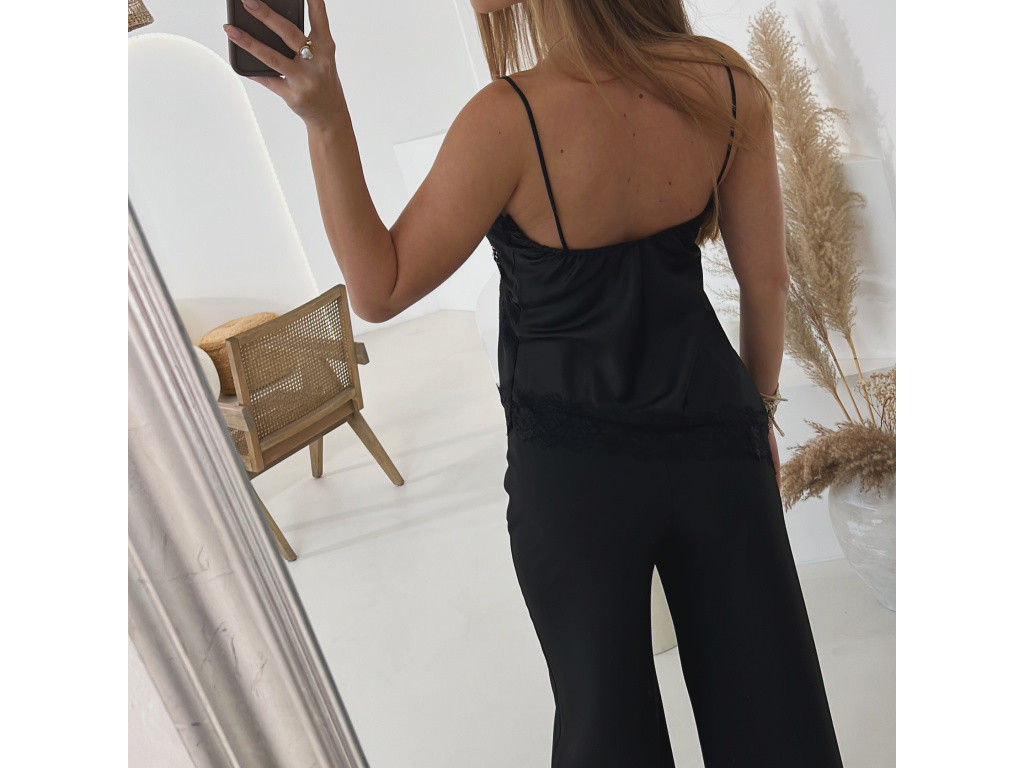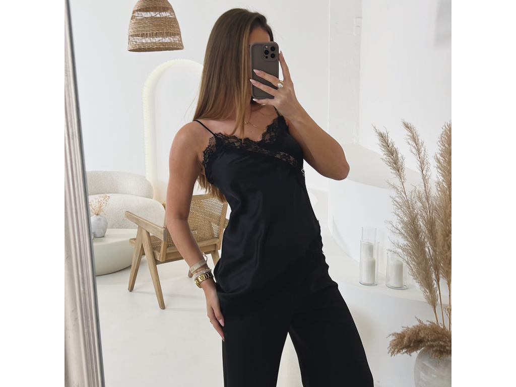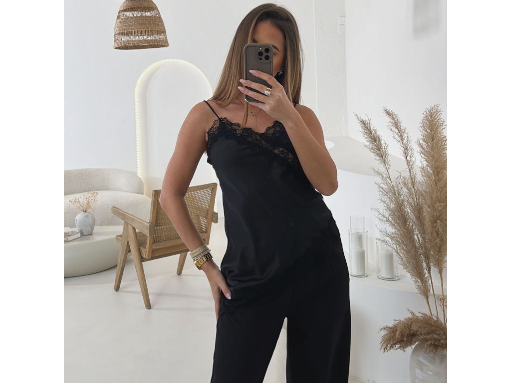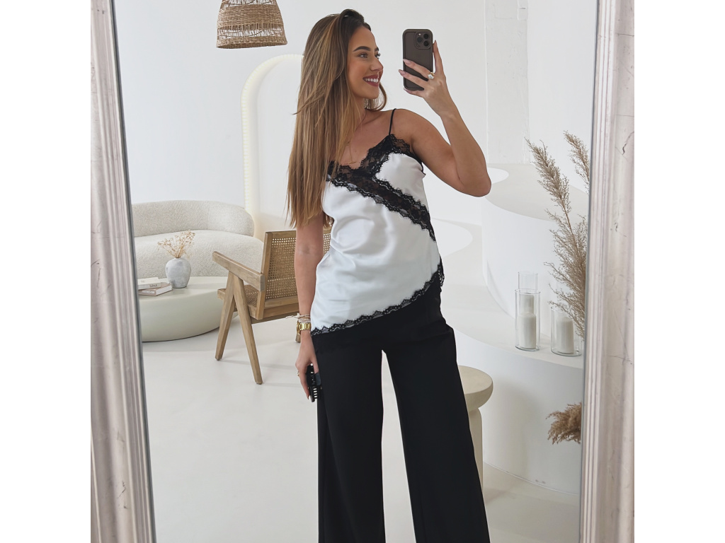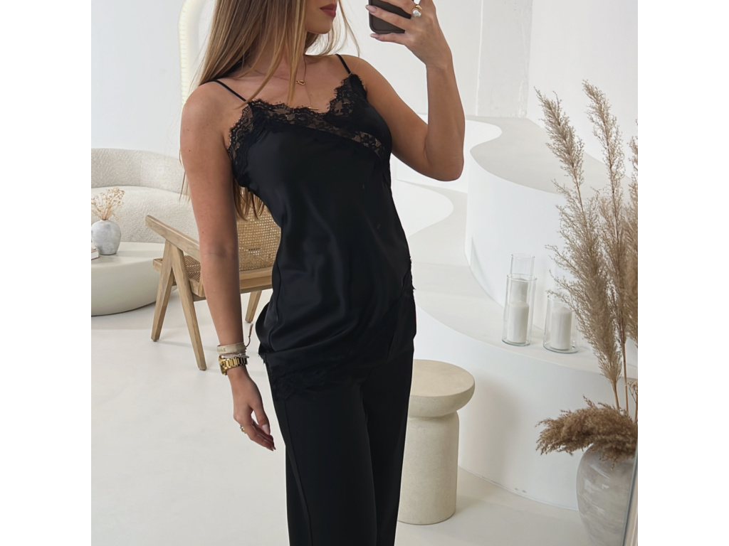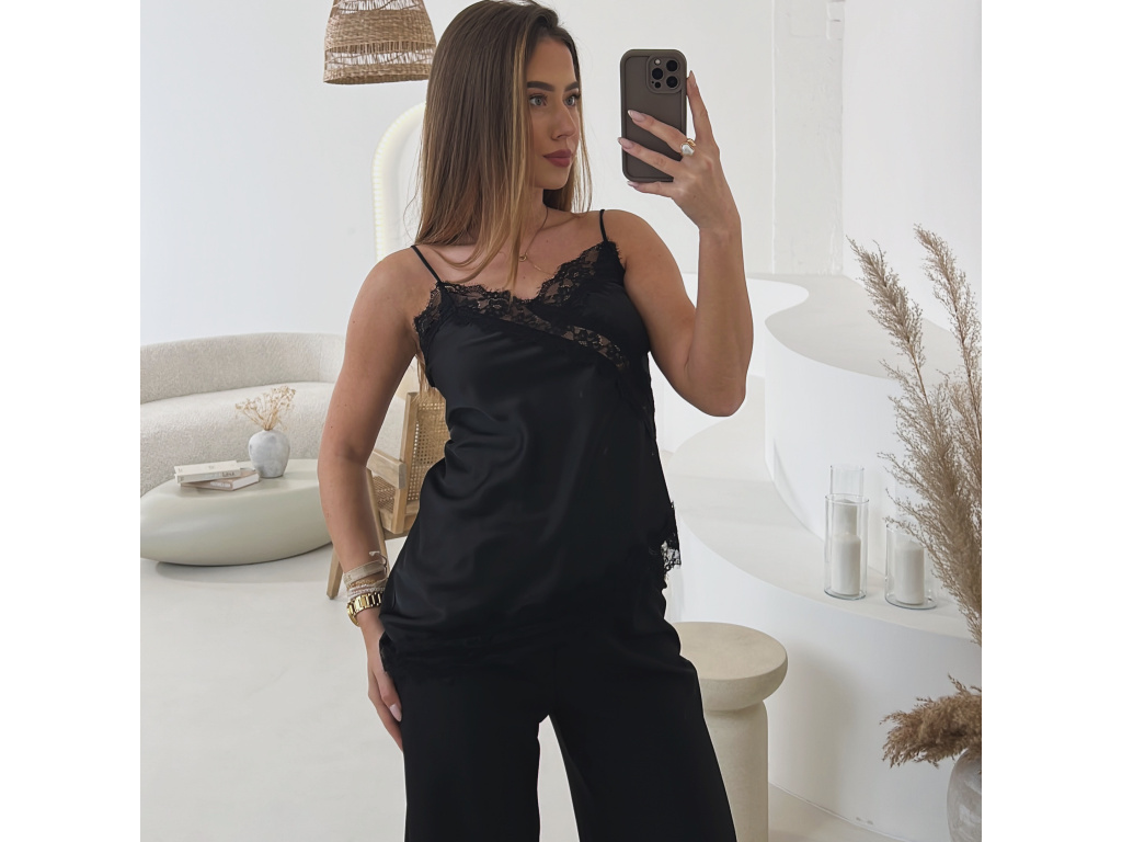 Elegantní saténový nátělník s jemnou krajkou, který dodá každému outfitu ženský a luxusní nádech. Má pružná špagetová ramínka pro maximální pohodlí a univerzální velikost, která krásně padne. Dostupný v černé a bílé variantě. Sedí na velikost XS - M.
