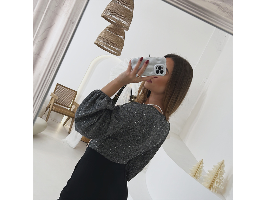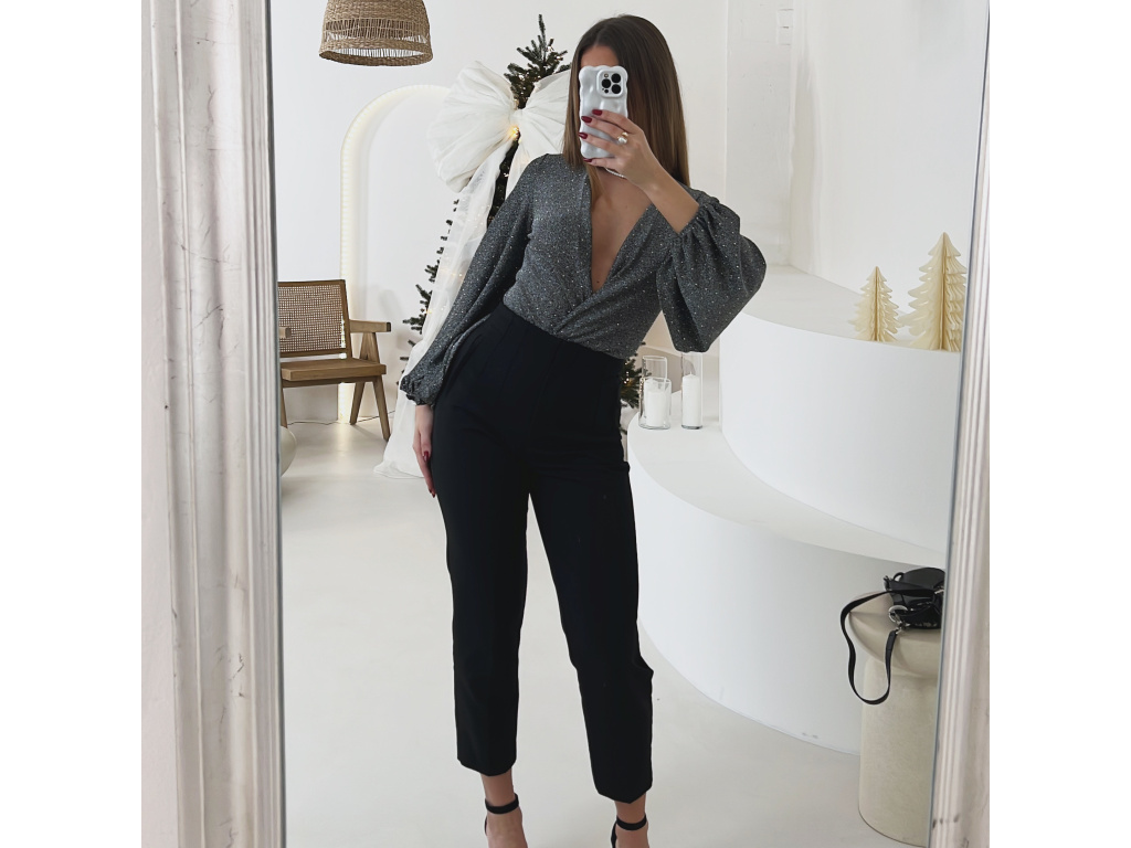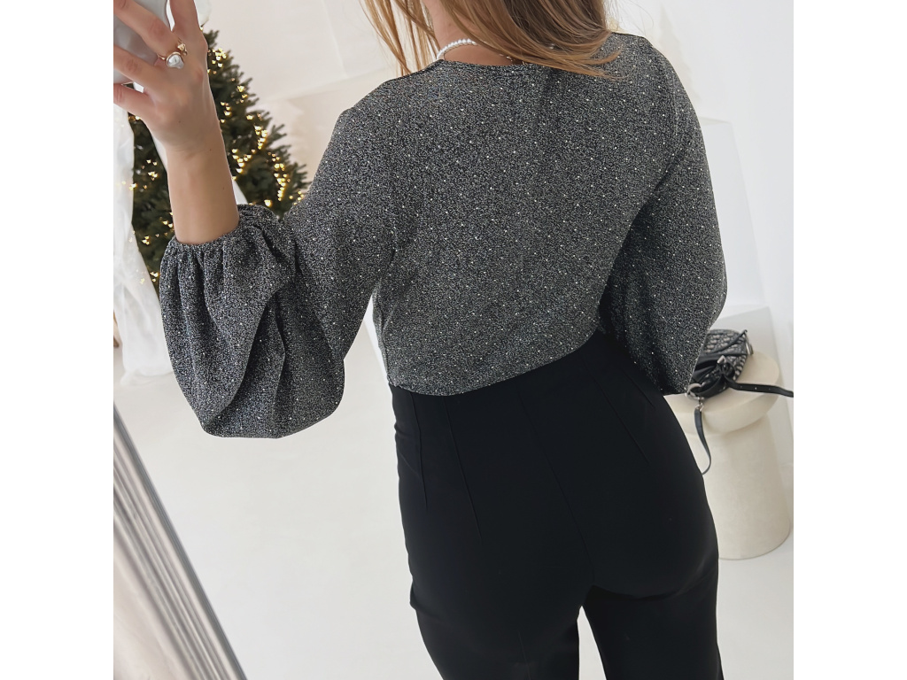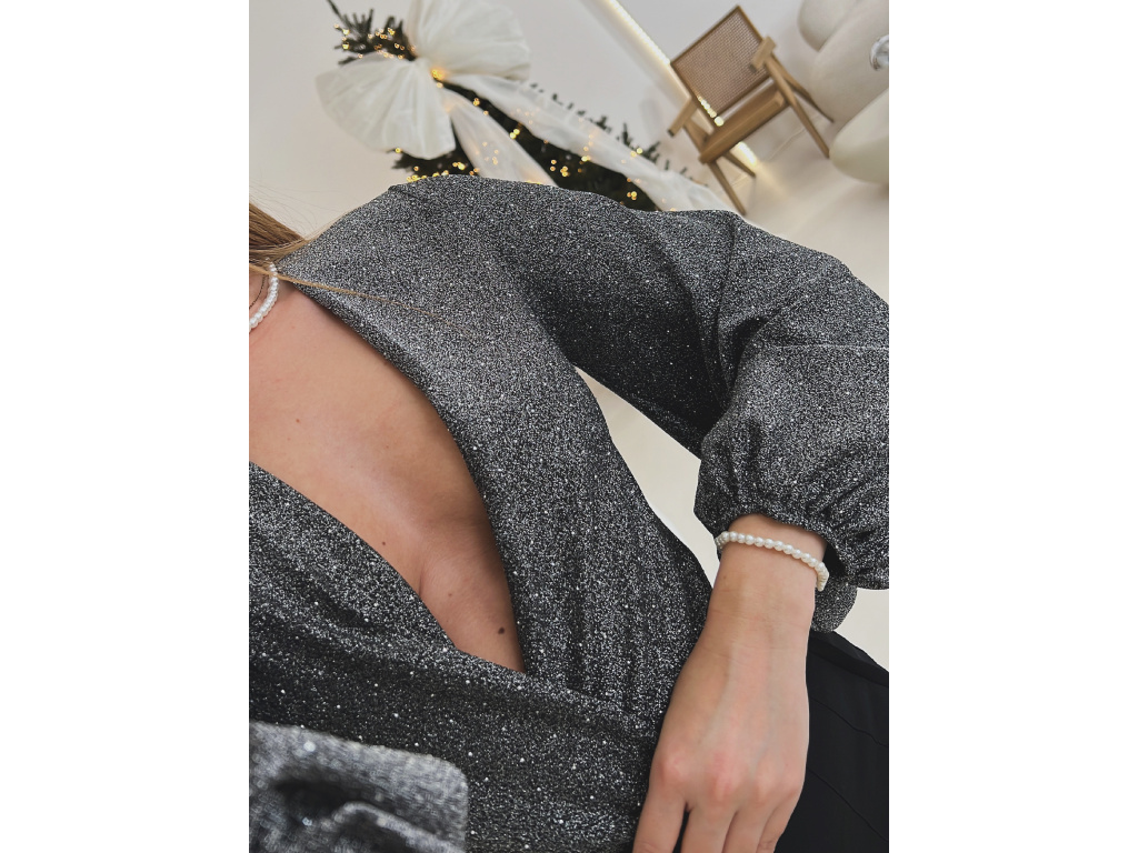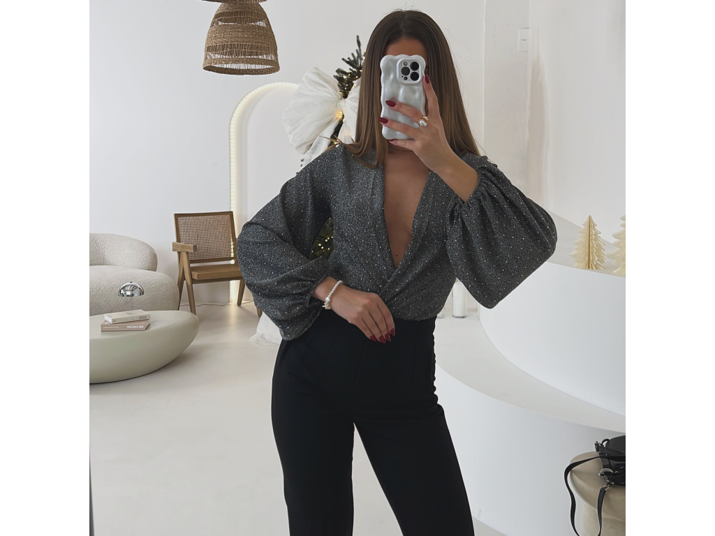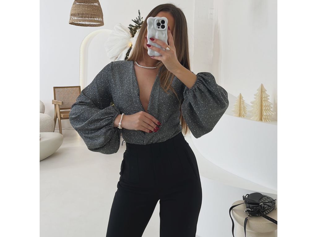 Toto elegantní a zároveň sexy body okouzlí hlubokým výstřihem a třpytivou stříbrnou nití, která dodává luxusní vzhled při každém pohybu. Rukávy jsou ve stylu balónového střihu a zakončené gumičkou pro pohodlné nošení. Ve spodní části se body zapíná na tři velikostně nastavitelné podprsenkové háčky, díky kterým perfektně sedí a drží tvar po celý večer. Ideální volba na večírky, oslavy i speciální příležitosti.