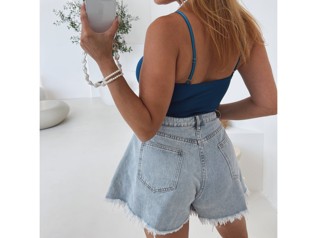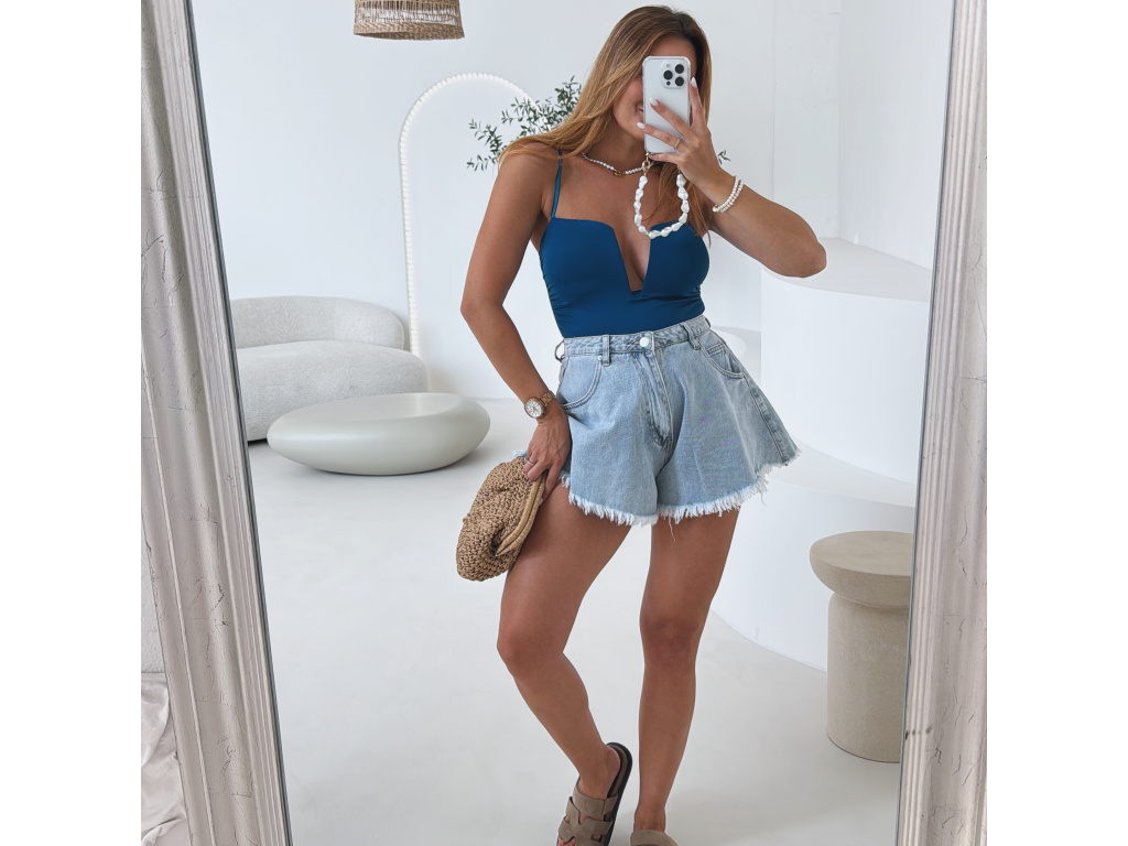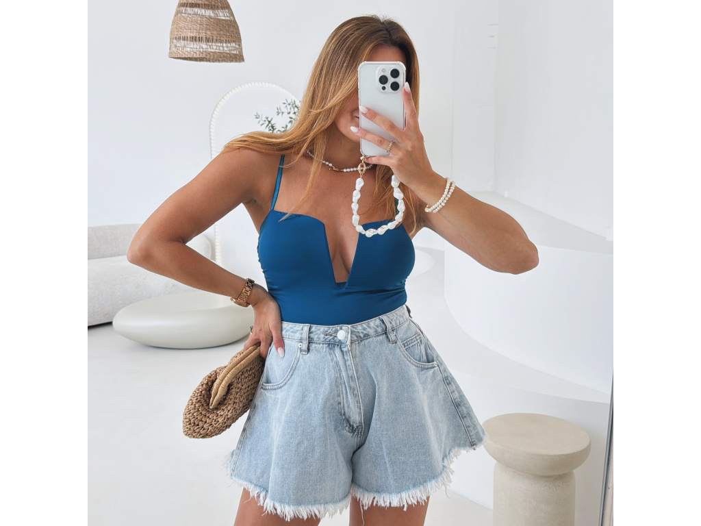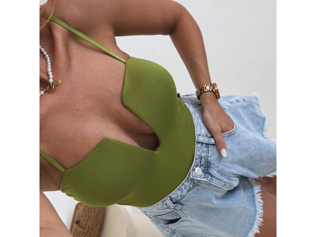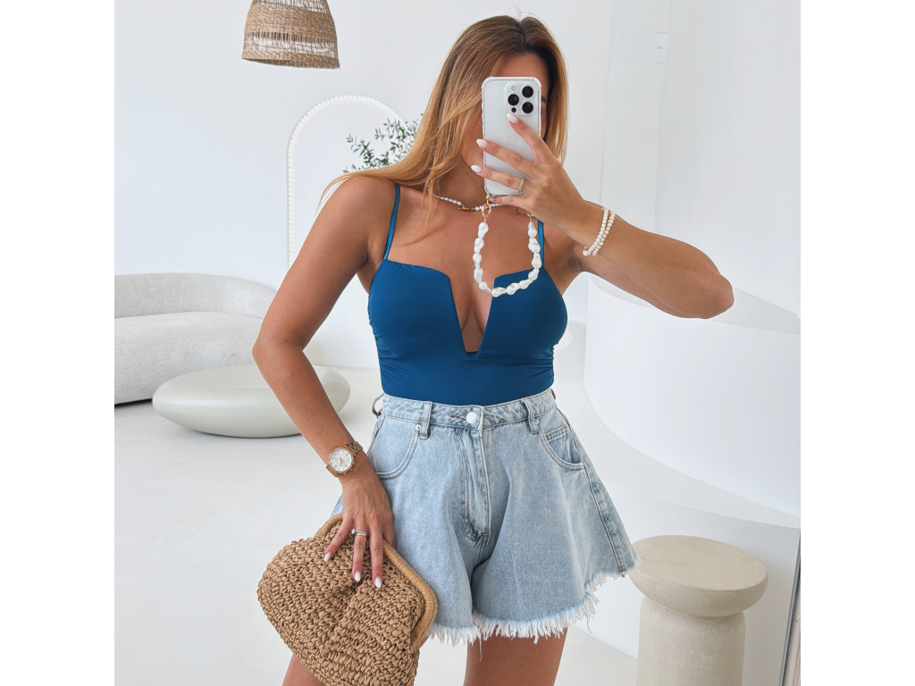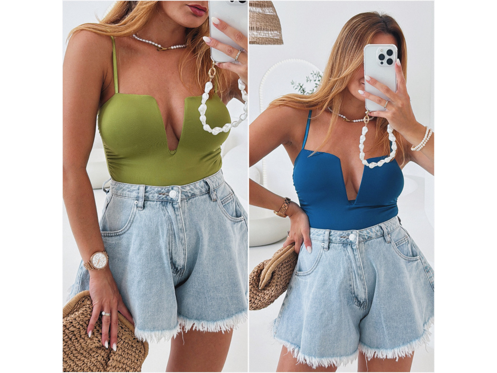 Smyslné body s výrazným výstřihem, které dokonale zvýrazní dekolt díky všité výztuži prsou. Vyrobené z pružného materiálu, krásně obepne postavu. Má posuvná nastavitelná ramínka a praktické zapínání ve spodní části na podprsenkové háčky. Perfektní volba pro odvážný look – samostatně i pod sako! Velikost je univerzální, sedí na XS,S a M.