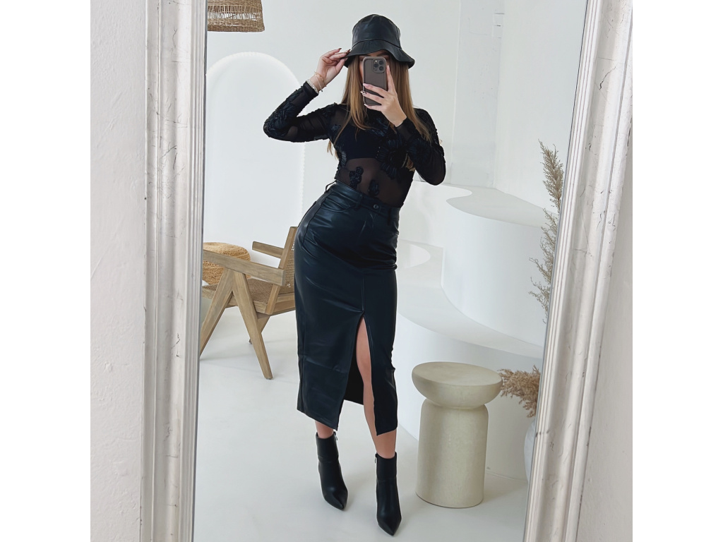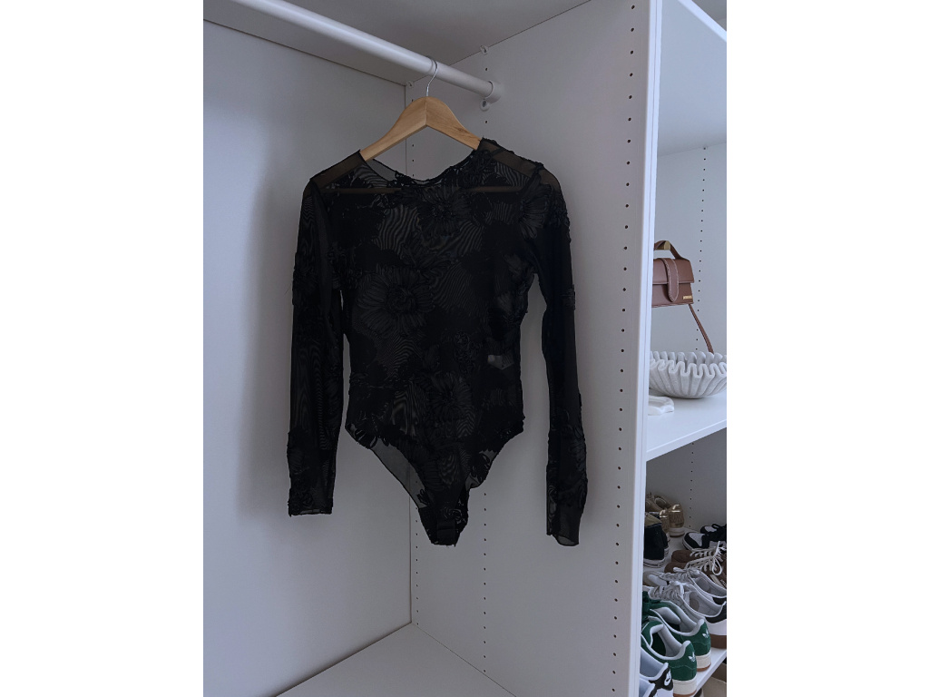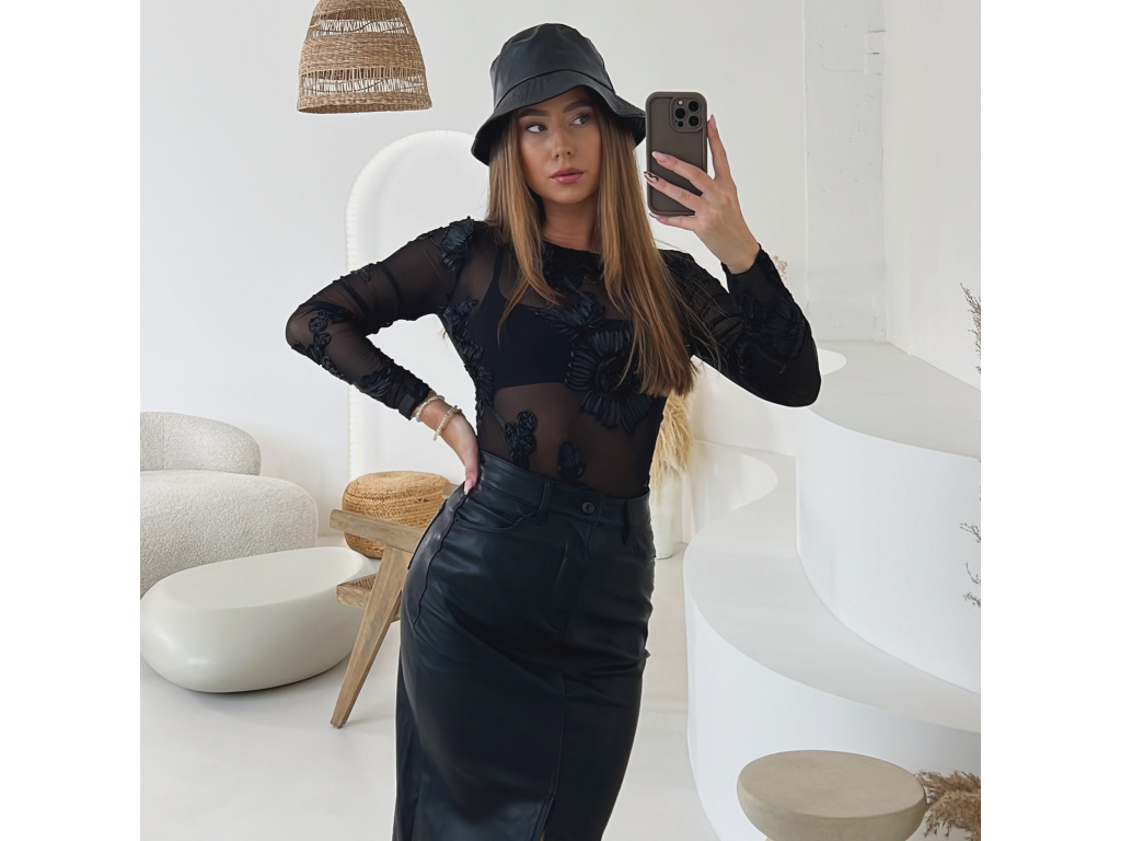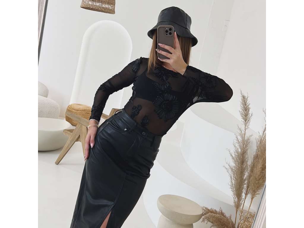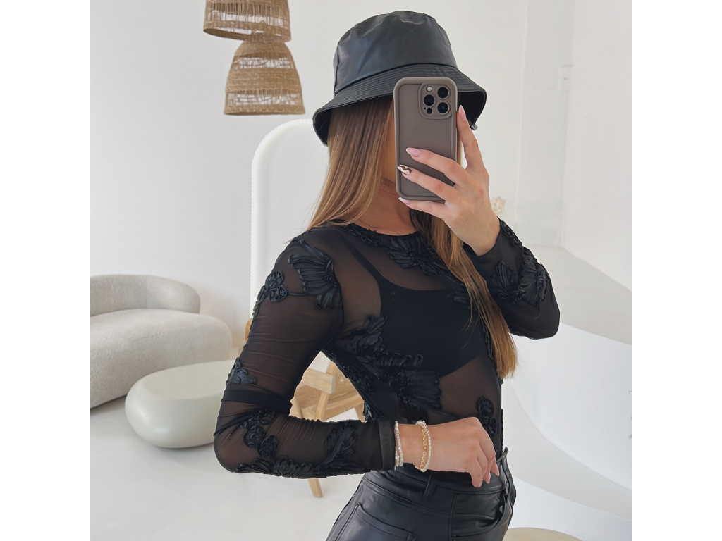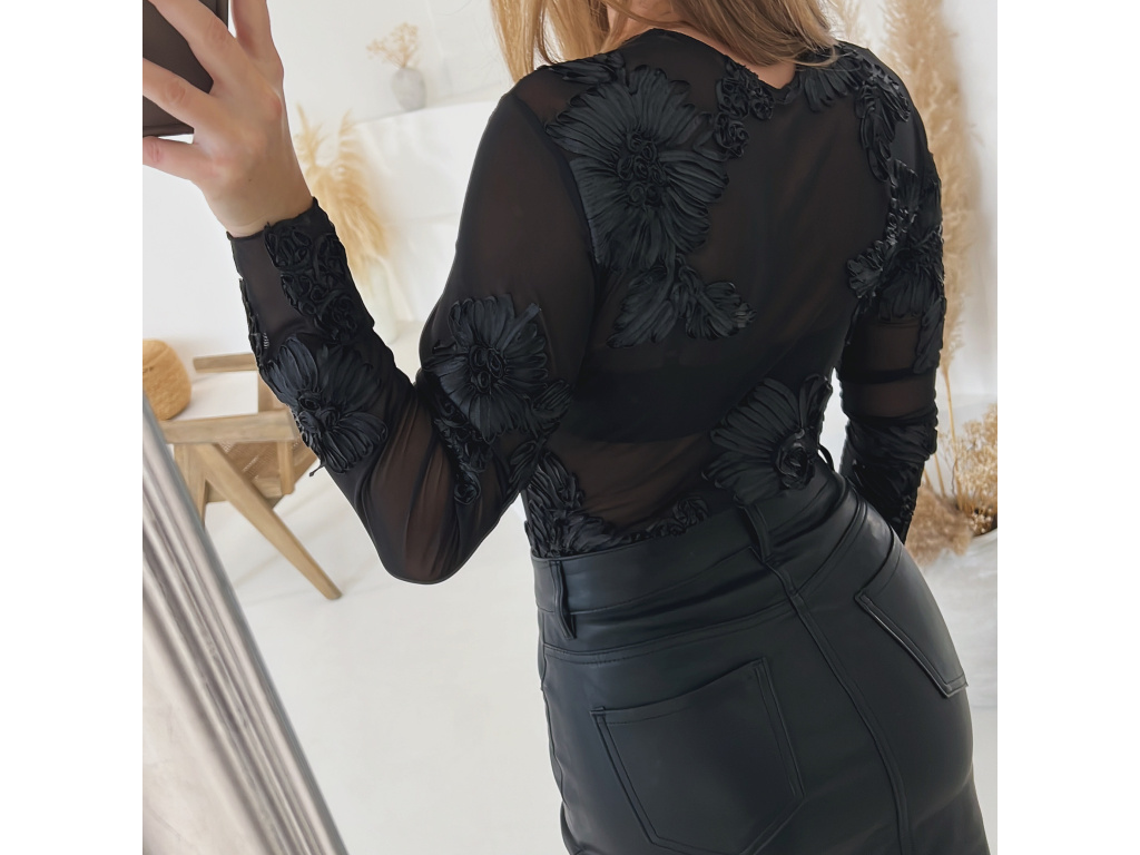 Okouzlující a svůdné černé body z jemného transparentního materiálu, zdobené 3D květinovou výšivkou po celé ploše. Díky elastickému provedení se krásně přizpůsobí postavě a vytváří elegantní ženskou siluetu. Ideální pro večerní look pod sako, nebo jako výrazný kousek k sukni či kalhotám z eko kůže. Velikost je univerzální, sedí na XS-M. Body se zapíná ve spodní části na podprsenkové háčky na 3 velikosti.