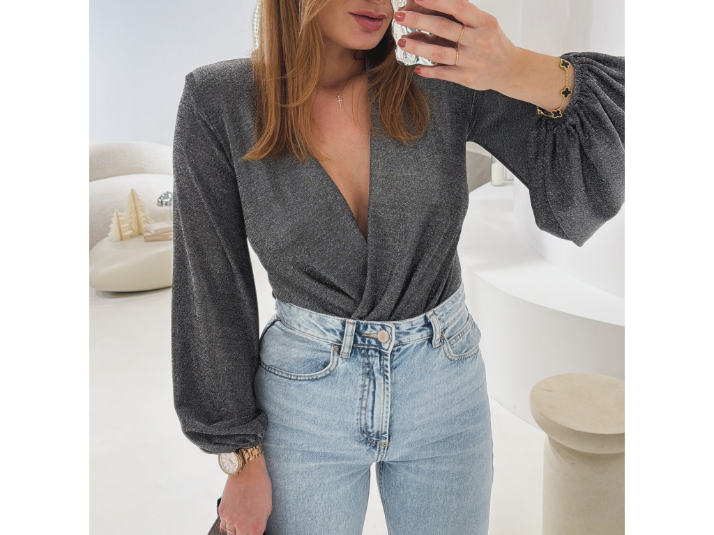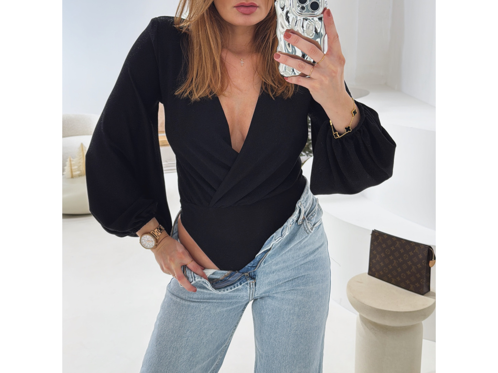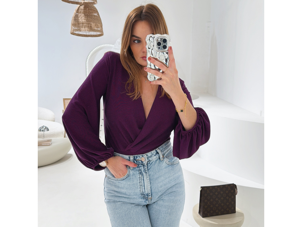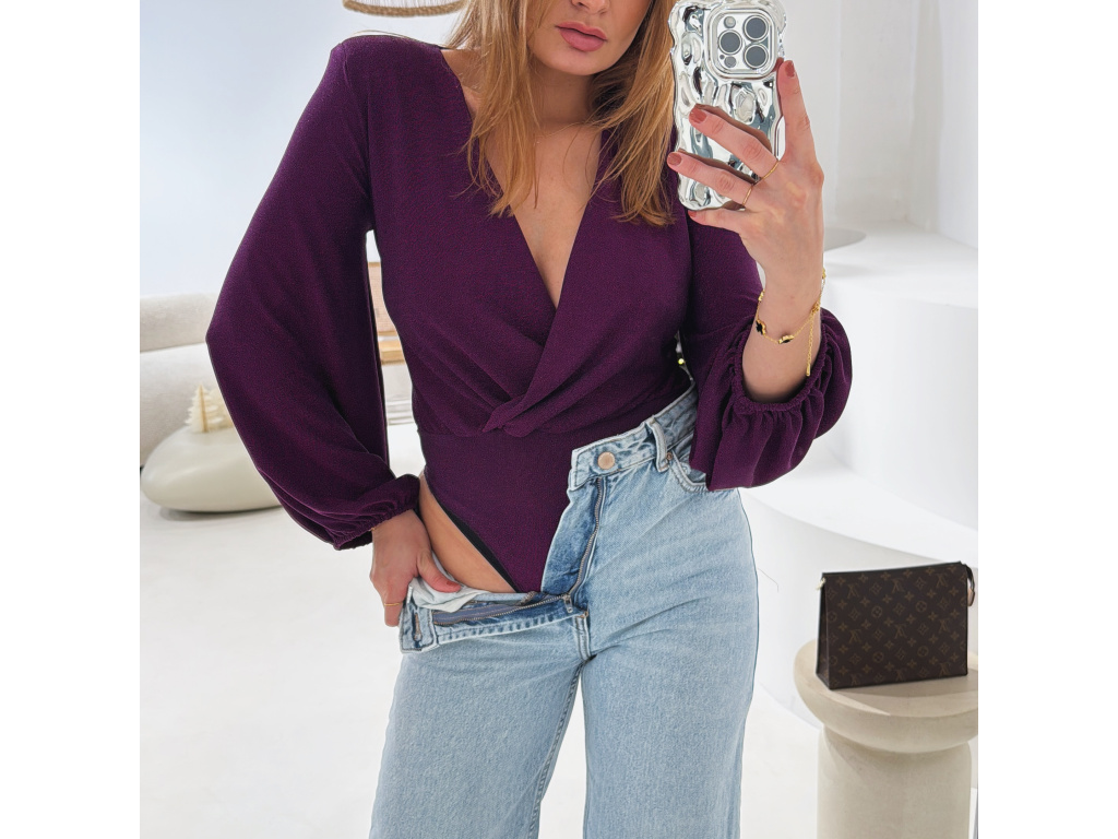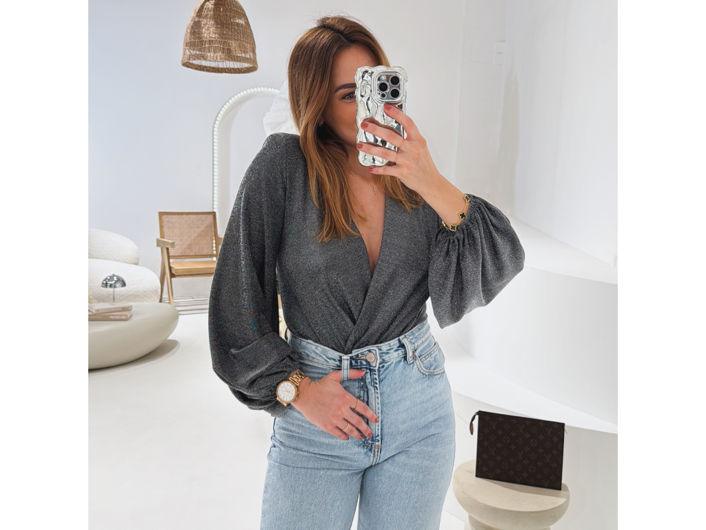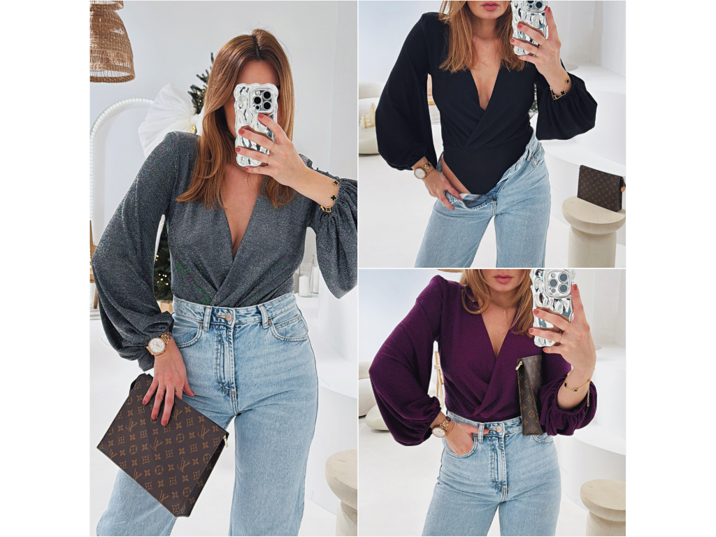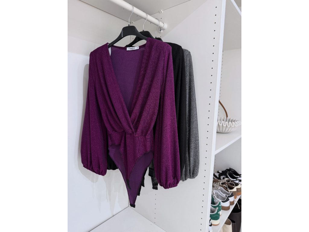 Stylové třpytivé body s rafinovaným překládaným výstřihem a výraznými balonovými rukávy, které dodají outfitu jedinečný šmrnc. Ve spodní části má praktické zapínání na háčky pro pohodlné nošení. Dostupné ve fialové, stříbrné a černé barvě ve velikostech S, M a L — ideální volba na večerní události i slavnostní příležitosti.