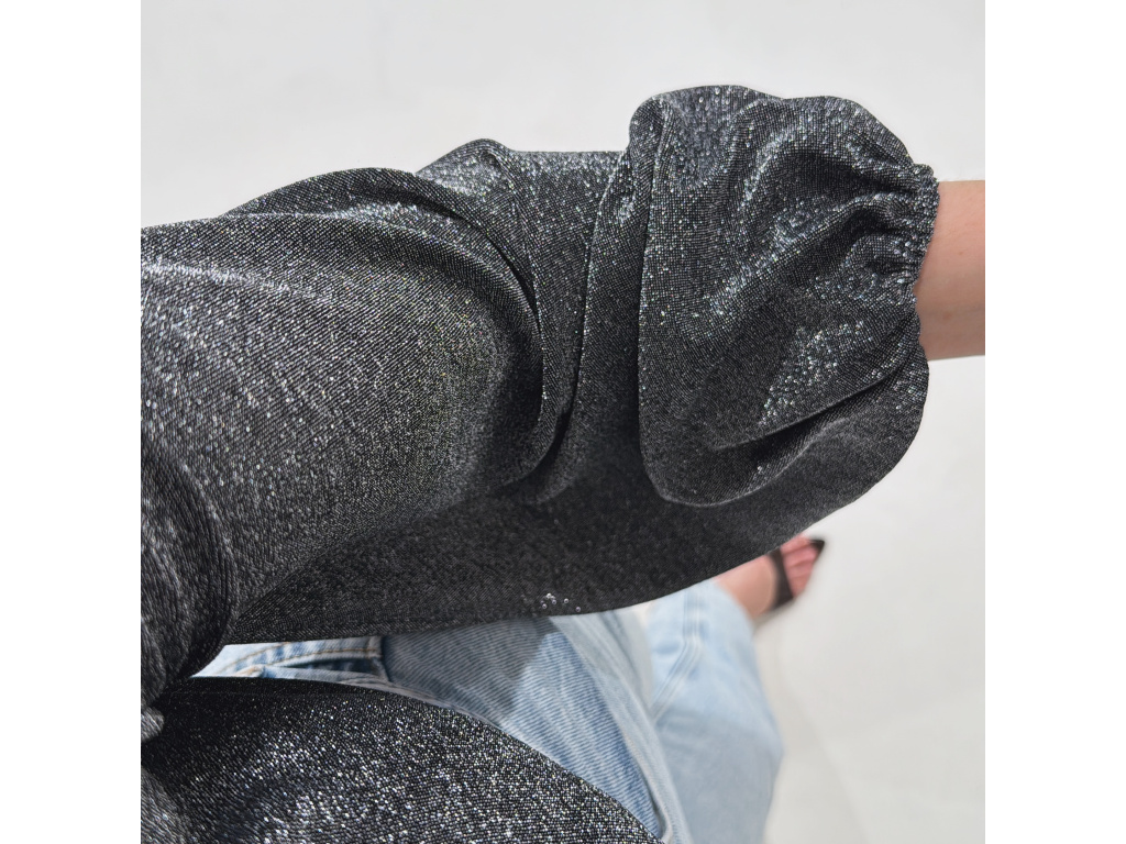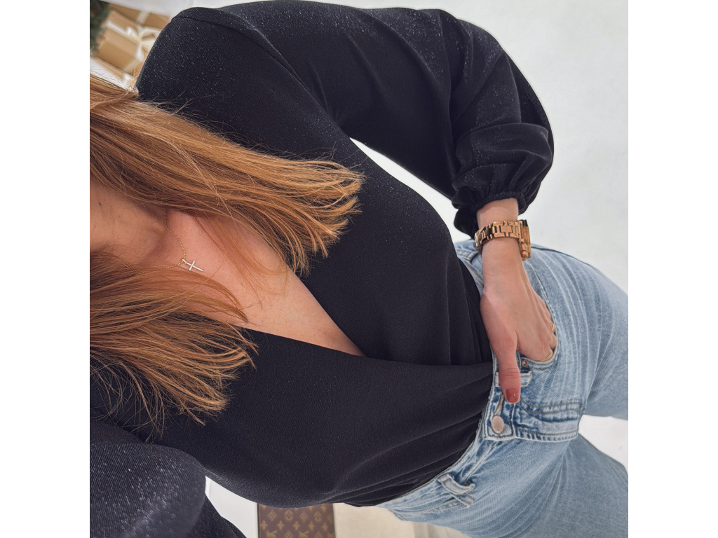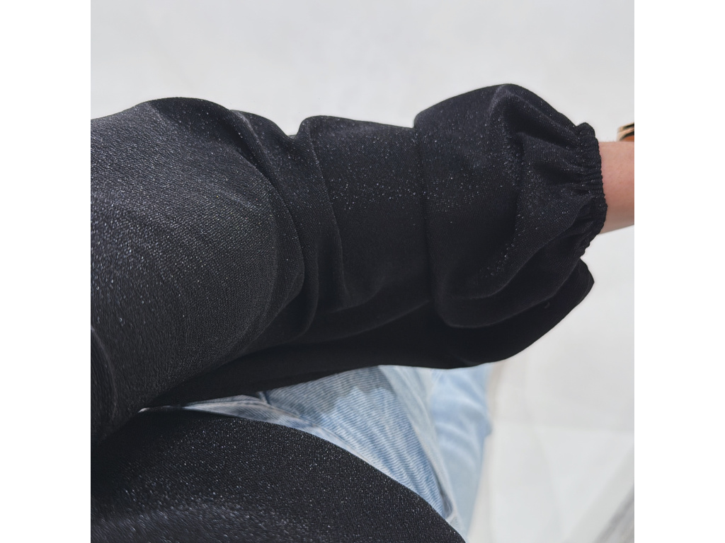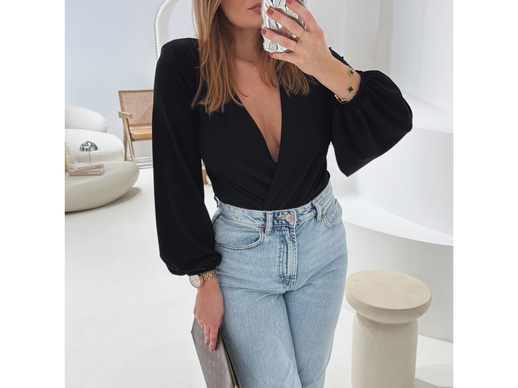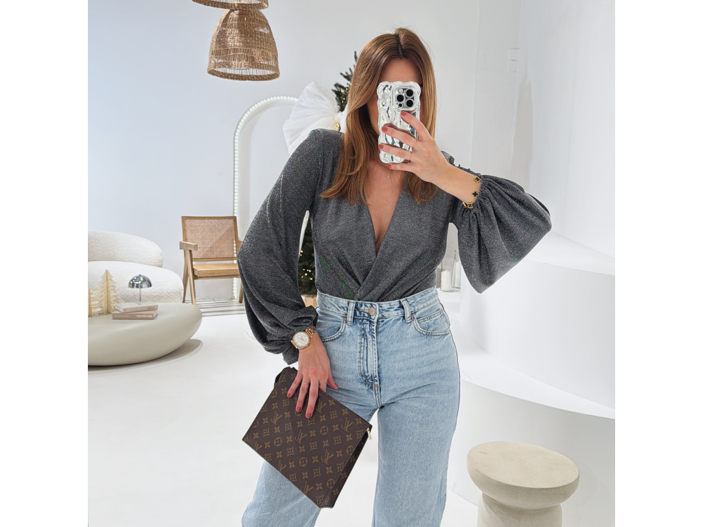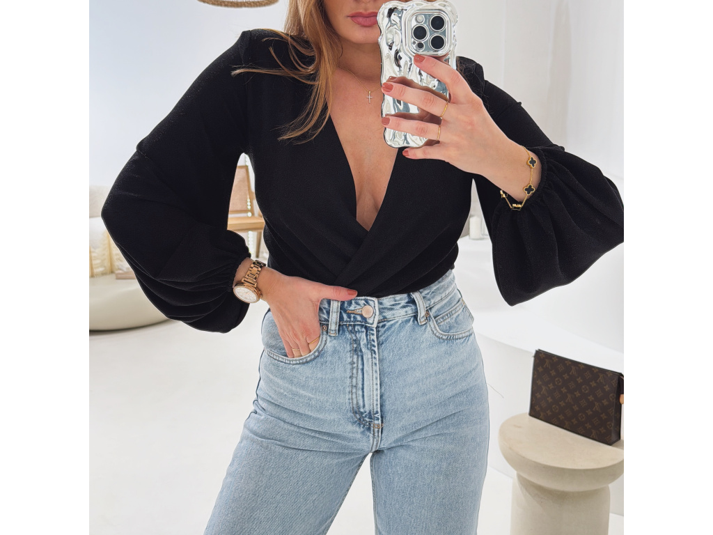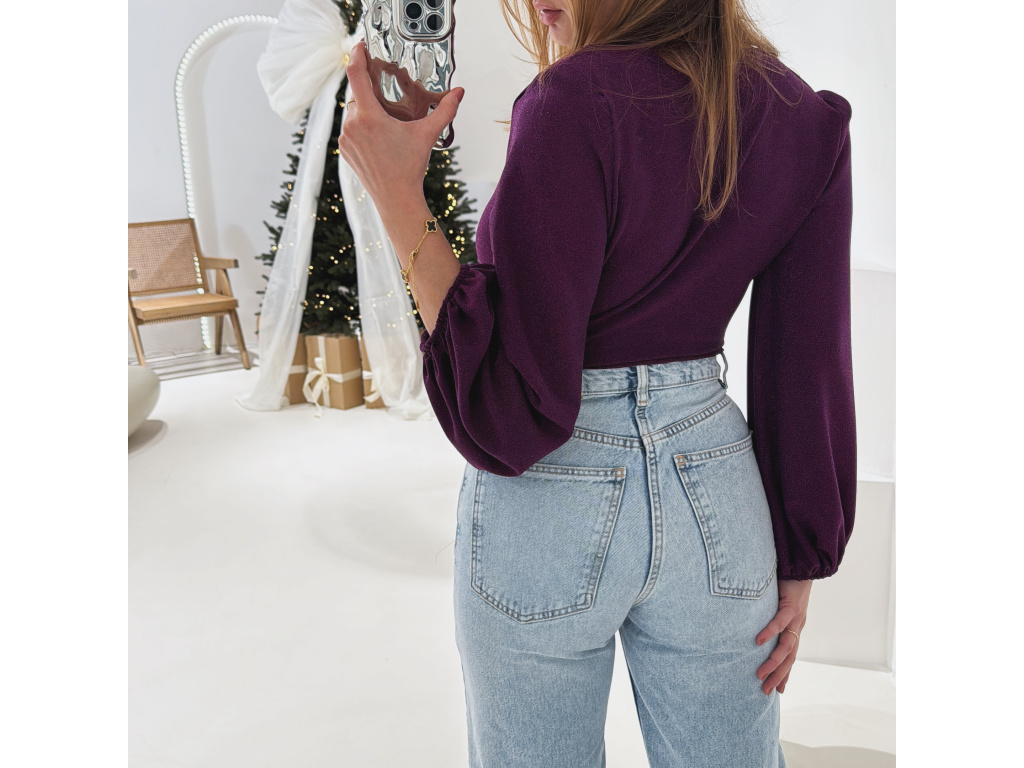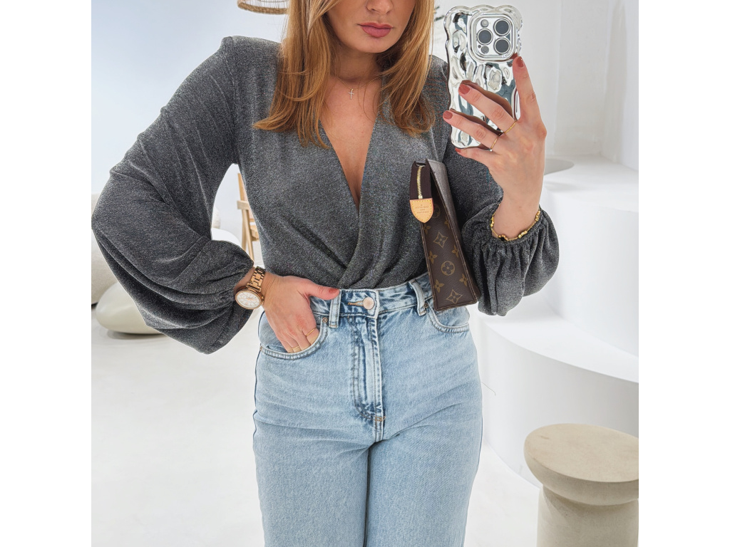 Stylové třpytivé body s rafinovaným překládaným výstřihem a výraznými balonovými rukávy, které dodají outfitu jedinečný šmrnc. Ve spodní části má praktické zapínání na háčky pro pohodlné nošení. Dostupné ve fialové, stříbrné a černé barvě ve velikostech S, M a L — ideální volba na večerní události i slavnostní příležitosti.