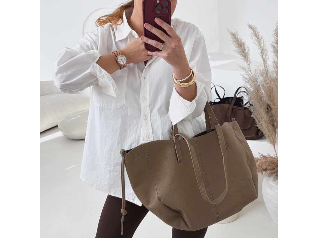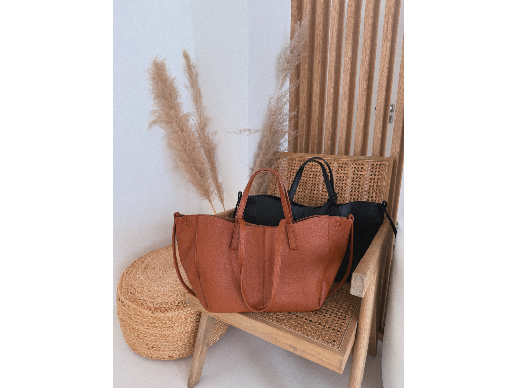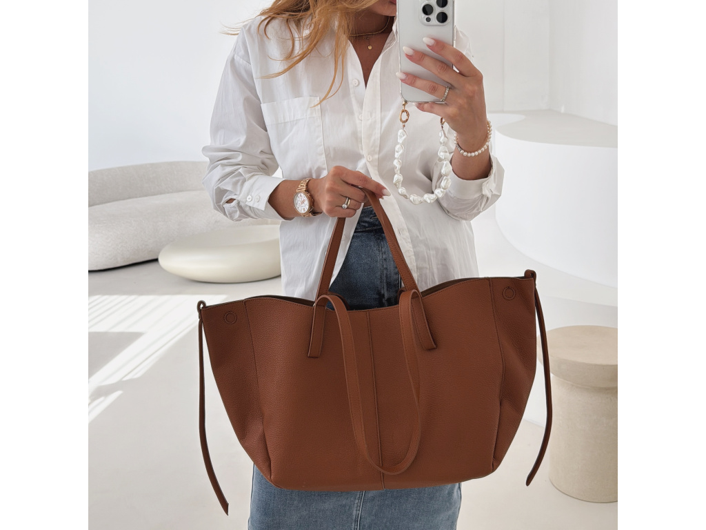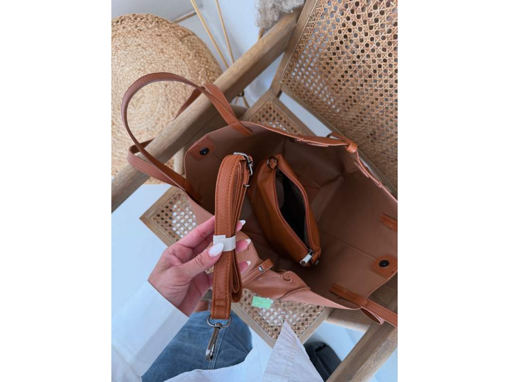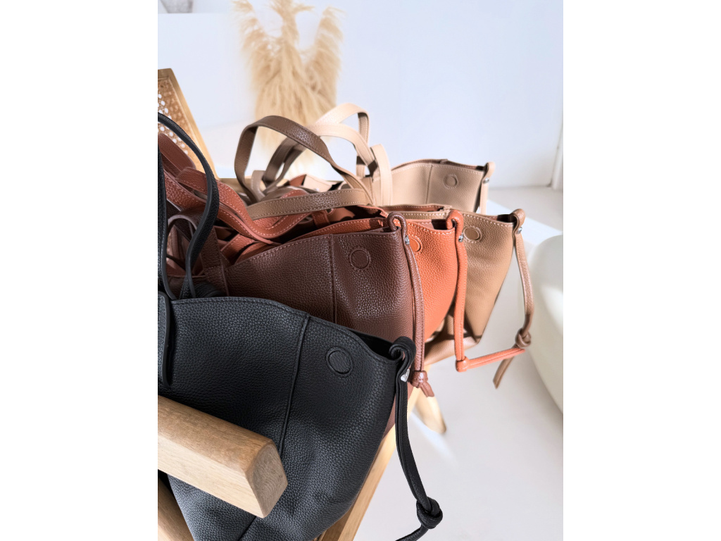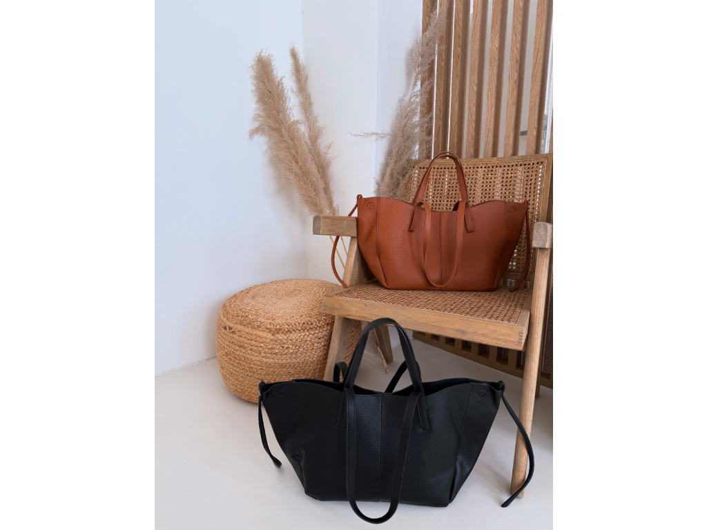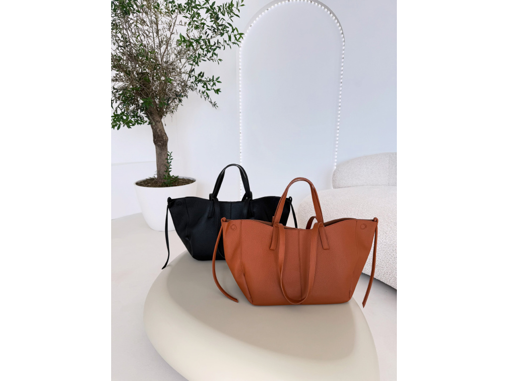 Stylová prostorná kabelka z kvalitní koženky s praktickými detaily. Po bocích má magnety, díky kterým lze snadno měnit její tvar a velikost. Zapíná se na cvoček, uvnitř najdete malou kosmetickou taštičku. Součástí je i popruh, takže ji můžete nosit také jako crossbody. Dostupná v camel a černé barvě.