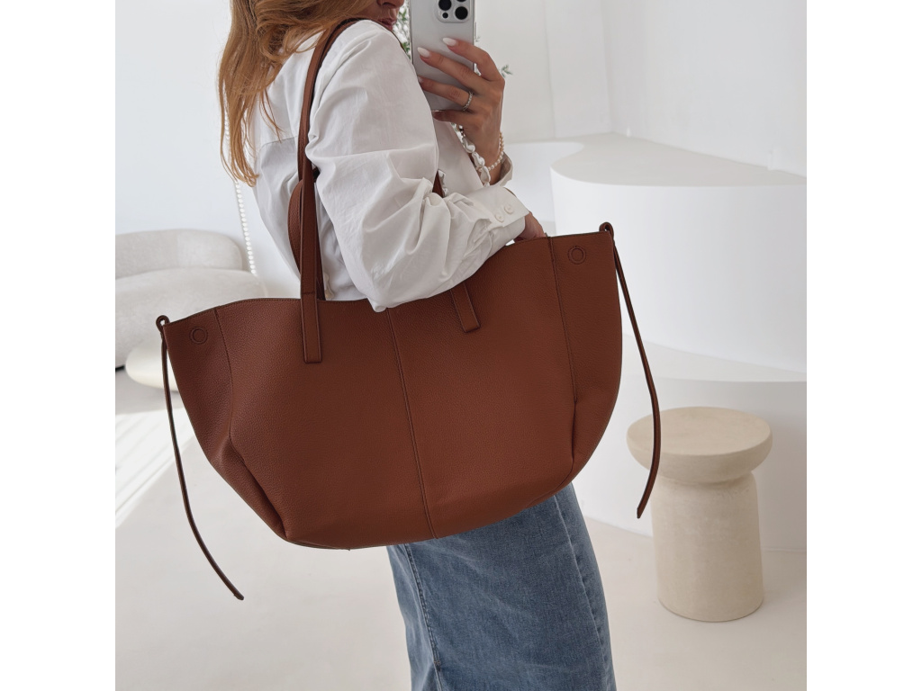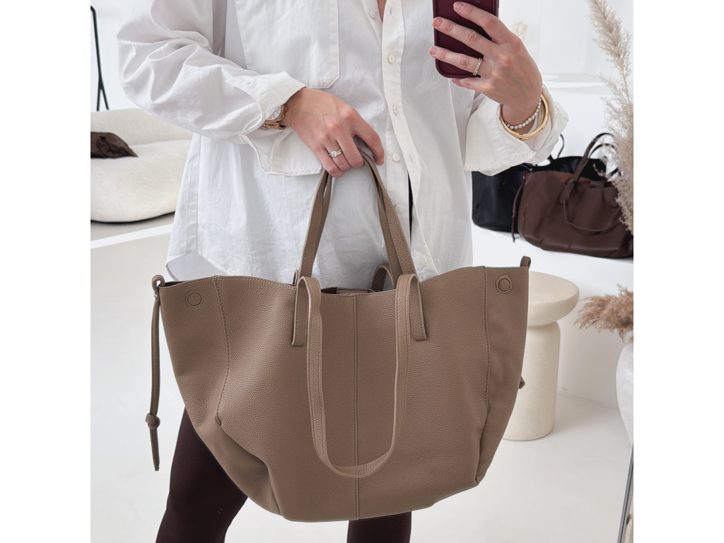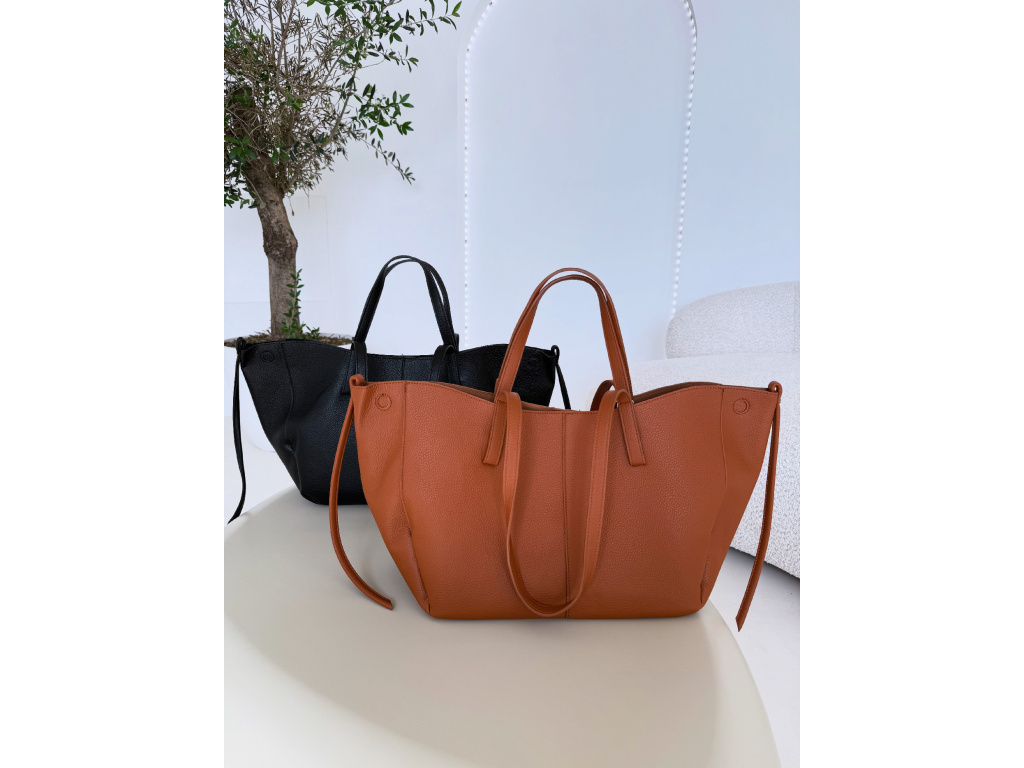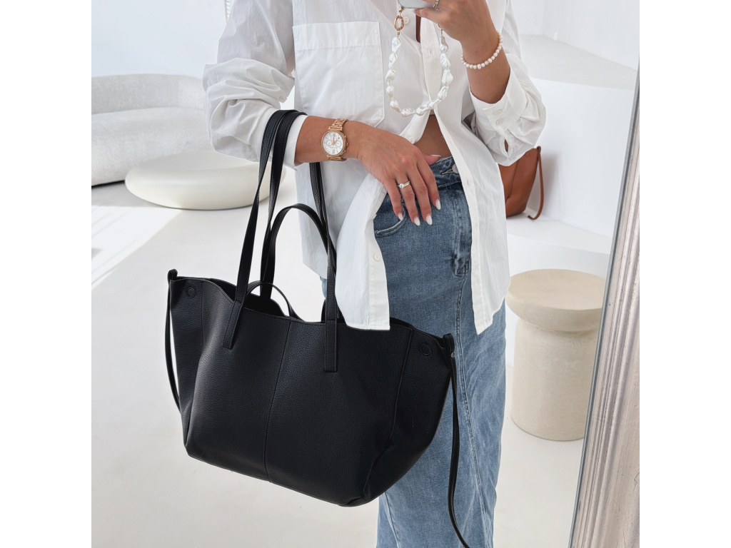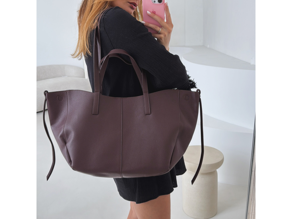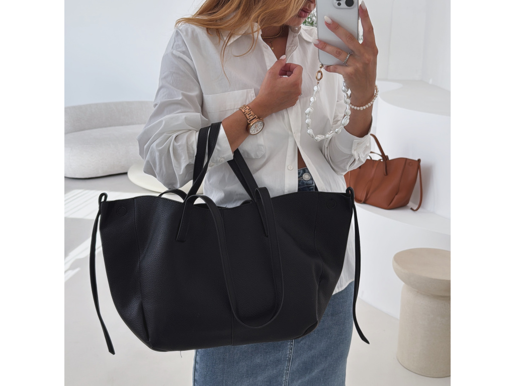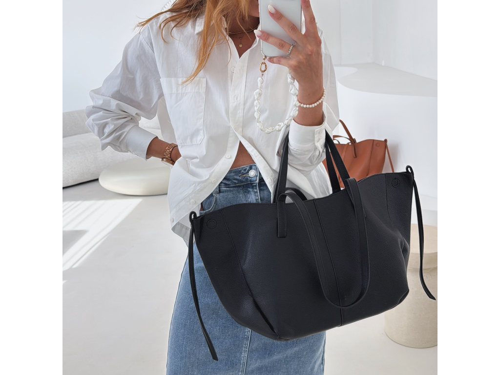 Stylová prostorná kabelka z kvalitní koženky s praktickými detaily. Po bocích má magnety, díky kterým lze snadno měnit její tvar a velikost. Zapíná se na cvoček, uvnitř najdete malou kosmetickou taštičku. Součástí je i popruh, takže ji můžete nosit také jako crossbody. Dostupná v camel a černé barvě.