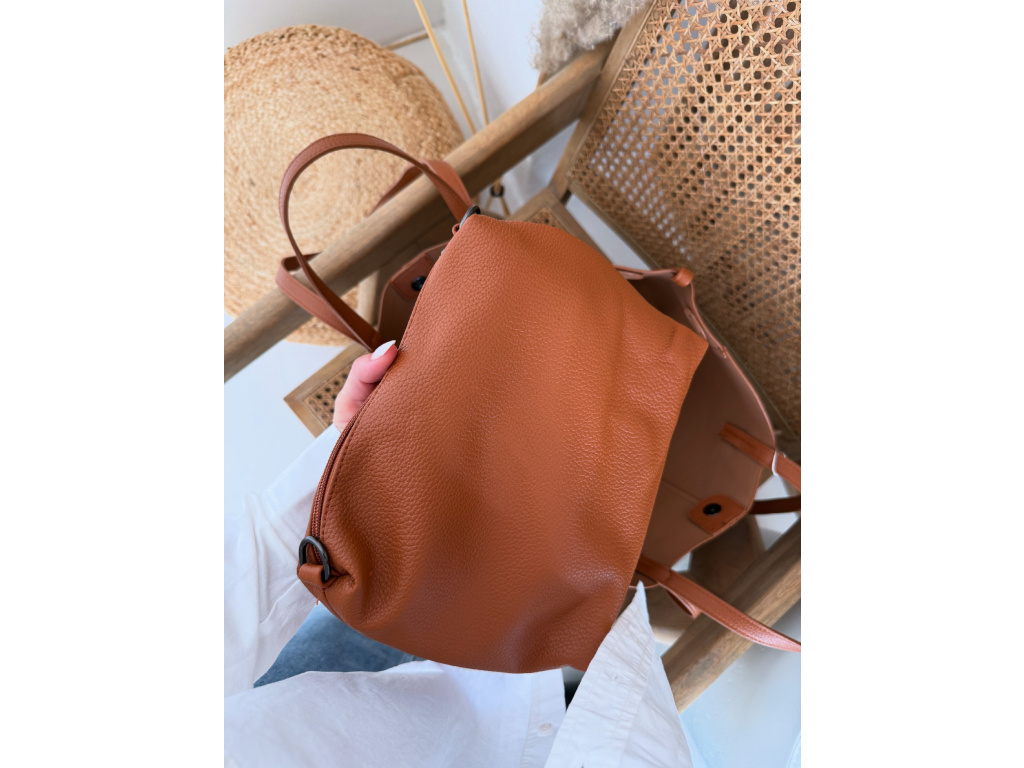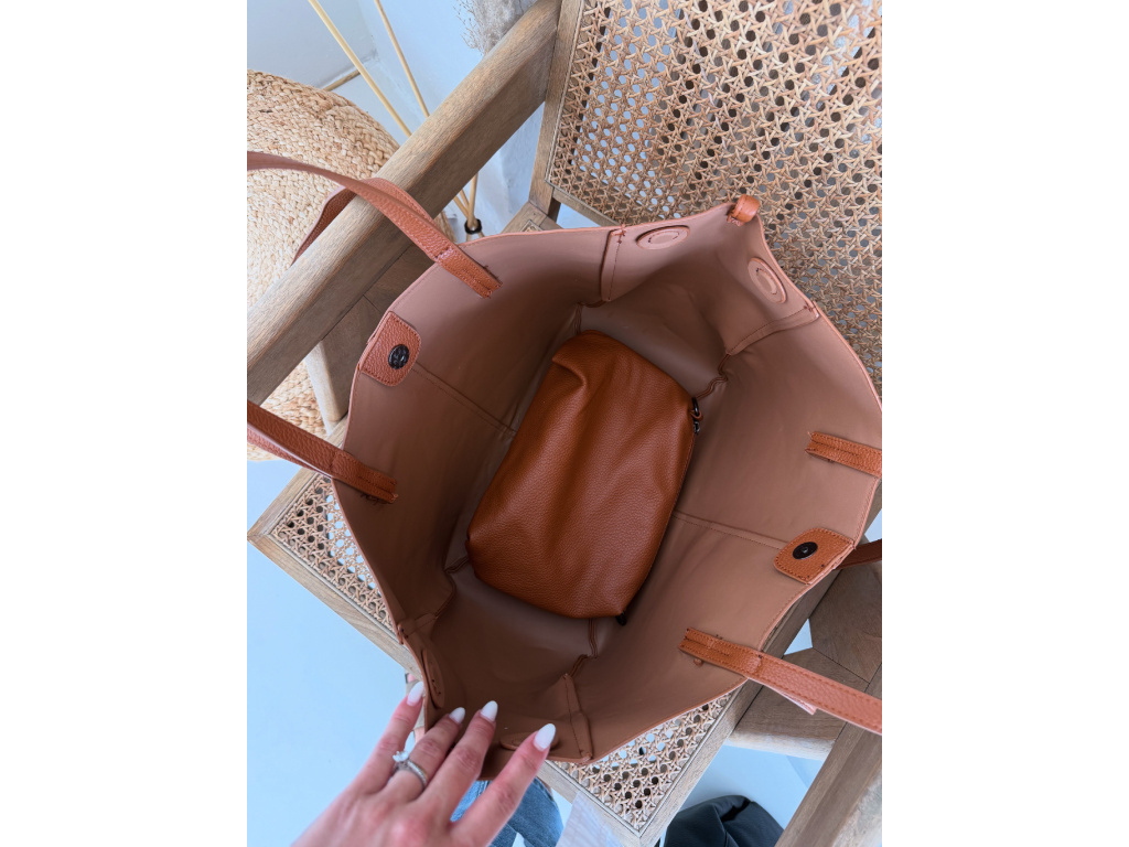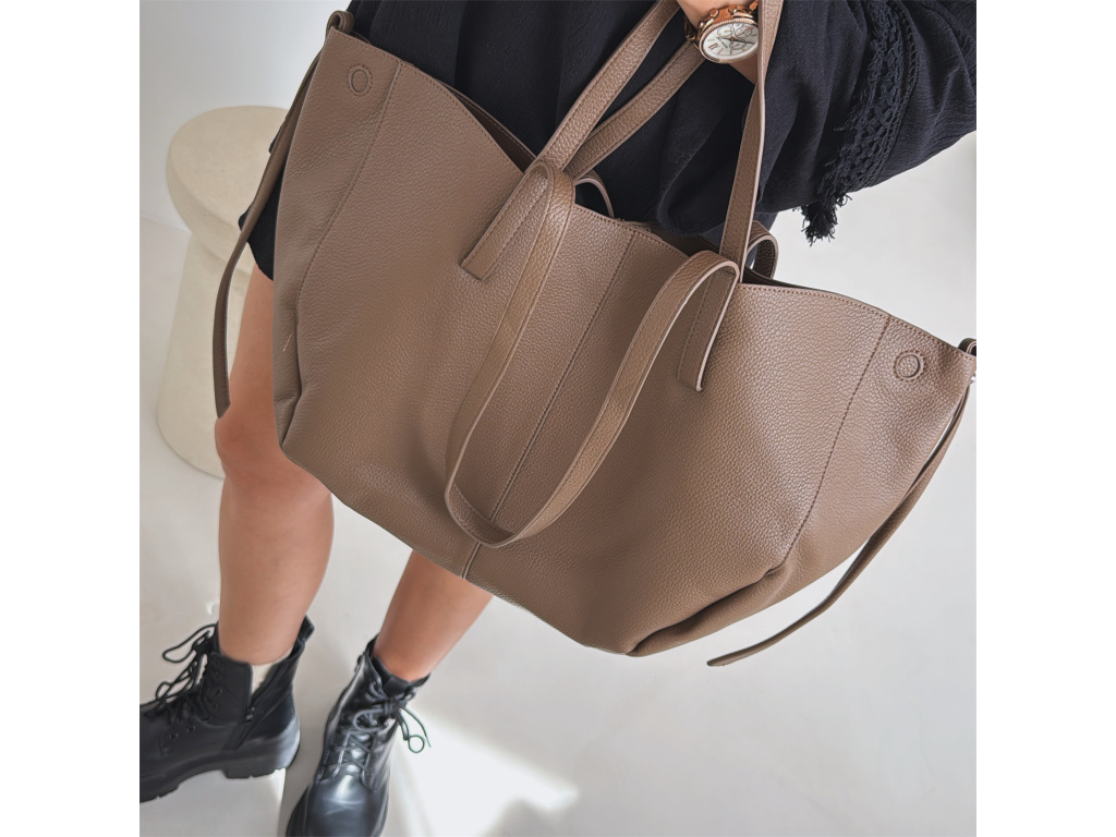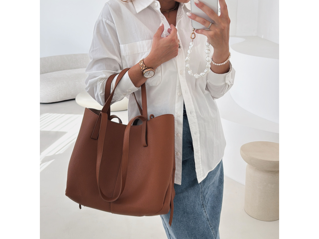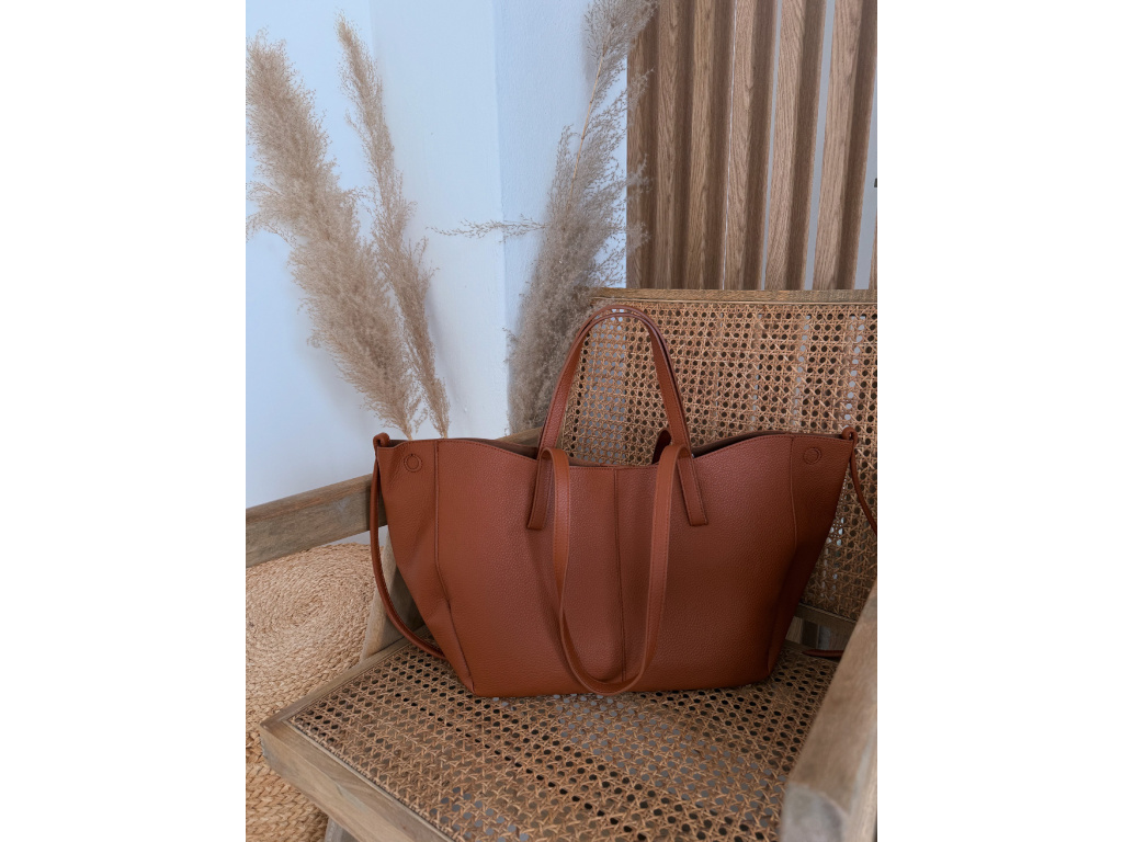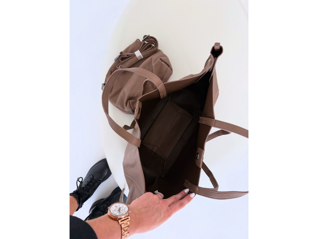 Stylová prostorná kabelka z kvalitní koženky s praktickými detaily. Po bocích má magnety, díky kterým lze snadno měnit její tvar a velikost. Zapíná se na cvoček, uvnitř najdete malou kosmetickou taštičku. Součástí je i popruh, takže ji můžete nosit také jako crossbody. Dostupná v camel a černé barvě.