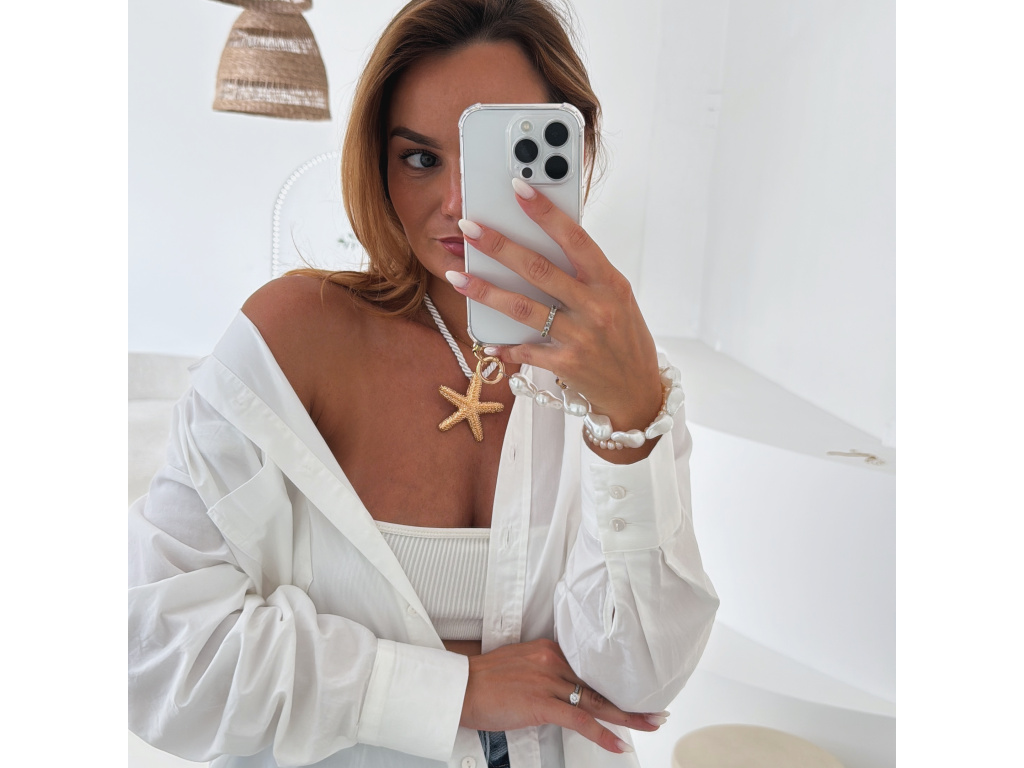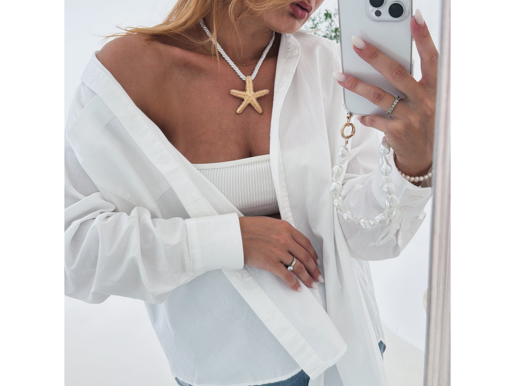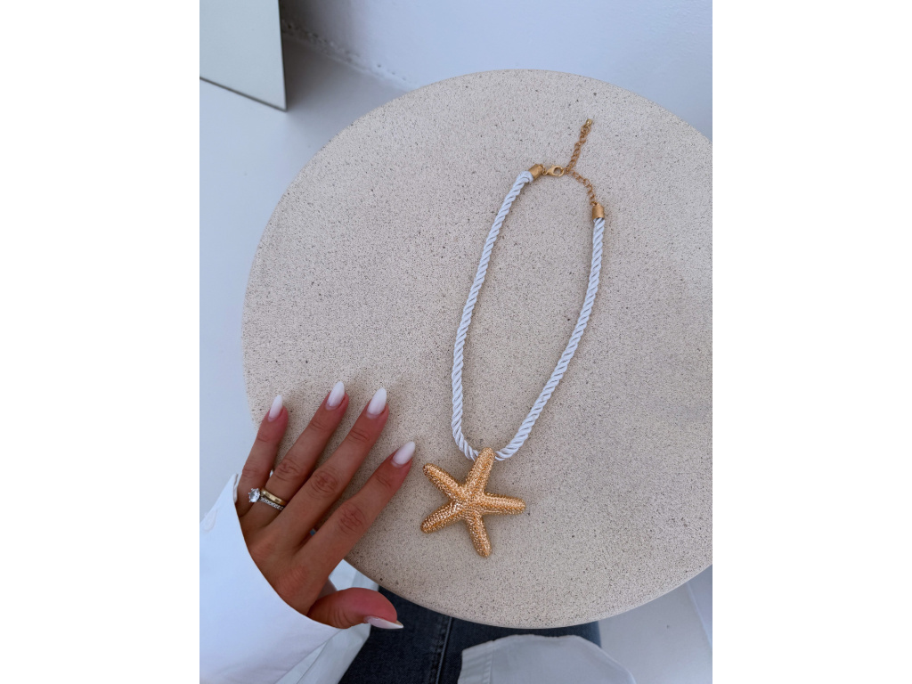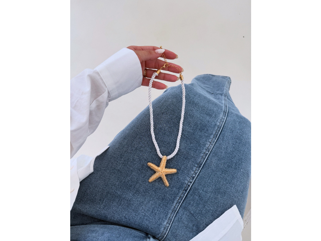 Výrazný šperk, který okamžitě přenese do letní atmosféry. Bílý pletený řetízek a zlatý přívěsek ve tvaru hvězdice tvoří originální kombinaci, která oživí každý outfit – od plážových šatů po elegantní košile.