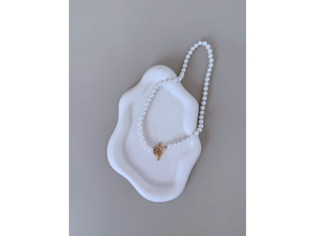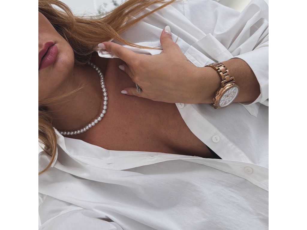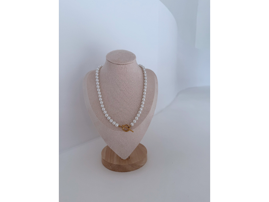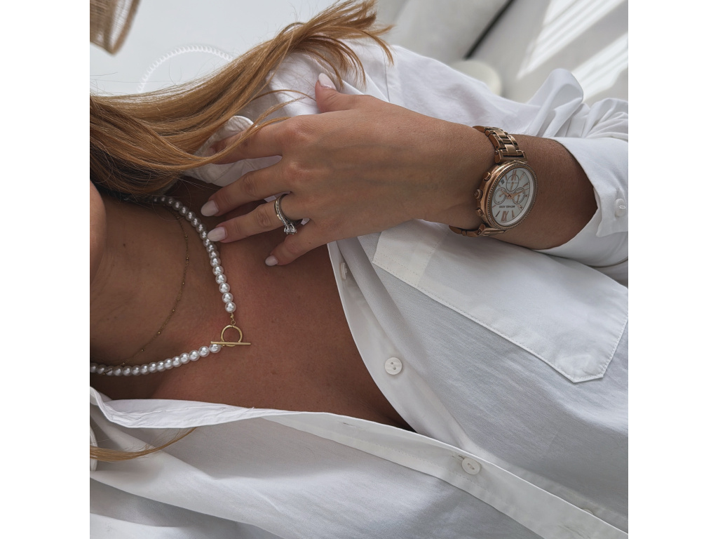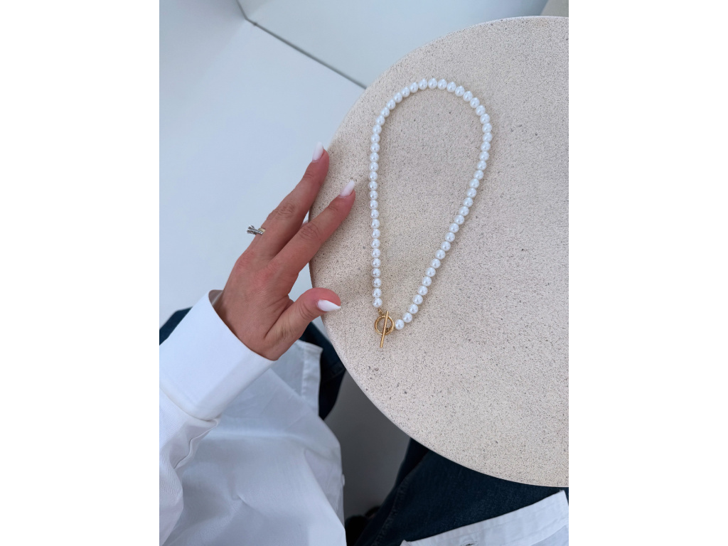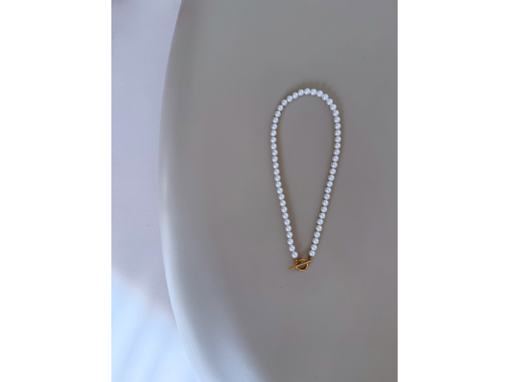 Elegantní perlový náhrdelník z nerezové oceli, který je nadčasovým doplňkem pro každou příležitost. Perličky doplňuje zlatý detail se zapínáním, který lze nosit vpředu i vzadu – podle nálady a stylu. Skvěle vynikne jak k bílé košili, tak i k večerním šatům.