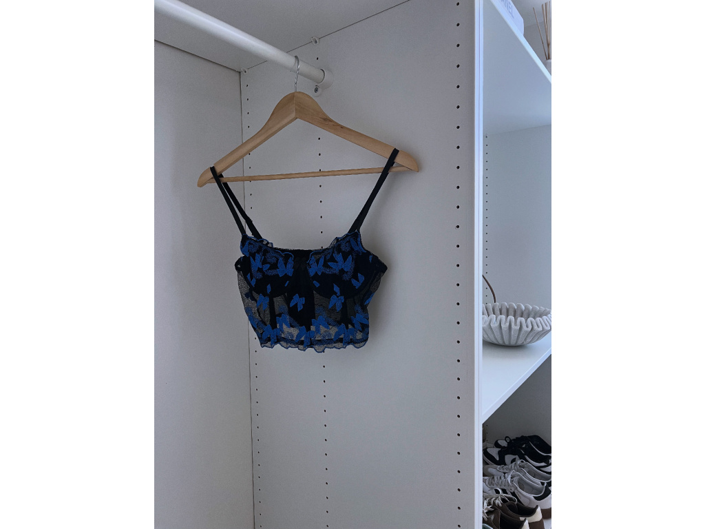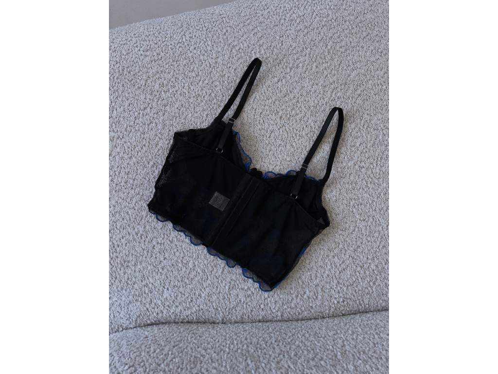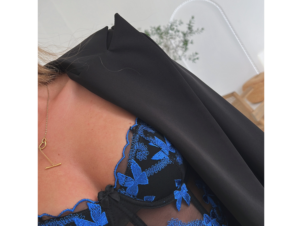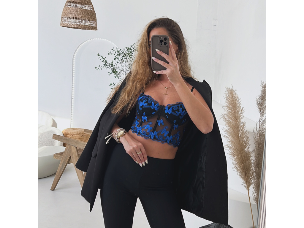 Černá braletka s královsky modrými mašličkami působí svůdně i elegantně zároveň. Jemná krajka s průhledným materiálem dodává luxusní vzhled, ramínka jsou délkově nastavitelná a obvod se dá jednoduše upravit pro perfektní padnutí. Braletka není vystužená, takže je lehká, pohodlná a ideální pro speciální příležitosti i běžné nošení. Dostupná ve velikostech XS, S a M. Podprsenka má posuvné, elastické ramínka a zapíná se podprsenkové háčky na 3 velikosti.