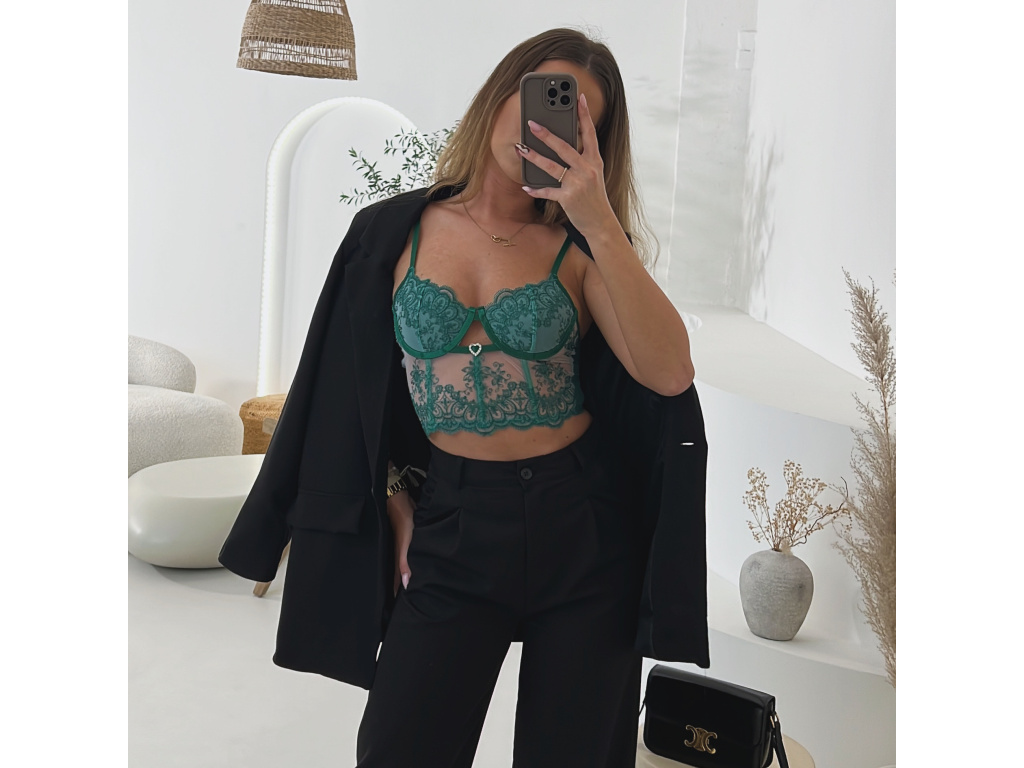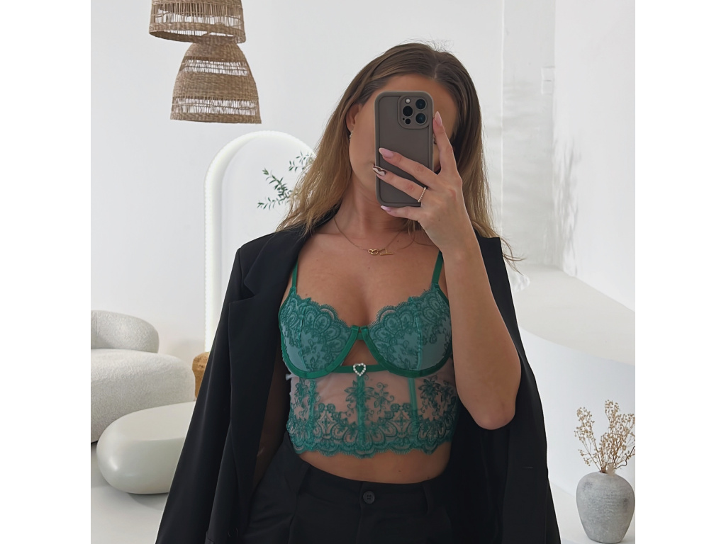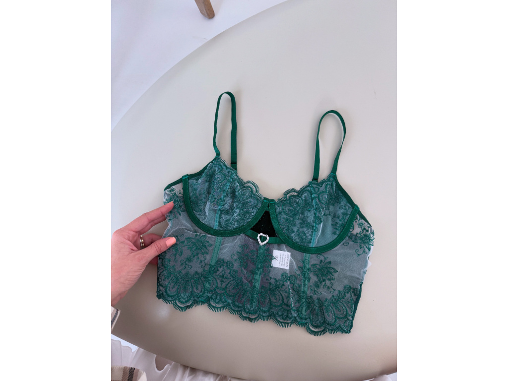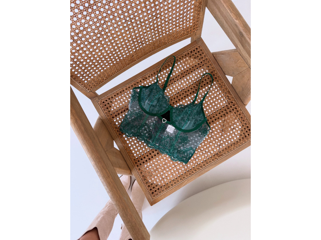 Luxusní krajková braletka v hlubokém smaragdově zeleném odstínu, která zaujme svým rafinovaným střihem a jemnými detaily. Transparentní krajka s květinovým motivem, delší lem a decentní srdíčko ve středu dodávají braletce elegantní a svůdný vzhled. Dostupná ve velikostech XS, S a M. Podprsenka má posuvné, elastické ramínka a zapíná se podprsenkové háčky na 3 velikosti. Košíčky nejsou vyztužené.