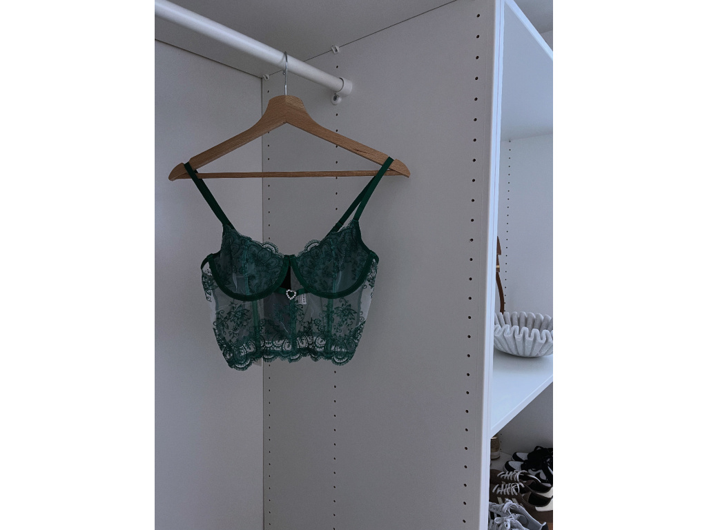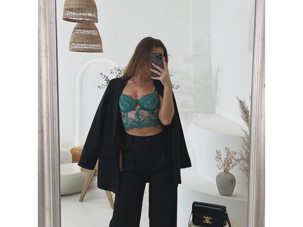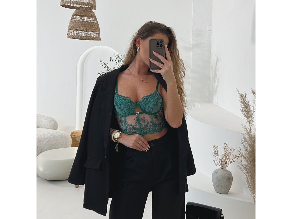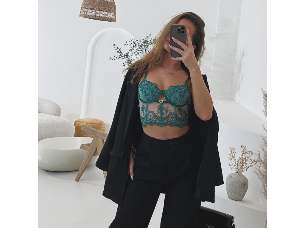 Luxusní krajková braletka v hlubokém smaragdově zeleném odstínu, která zaujme svým rafinovaným střihem a jemnými detaily. Transparentní krajka s květinovým motivem, delší lem a decentní srdíčko ve středu dodávají braletce elegantní a svůdný vzhled. Dostupná ve velikostech XS, S a M. Podprsenka má posuvné, elastické ramínka a zapíná se podprsenkové háčky na 3 velikosti. Košíčky nejsou vyztužené.