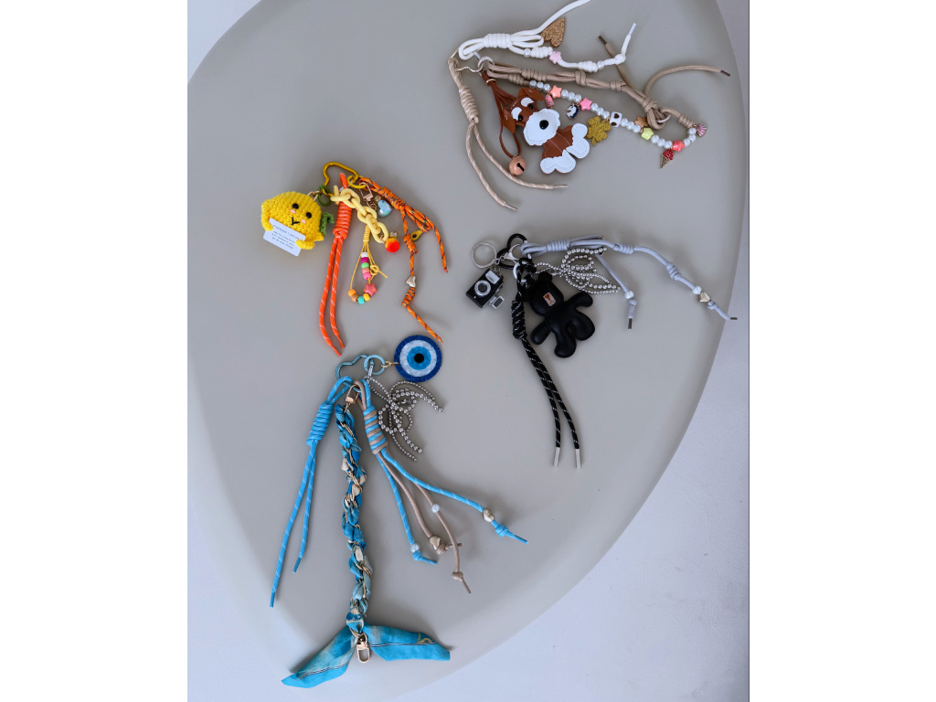 Originální přívěšky, které dodají šmrnc vašim klíčům, kabelce nebo třeba batohu. Každý z nich je jedinečný svými barvami, tvary a kombinací různých ozdob – od korálků přes mašličky, háčkované motivy až po třpytivé detaily. Jeden z přívěšků obsahuje více menších přívěsků, které lze snadno odepnout a nosit samostatně. Skvělý doplněk i dárek pro každého, kdo má rád hravé a stylové detaily.