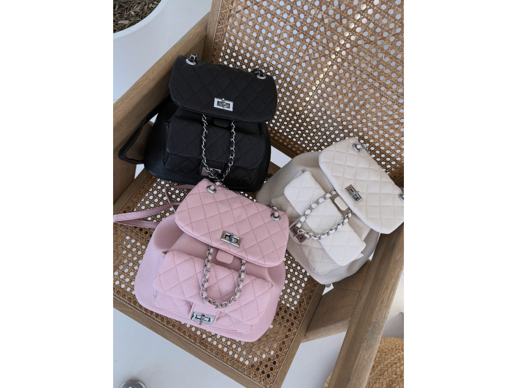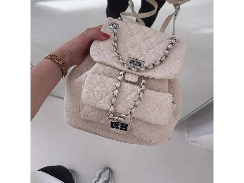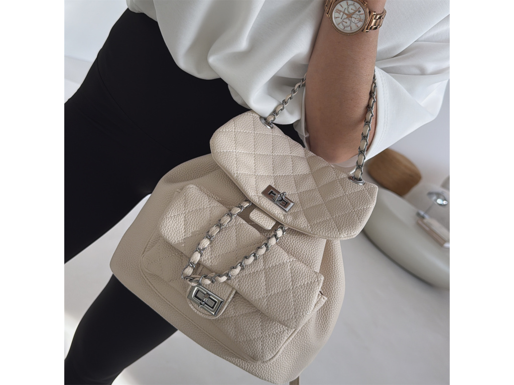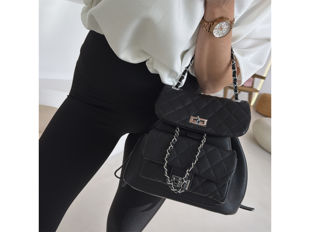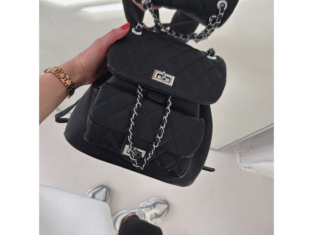 Stylový batůžek s elegantním prošívaným designem, který skvěle doplní každý outfit. Zaujme stříbrnými detaily a řetízkovými prvky, které mu dodávají moderní a luxusní vzhled. Batůžek se zapíná na otočný zámek a nabízí dostatek prostoru na všechny každodenní nezbytnosti. Skvěle se hodí jak na běžné nošení, tak i jako stylový doplněk k elegantnějším outfitům.