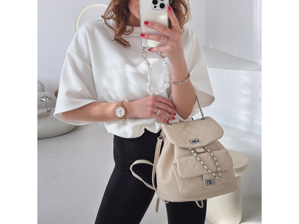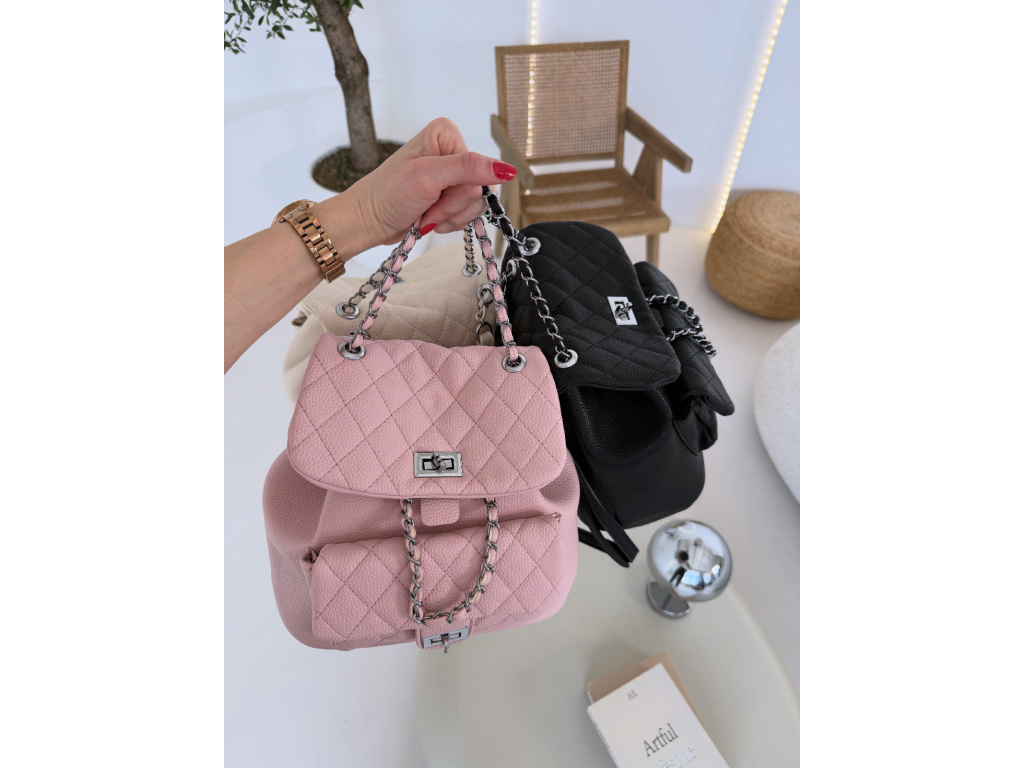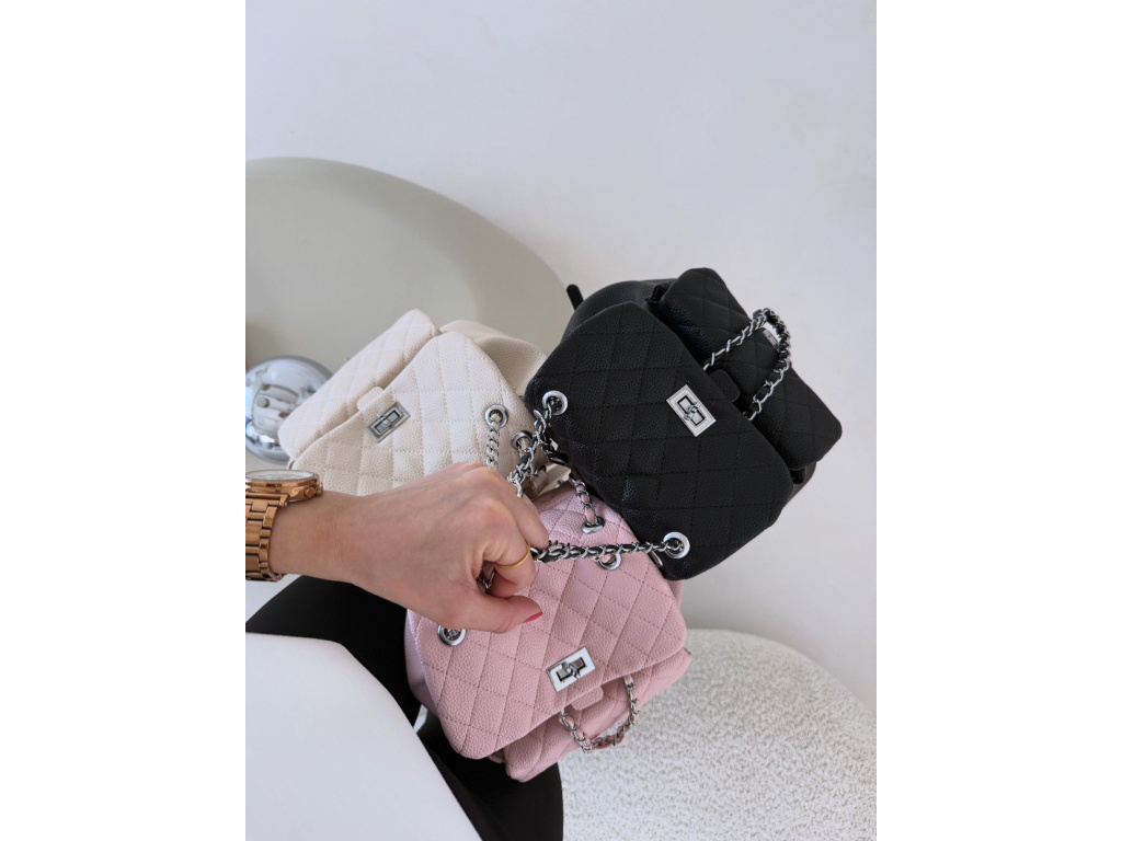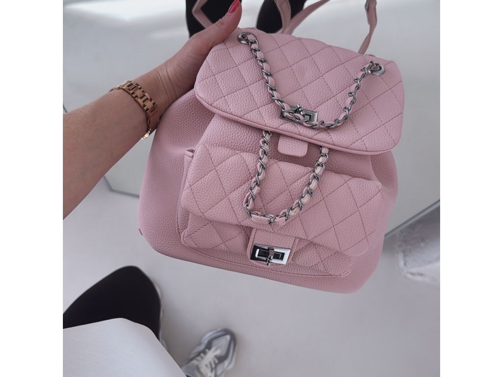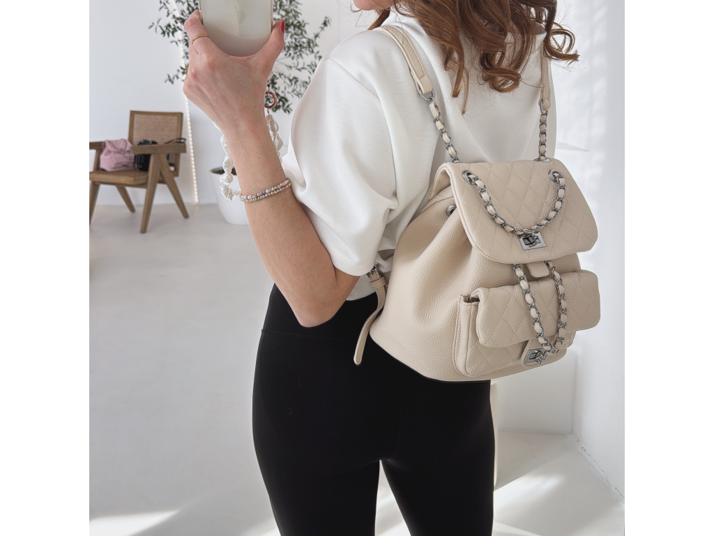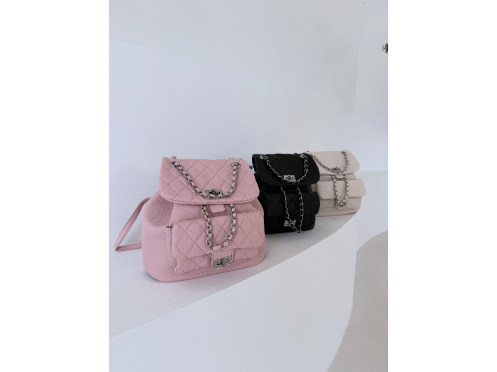 Stylový batůžek s elegantním prošívaným designem, který skvěle doplní každý outfit. Zaujme stříbrnými detaily a řetízkovými prvky, které mu dodávají moderní a luxusní vzhled. Batůžek se zapíná na otočný zámek a nabízí dostatek prostoru na všechny každodenní nezbytnosti. Skvěle se hodí jak na běžné nošení, tak i jako stylový doplněk k elegantnějším outfitům.