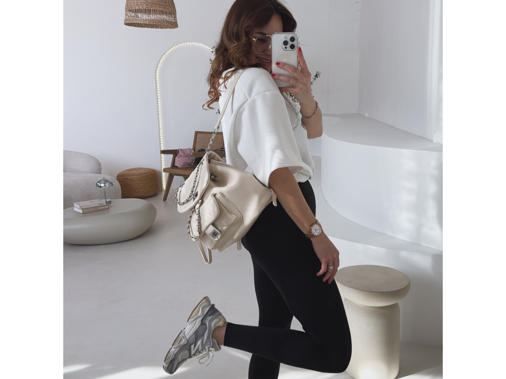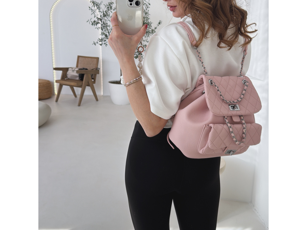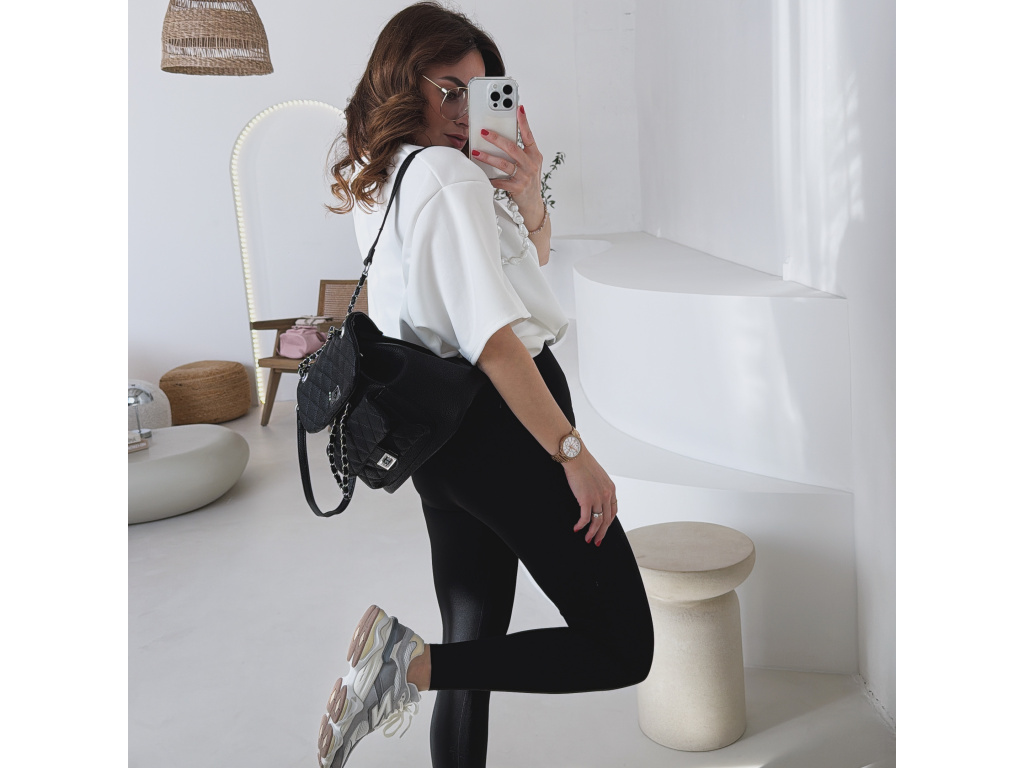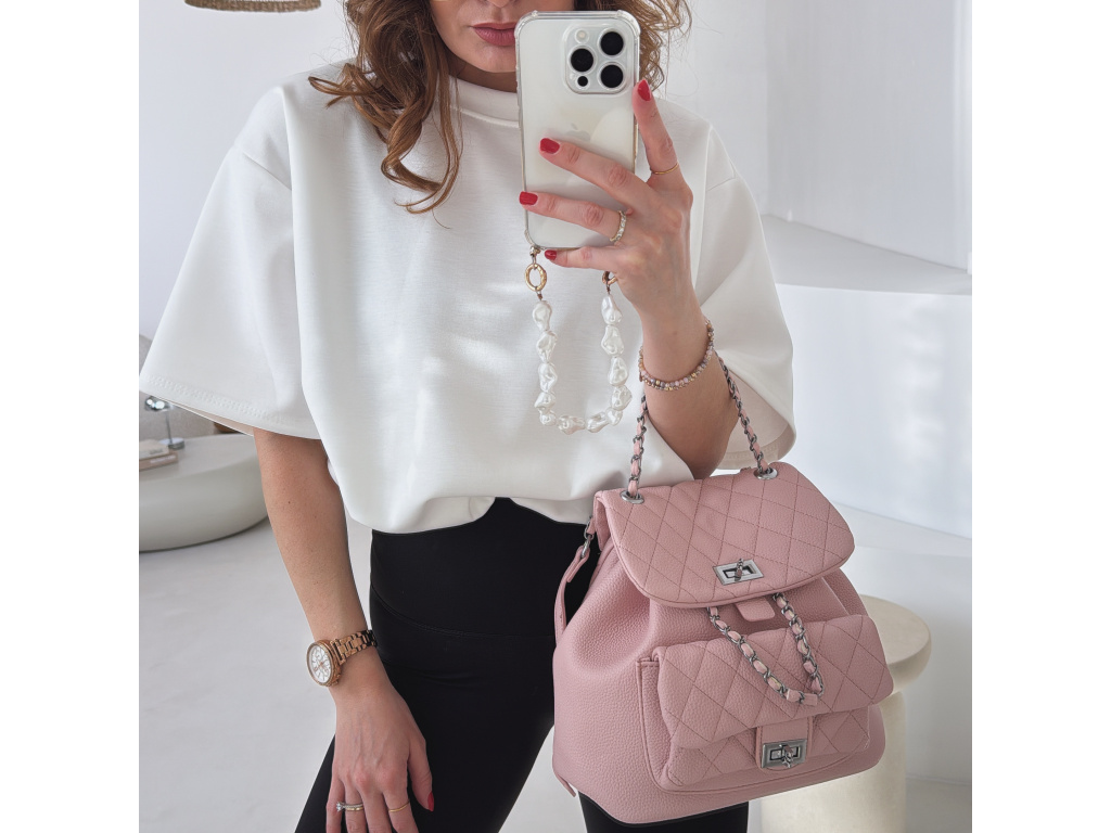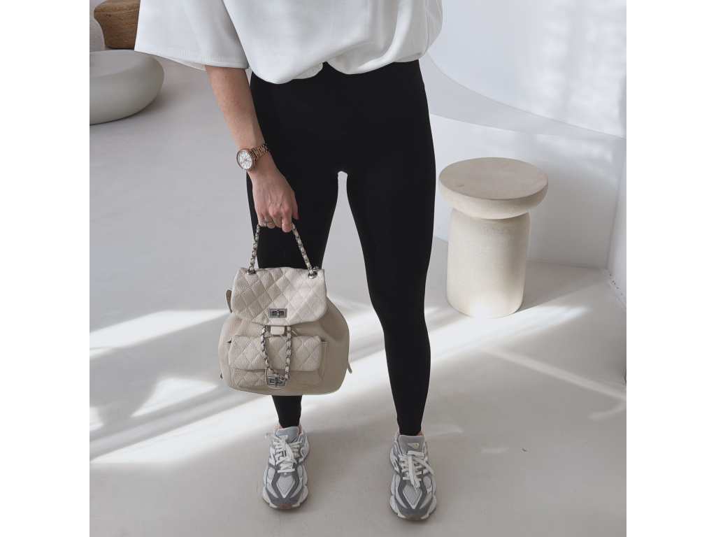 Stylový batůžek s elegantním prošívaným designem, který skvěle doplní každý outfit. Zaujme stříbrnými detaily a řetízkovými prvky, které mu dodávají moderní a luxusní vzhled. Batůžek se zapíná na otočný zámek a nabízí dostatek prostoru na všechny každodenní nezbytnosti. Skvěle se hodí jak na běžné nošení, tak i jako stylový doplněk k elegantnějším outfitům.