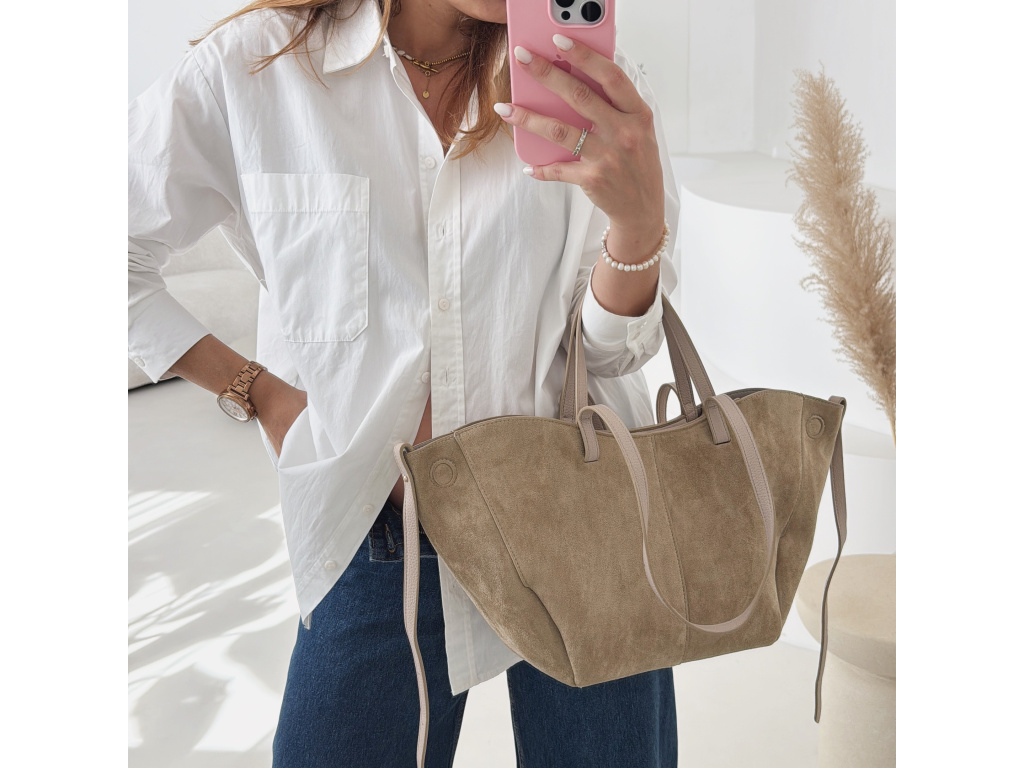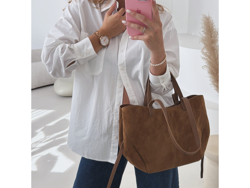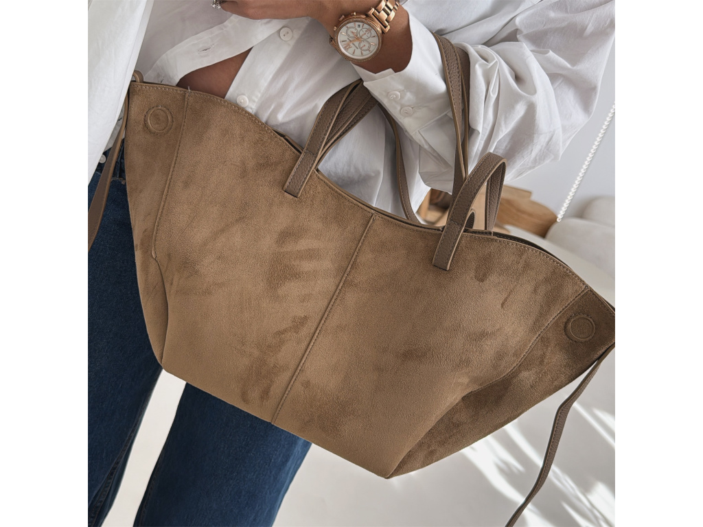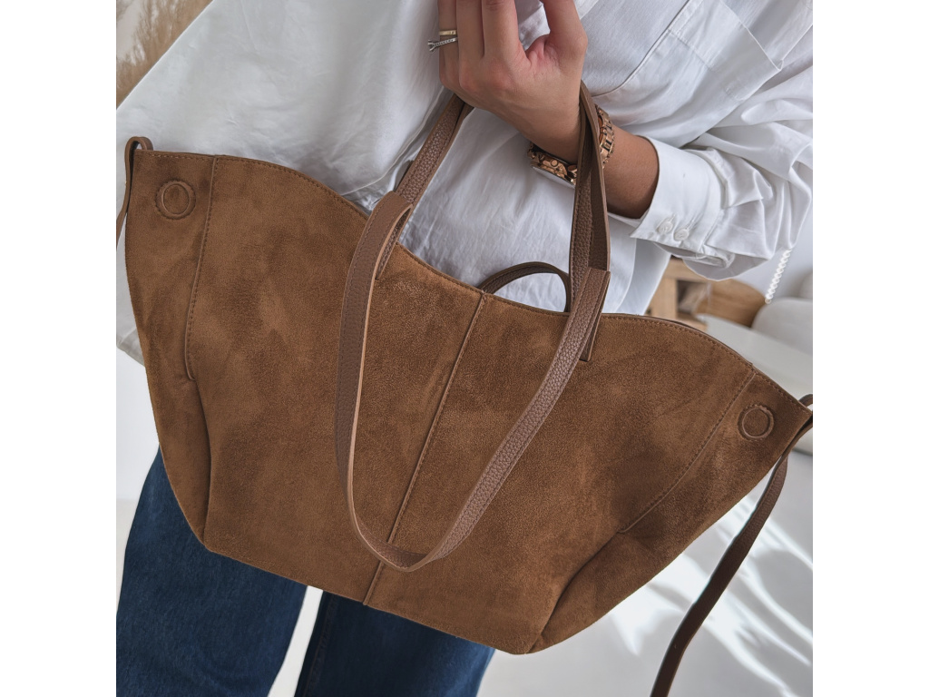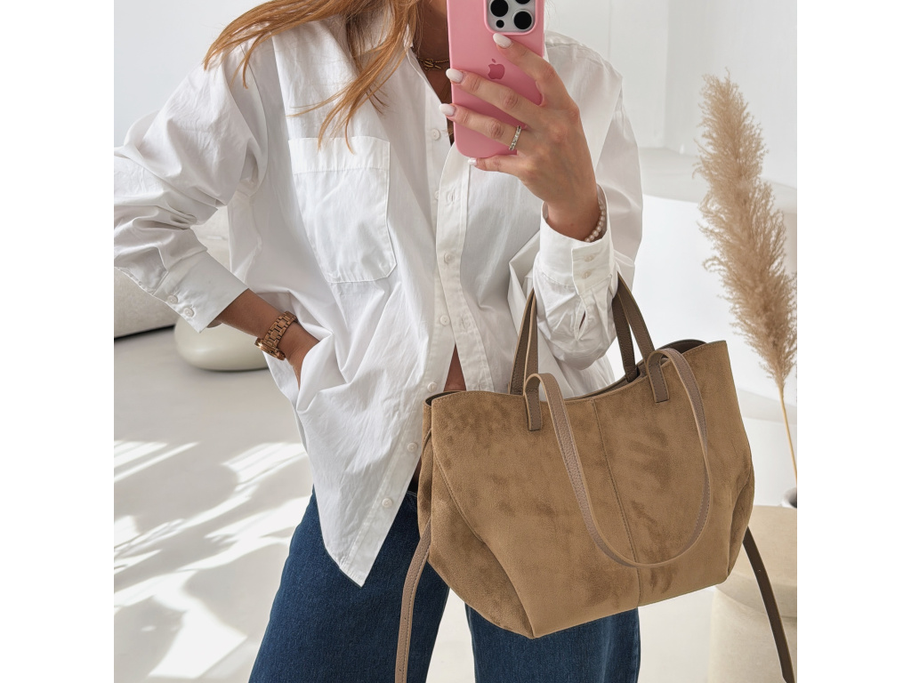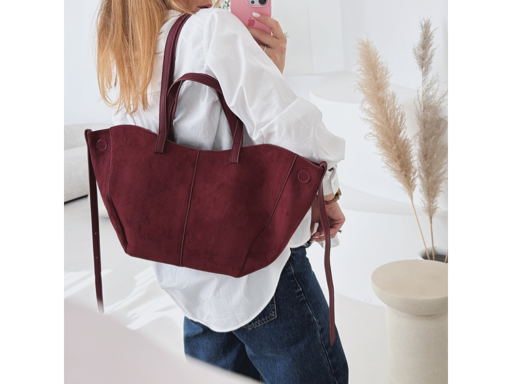 Stylová semišová kabelka, která v sobě spojuje eleganci i praktičnost. Uvnitř najdete kosmetickou taštičku, kterou můžete použít samostatně. Kabelka má dva popruhy – kratší do ruky a delší přes rameno. Díky postranním magnetkům můžete snadno měnit její tvar i velikost podle potřeby. Dostupná ve 4 barevných variantách.