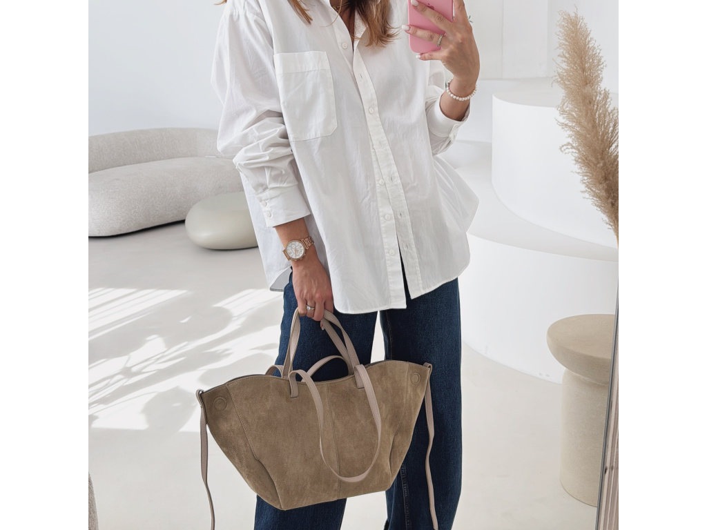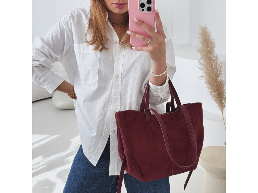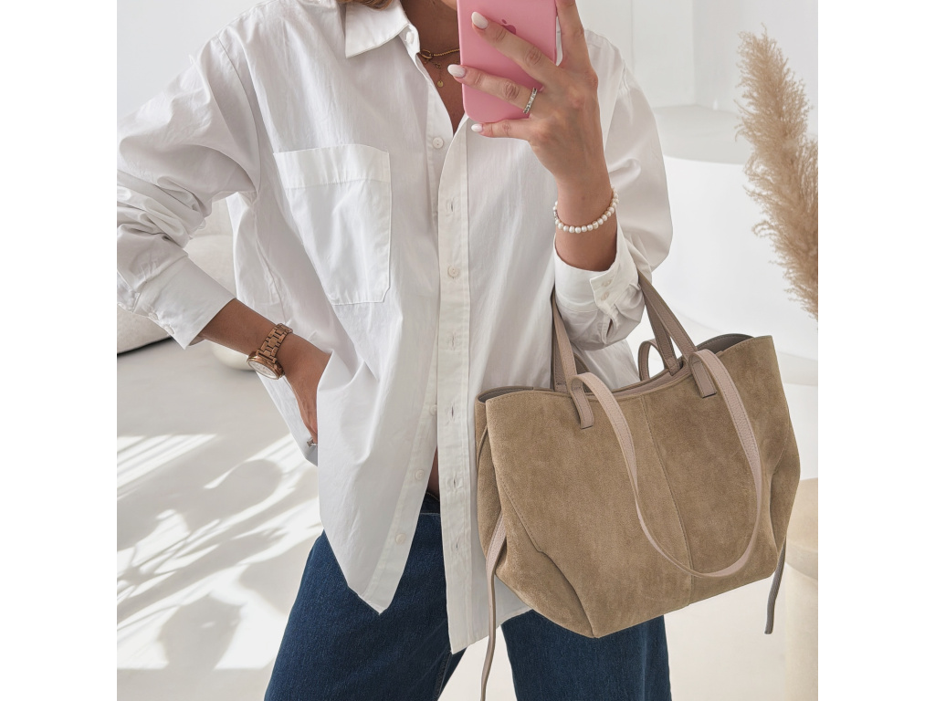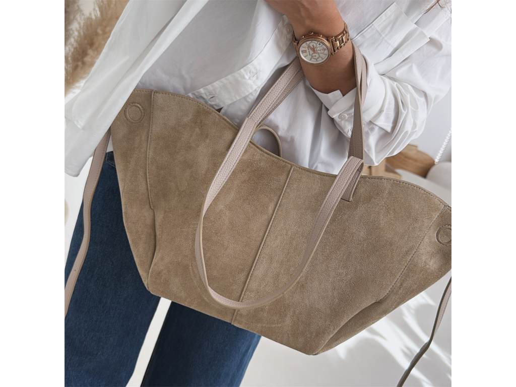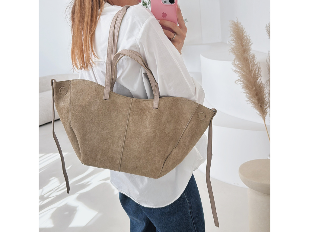 Stylová semišová kabelka, která v sobě spojuje eleganci i praktičnost. Uvnitř najdete kosmetickou taštičku, kterou můžete použít samostatně. Kabelka má dva popruhy – kratší do ruky a delší přes rameno. Díky postranním magnetkům můžete snadno měnit její tvar i velikost podle potřeby. Dostupná ve 4 barevných variantách.