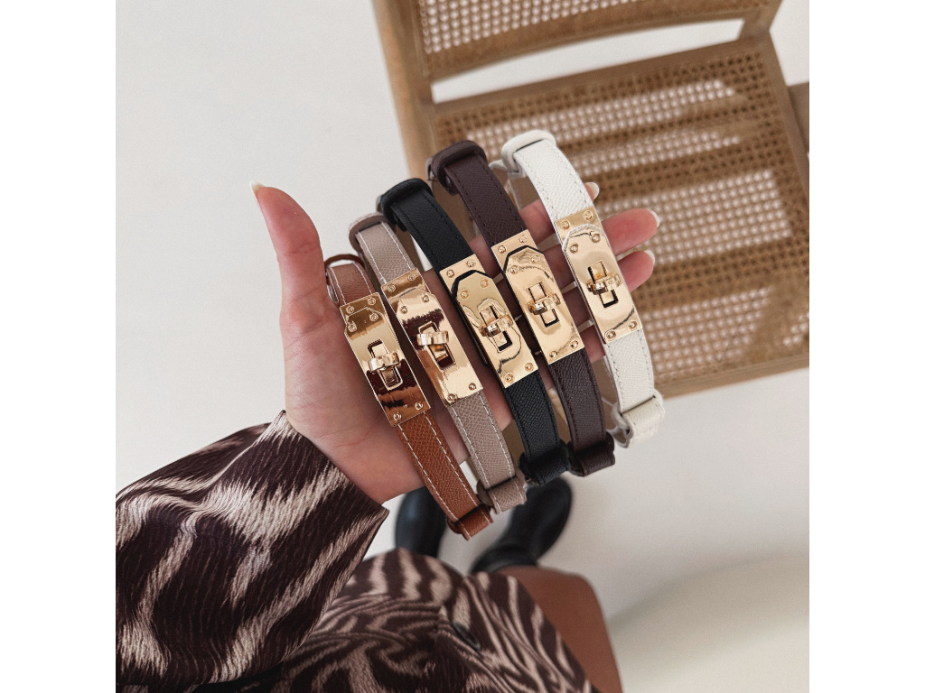 Elegantní, slim pásek se zlatým zámkem dostupný v béžové, hnědé a černé barvě. Velikost lze nastavit utažením či povolením od 56 až do 97 cm. Materiál je eko kůže. Pásek má šířku 1,5 cm.