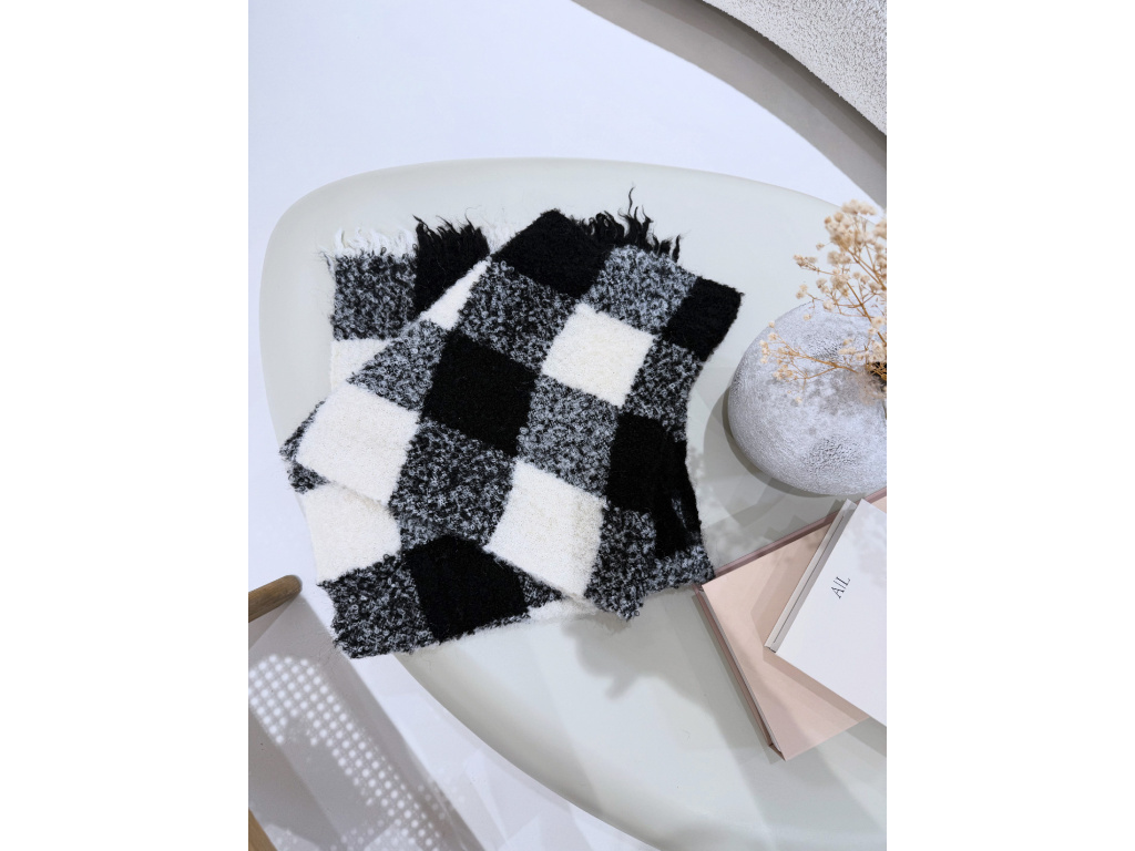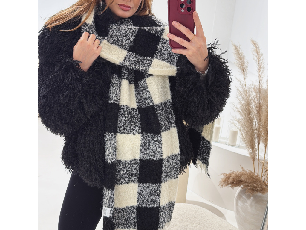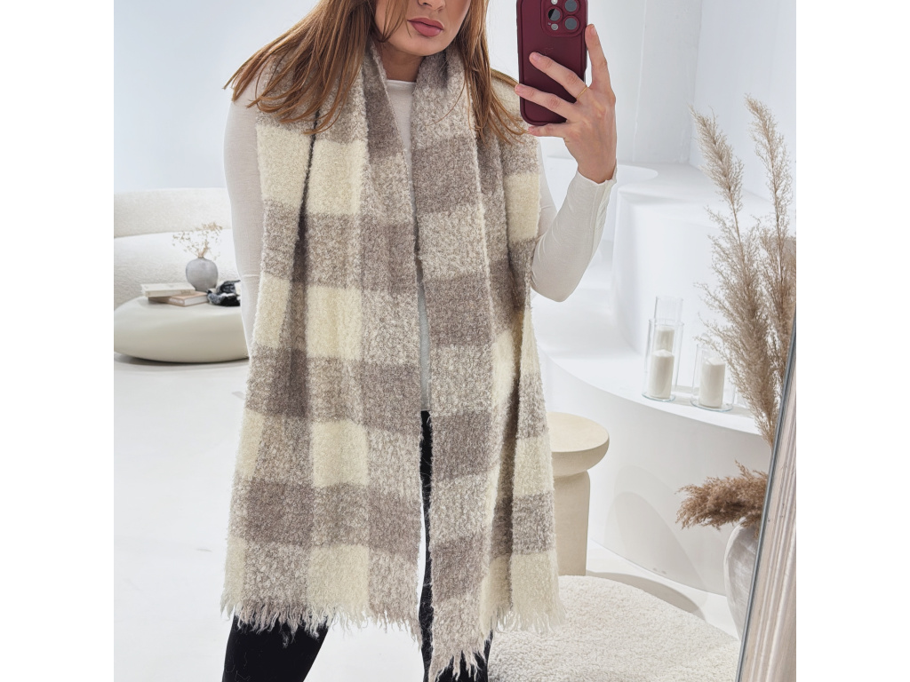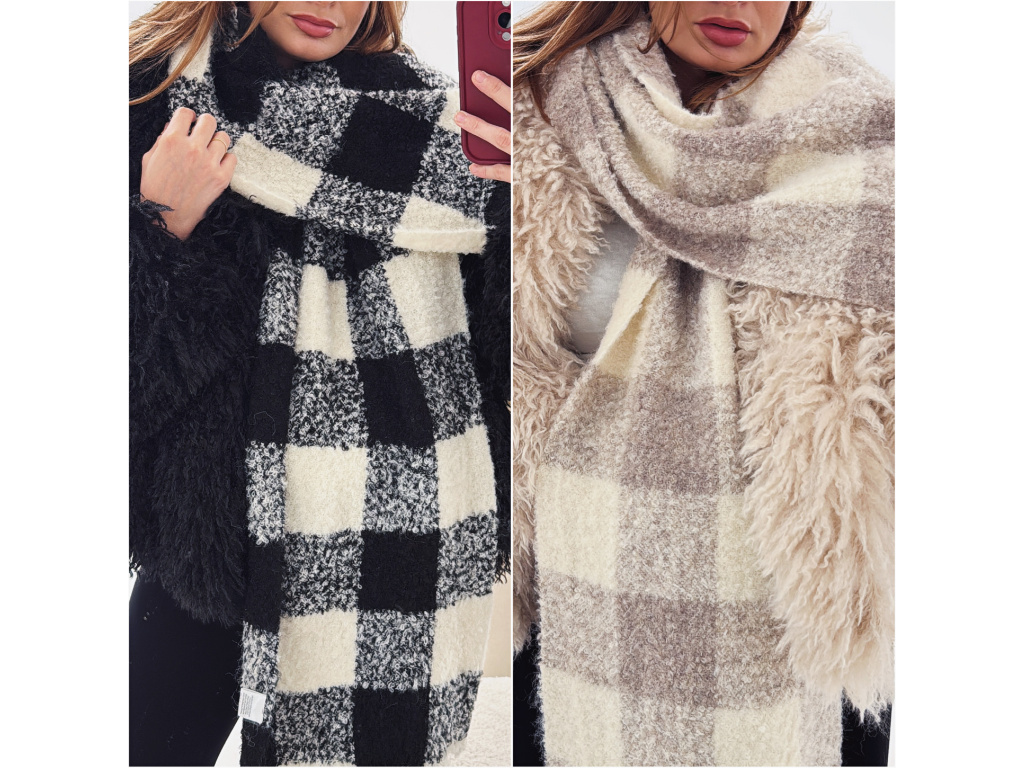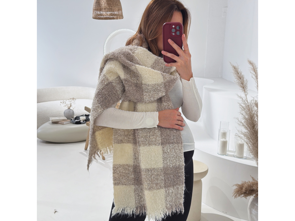 Měkká károvaná šála v béžové a černé barvě je ideálním doplňkem pro chladné období. Je příjemně hřejivá, nadýchaná a díky své větší velikosti ji můžete nosit klasicky kolem krku nebo jako stylish přehoz přes ramena. Neutrální odstíny se snadno kombinují s kabáty, bundami i kožíšky.