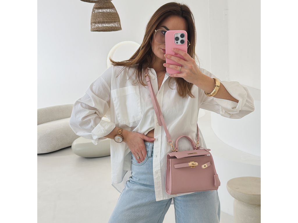 Elegantní kabelka velice hezky zpracovaná se zlatými detaily v růžové barvě. Kabelka je vč. popruhu na nošení jako crossbody. Uvnitř je vypodšívkovaná. Zapíná se na zlatou sponu. Materiál je eko kůže.