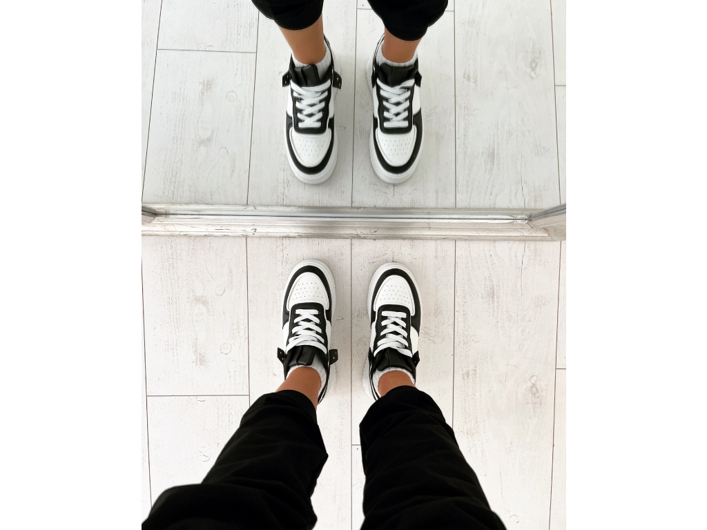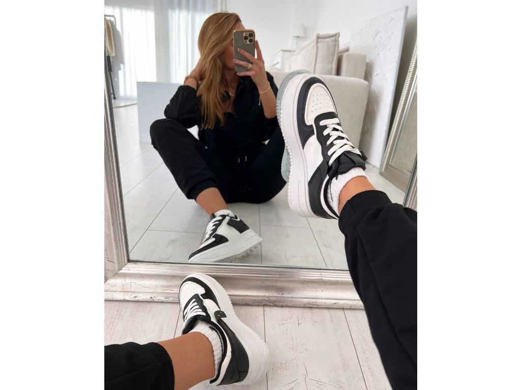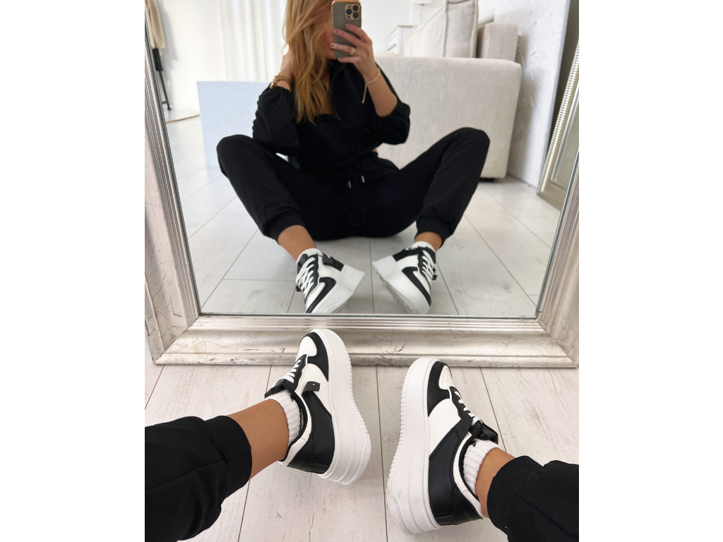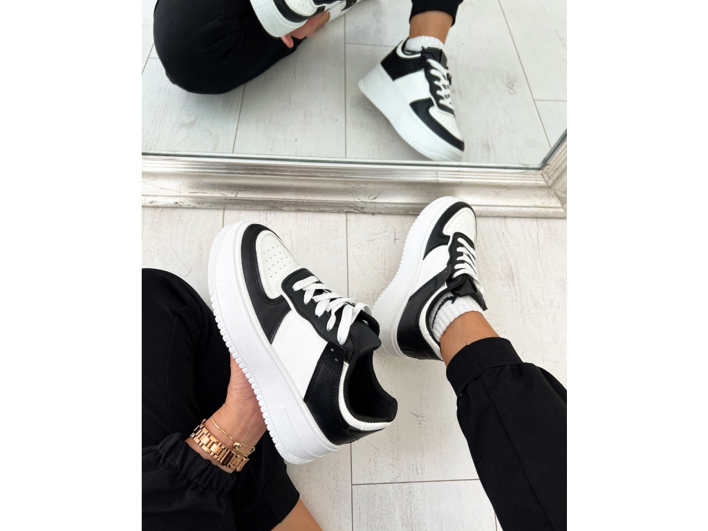 Stylové černobílé tenisky na vyvýšené, rovné podrážce z eko kůže. Velikosti odpovídají. Výška podrážky 4 - 4,5 cm.