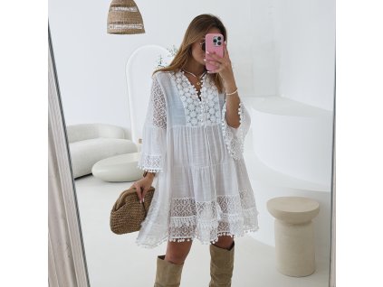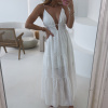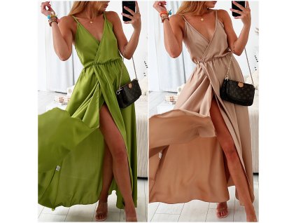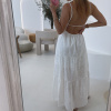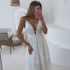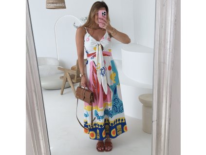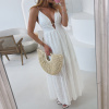 Elegantní letní maxi šaty s hlubokým výstřihem, tenkými ramínky a zdobenou sukní z madeiry. Horní díl má všitou výztuž pro pohodlné nošení bez podprsenky a otevřená záda dodávají modelu svůdný nádech. Perfektní volba na dovolenou, letní oslavu nebo romantickou večeři. Šaty mají podšívku a v oblasti prsou a pase hezky pruží. Ramínka jsou délkově nastavitelná. Velikost je univerzální, sedí na XS, S a M.