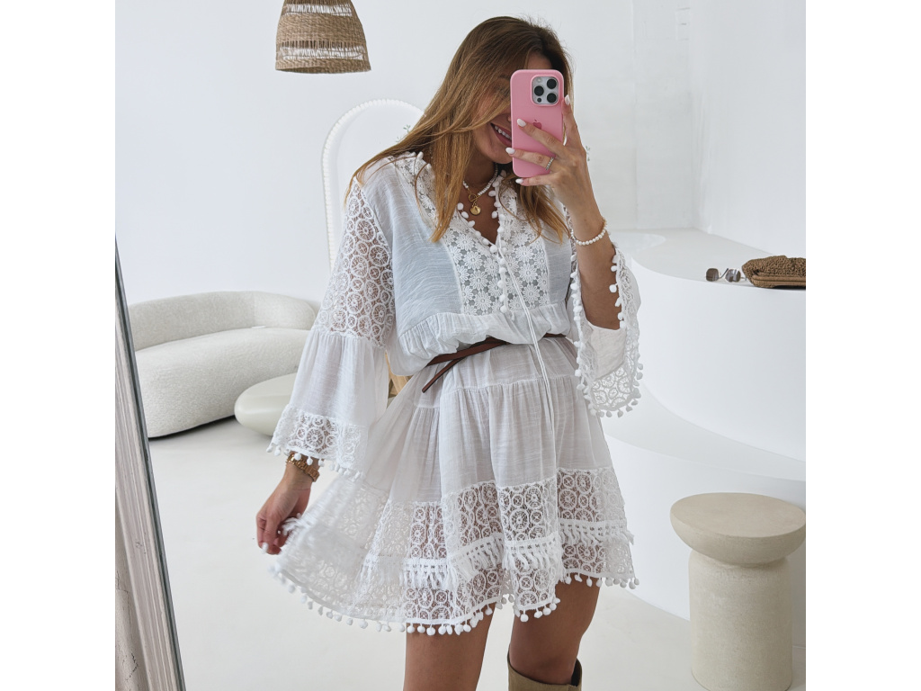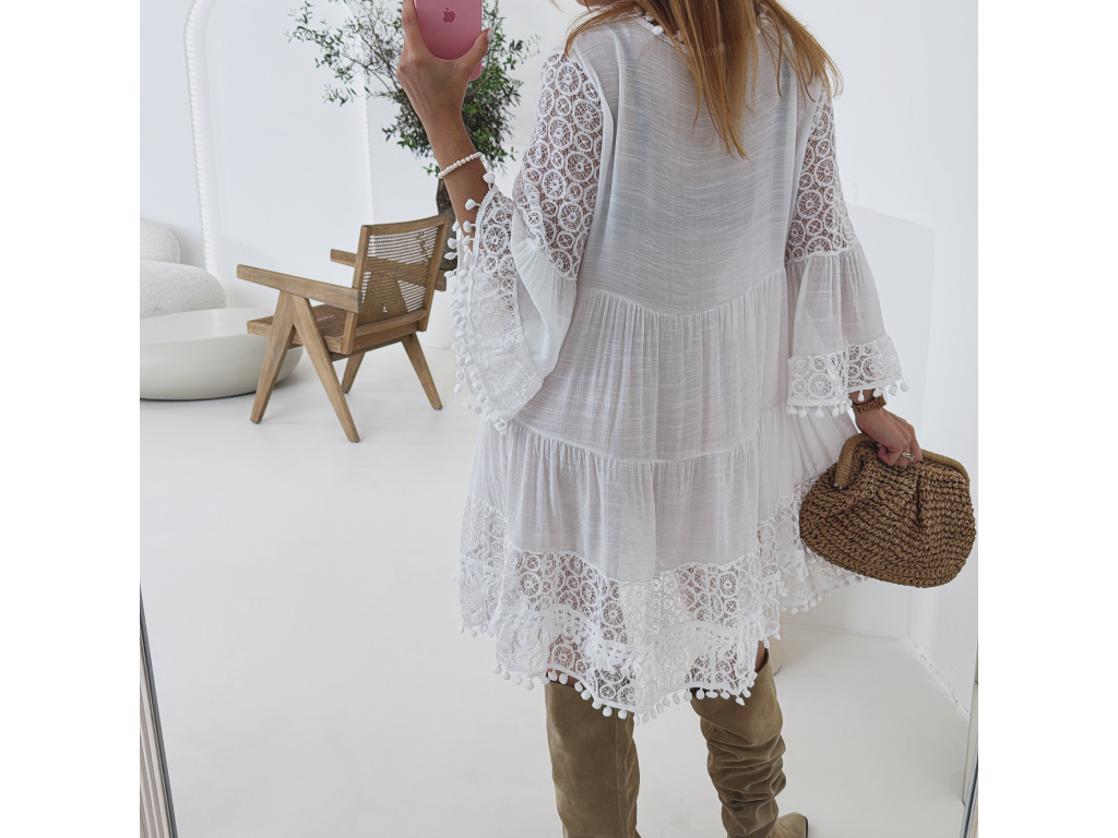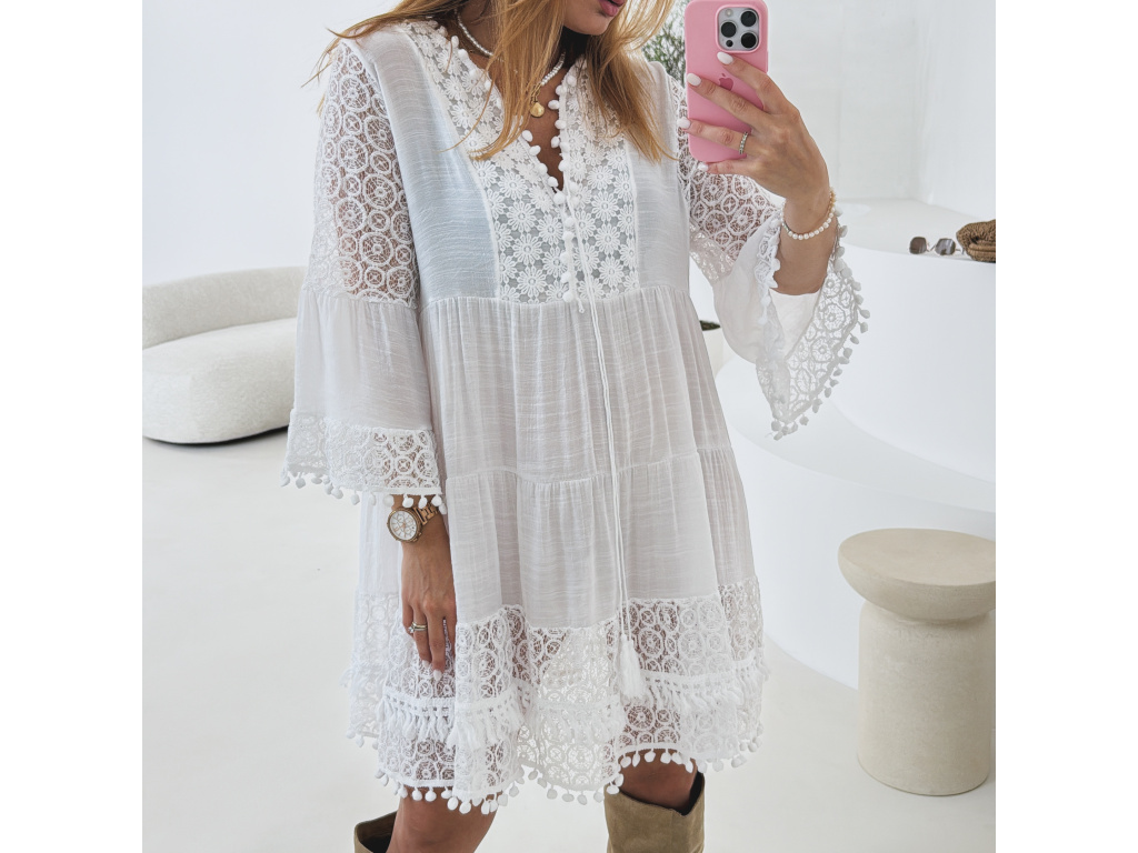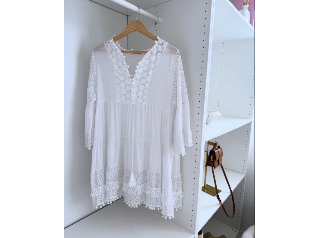 Romantické bílé tunikové šaty s bohatými krajkovými detaily, jemnými výšivkami a třásněmi, které dodávají boho nádech. Volnější střih zaručuje pohodlí a vzdušnost, zatímco krajková výšivka na rukávech a spodním lemu dodává šatům ženský šarm. Skvělé jako plážový outfit, letní šaty i lehký přehoz přes plavky. Šaty hezky vypadají s páskem. Pásek na fotce není součástí prodeje. Velikost je univerzální, sedí na XS až L.
