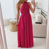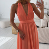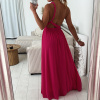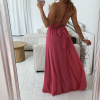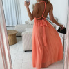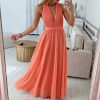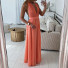 Krásné, romantické šaty dlouhého střihu s variabilním vázáním, které lze uvázat až na 10 způsobů. Materiál v prsou šatů je plisovaný. Šaty mají podšívku. V pase je guma, která hezky pruží. Barva je lososová, korálová, fuchsiová a béžová. Velikost je univerzální, sedí od XS až po menší L. Foceno je na velikosti XS a výšce 165 cm.
