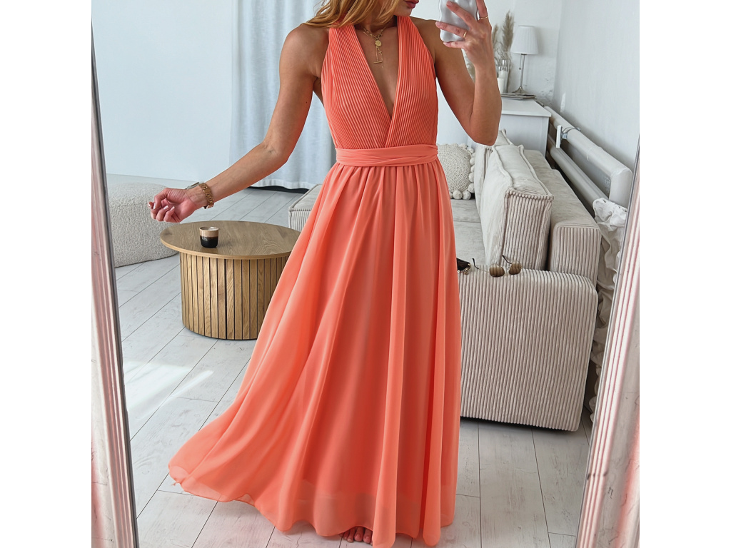 Krásné, romantické šaty dlouhého střihu s variabilním vázáním, které lze uvázat až na 10 způsobů. Materiál v prsou šatů je plisovaný. Šaty mají podšívku. V pase je guma, která hezky pruží. Barva je lososová, korálová, fuchsiová a béžová. Velikost je univerzální, sedí od XS až po menší L. Foceno je na velikosti XS a výšce 165 cm.