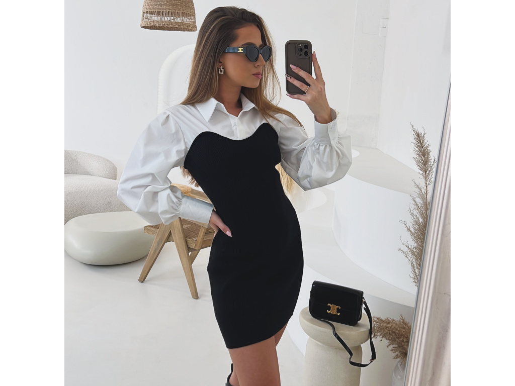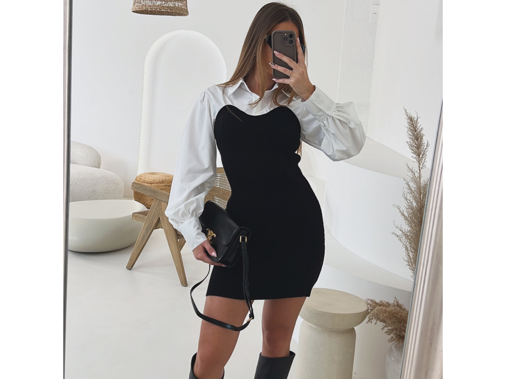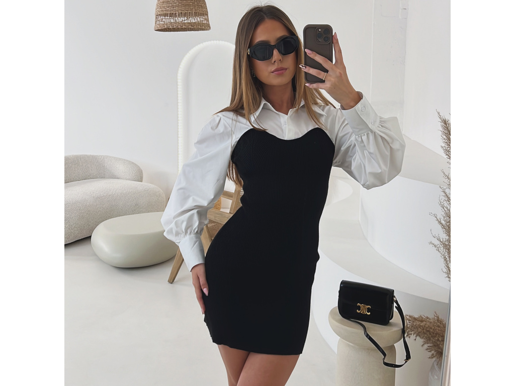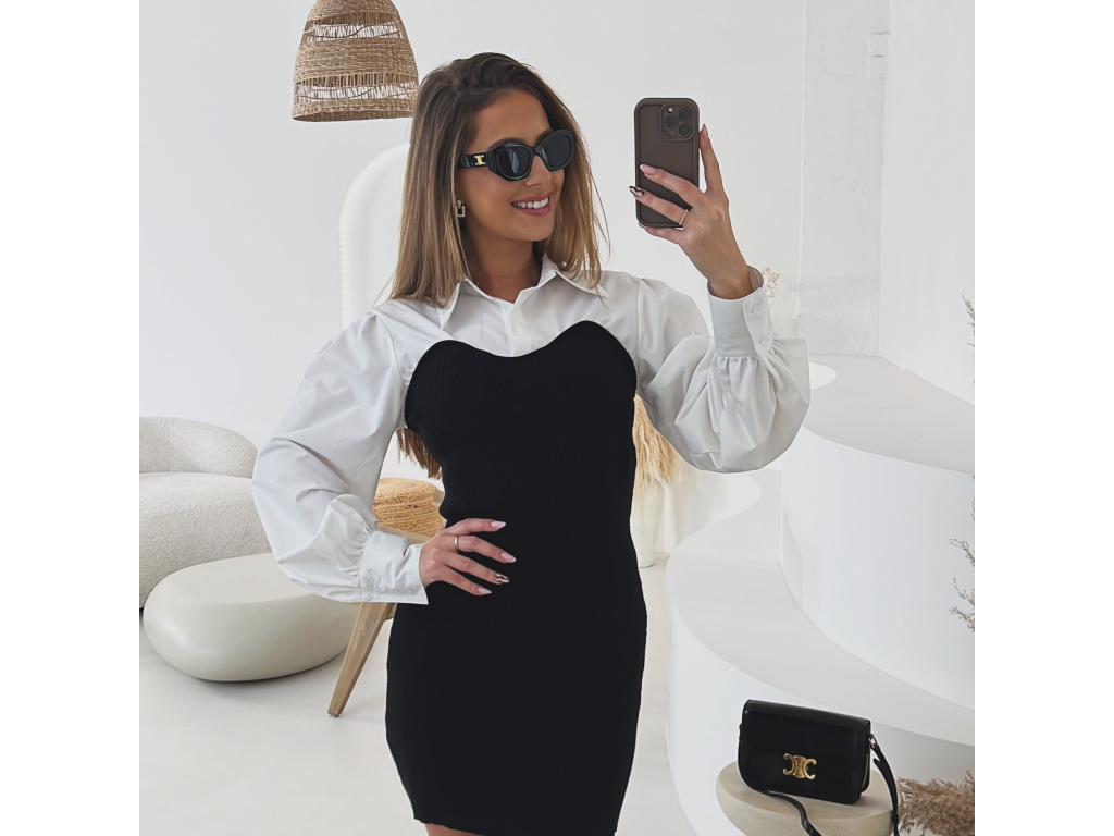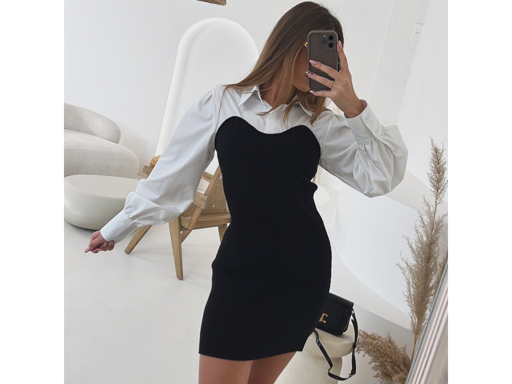 Elegantní černé šaty s bílou košilí jsou dokonalou kombinací klasiky a moderního stylu. Model tvoří pružná žebrovaná část, která krásně obepne postavu a zvýrazní ženské křivky, doplněná kontrastní košilovou částí s dlouhým rukávem a límečkem. Ideální volba pro business look, večerní posezení nebo elegantní denní outfit. Velikost je univerzální, sedí na XS,S a M. Materiál je elastický.