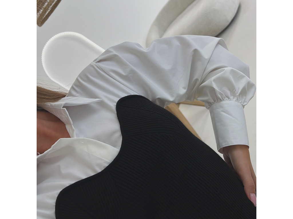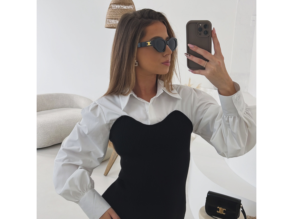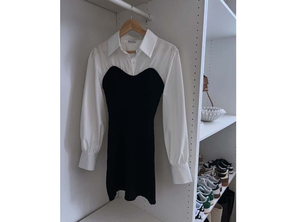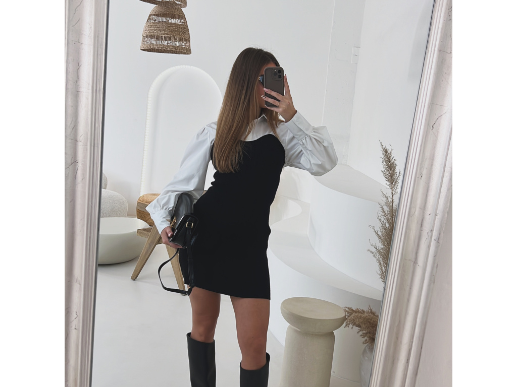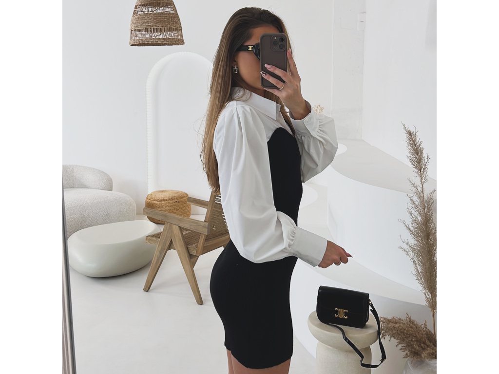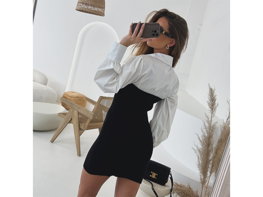 Elegantní černé šaty s bílou košilí jsou dokonalou kombinací klasiky a moderního stylu. Model tvoří pružná žebrovaná část, která krásně obepne postavu a zvýrazní ženské křivky, doplněná kontrastní košilovou částí s dlouhým rukávem a límečkem. Ideální volba pro business look, večerní posezení nebo elegantní denní outfit. Velikost je univerzální, sedí na XS,S a M. Materiál je elastický.