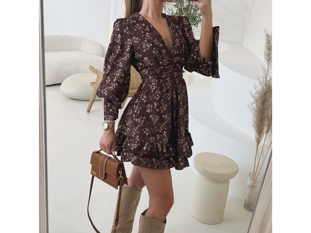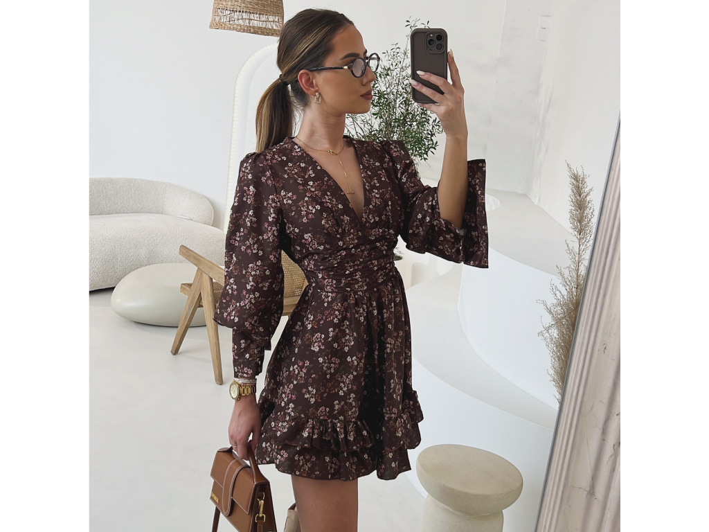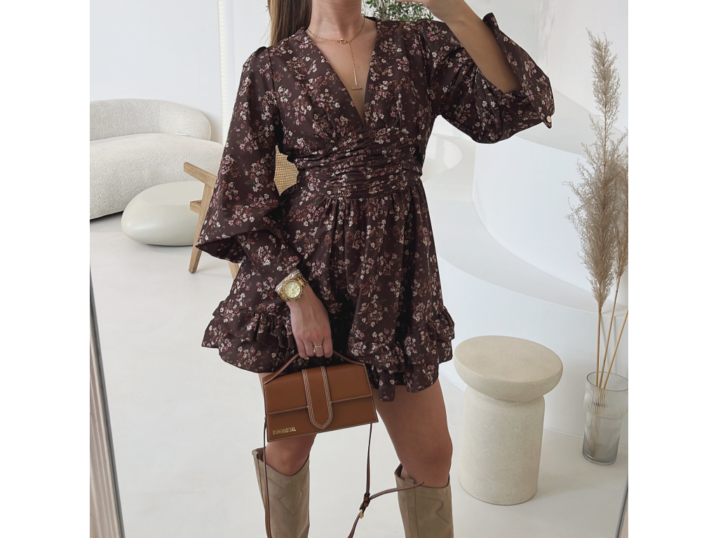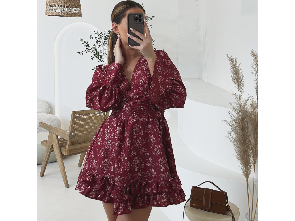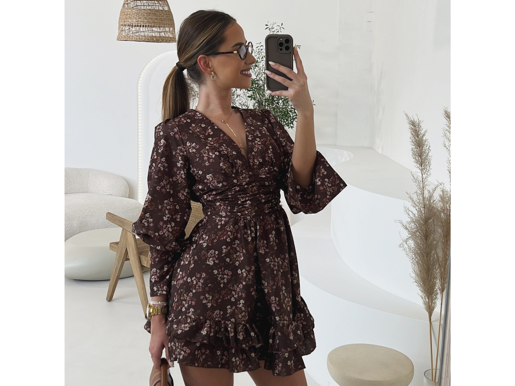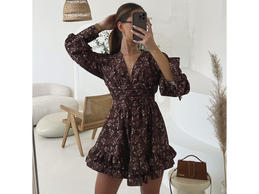Romantické květinové šaty s balonovými rukávy zakončenými manžetou na dva knoflíky. Zvýrazněný pas a jemné řasení lichotí postavě, zatímco volánkový spodní lem dodává hravý a ženský vzhled. Velikost je univerzální, sedí na XS,S a M.