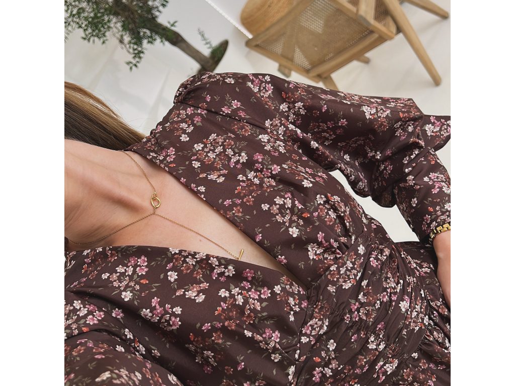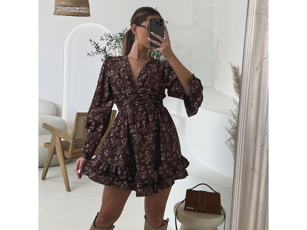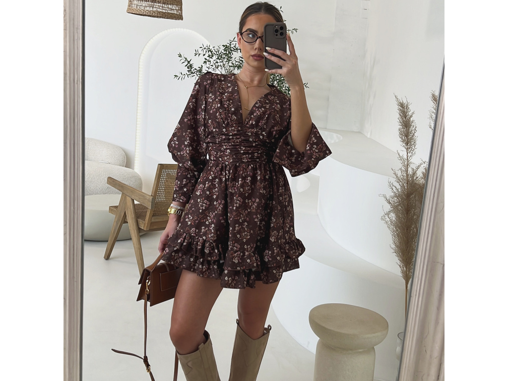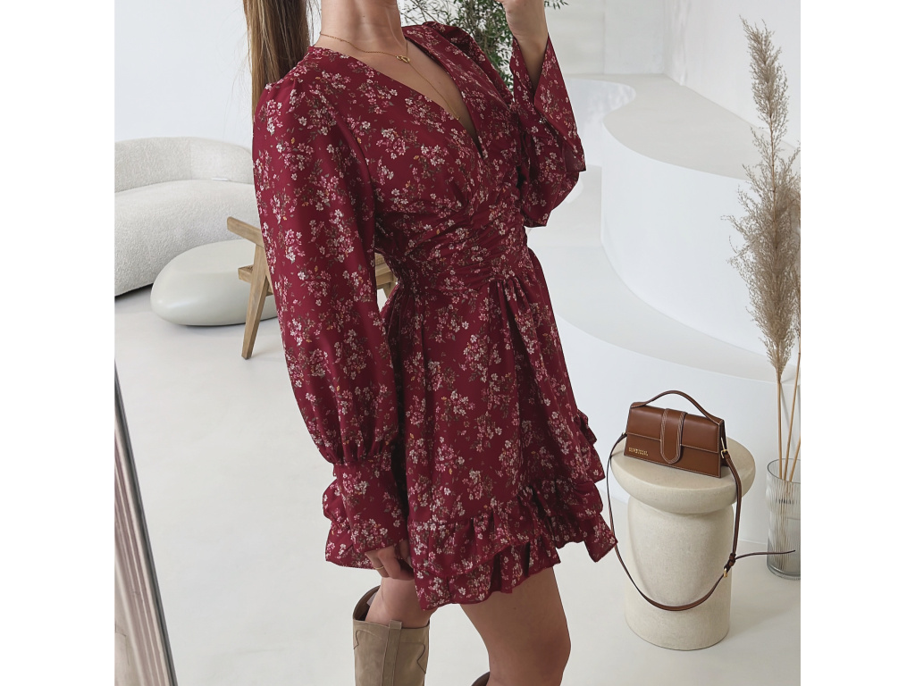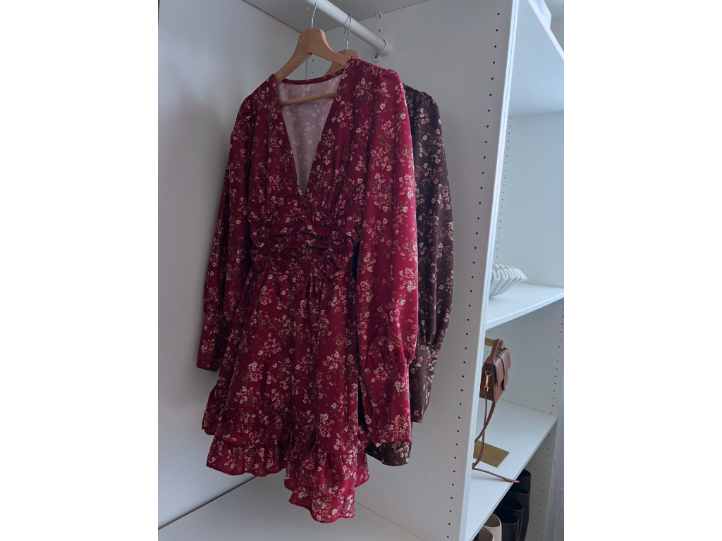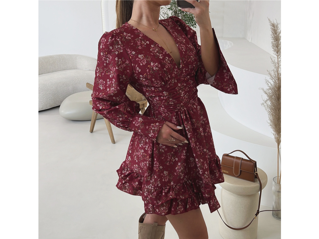 Romantické květinové šaty s balonovými rukávy zakončenými manžetou na dva knoflíky. Zvýrazněný pas a jemné řasení lichotí postavě, zatímco volánkový spodní lem dodává hravý a ženský vzhled. Velikost je univerzální, sedí na XS,S a M.