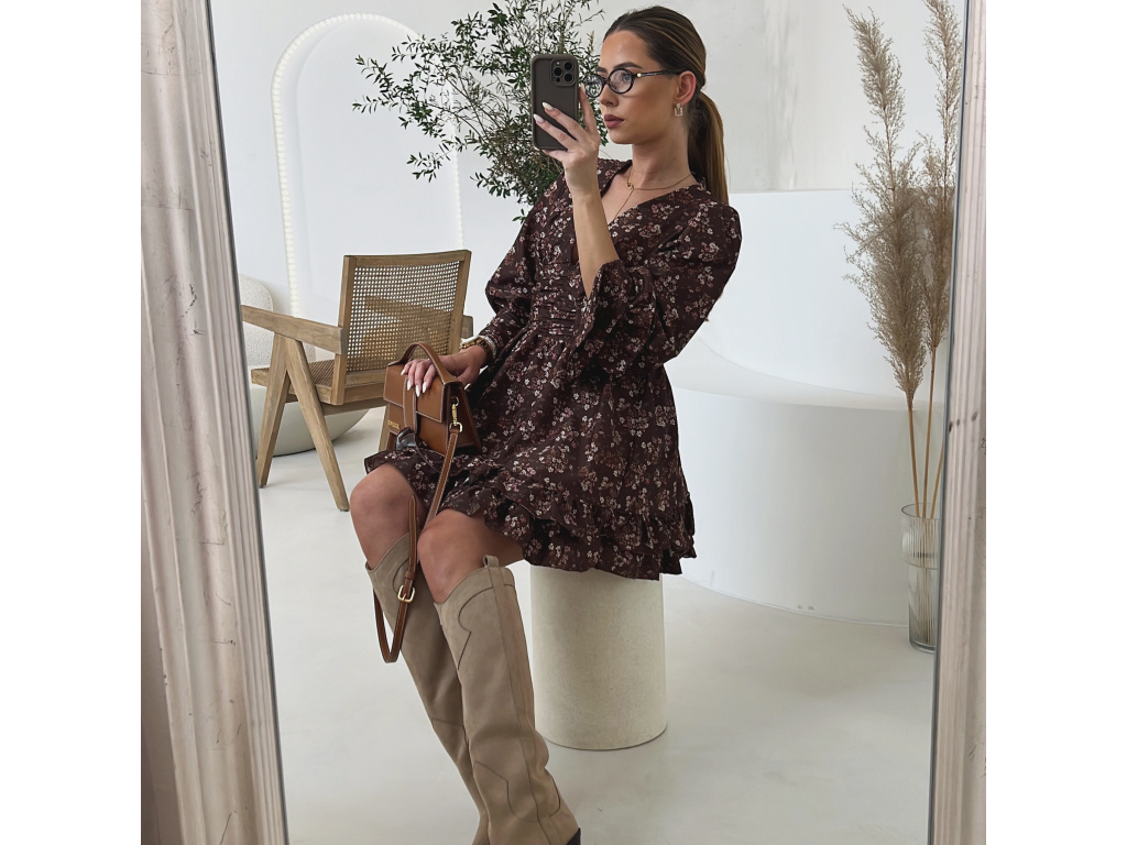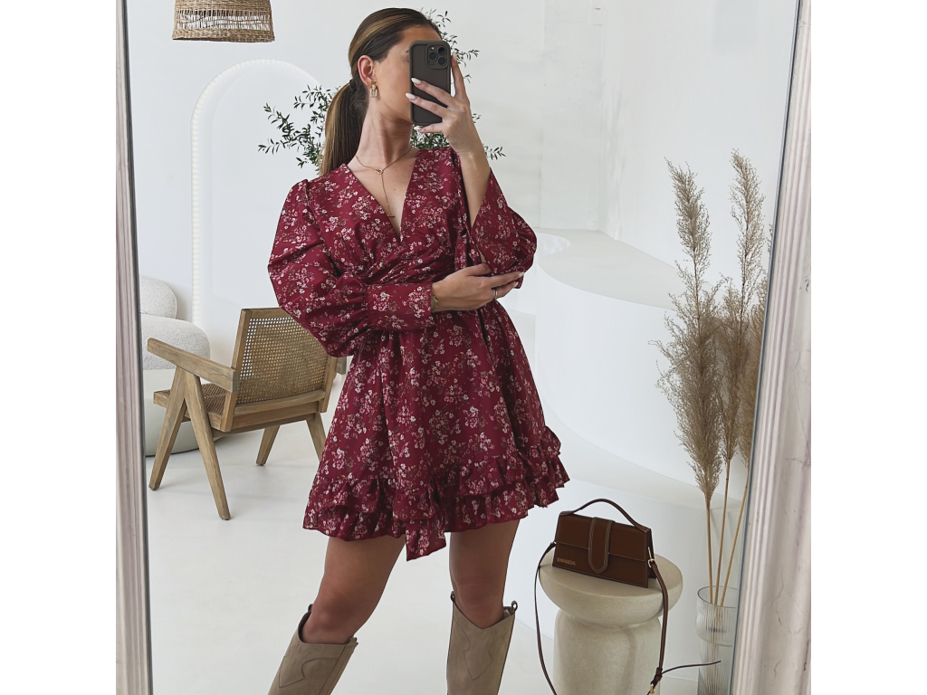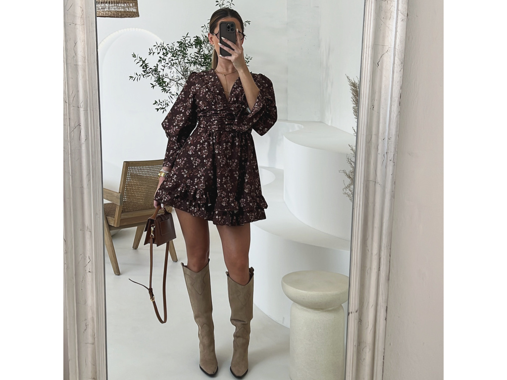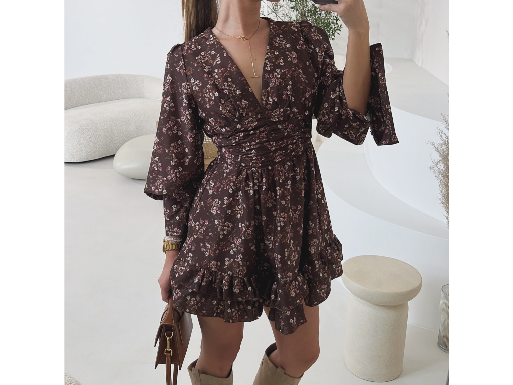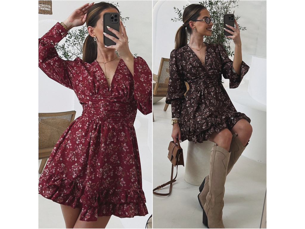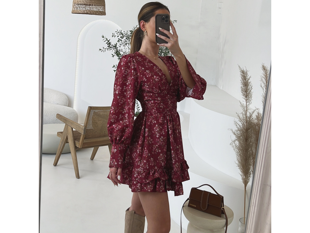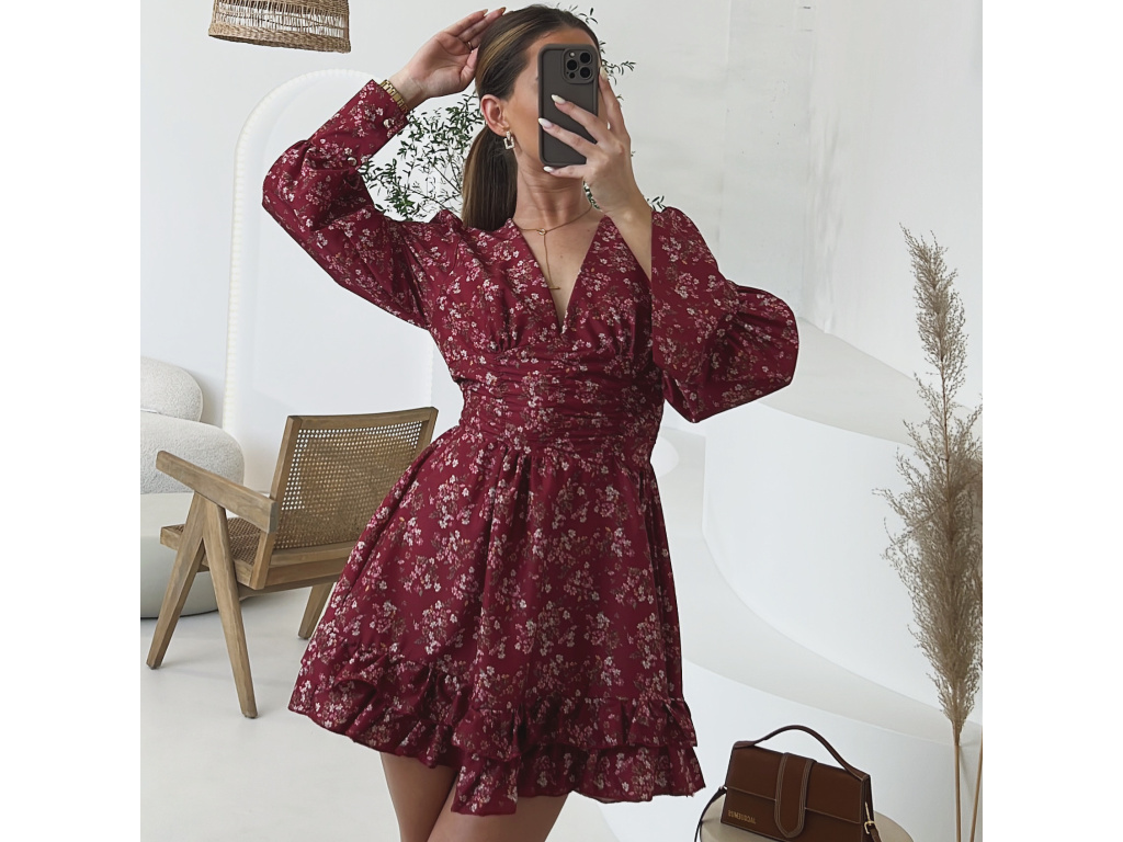 Romantické květinové šaty s balonovými rukávy zakončenými manžetou na dva knoflíky. Zvýrazněný pas a jemné řasení lichotí postavě, zatímco volánkový spodní lem dodává hravý a ženský vzhled. Velikost je univerzální, sedí na XS,S a M.