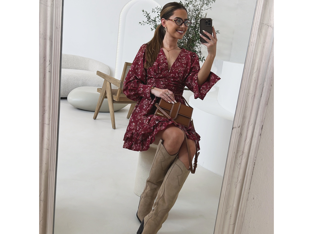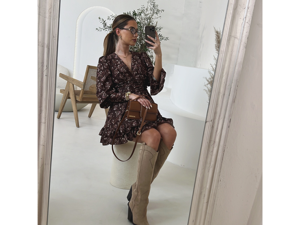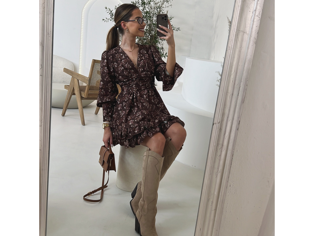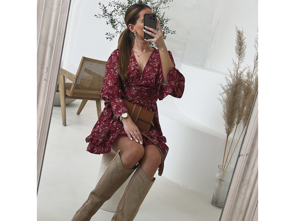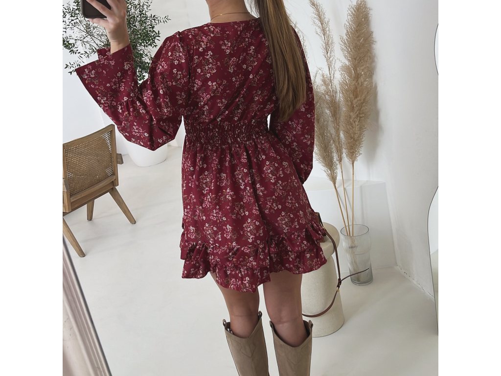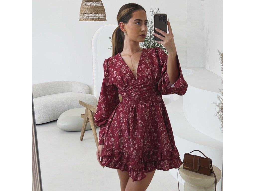 Romantické květinové šaty s balonovými rukávy zakončenými manžetou na dva knoflíky. Zvýrazněný pas a jemné řasení lichotí postavě, zatímco volánkový spodní lem dodává hravý a ženský vzhled. Velikost je univerzální, sedí na XS,S a M.