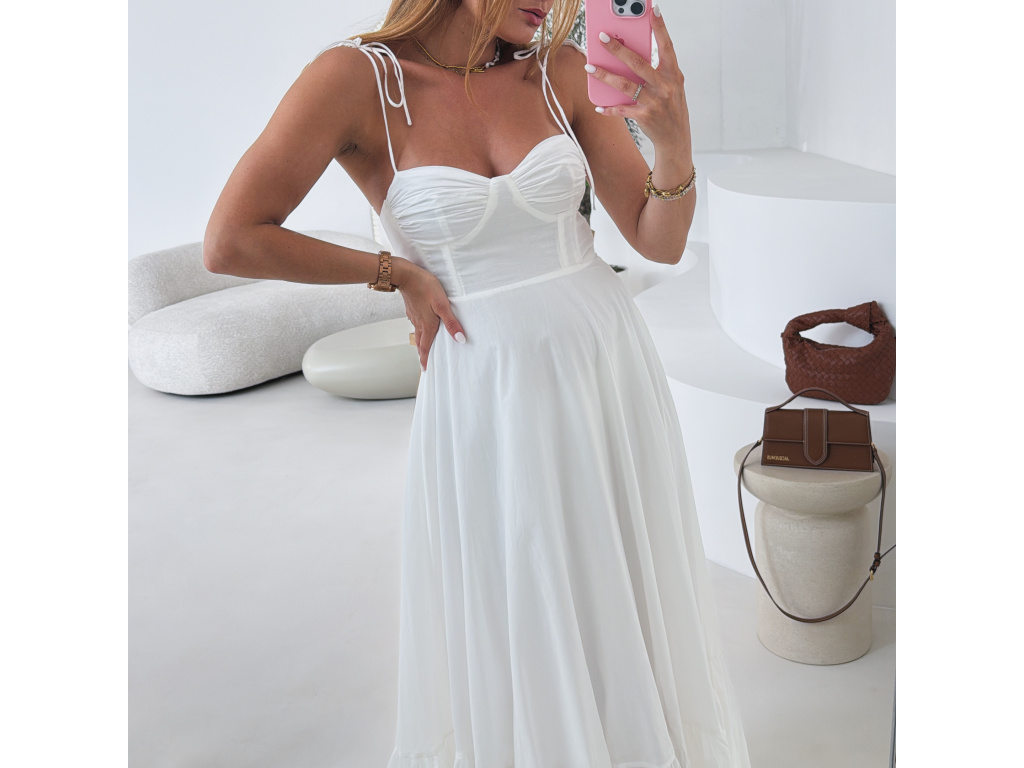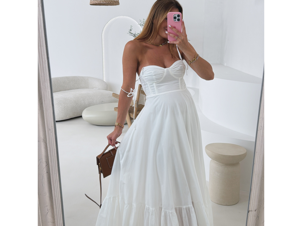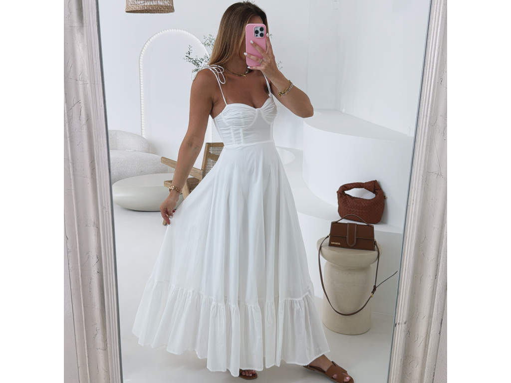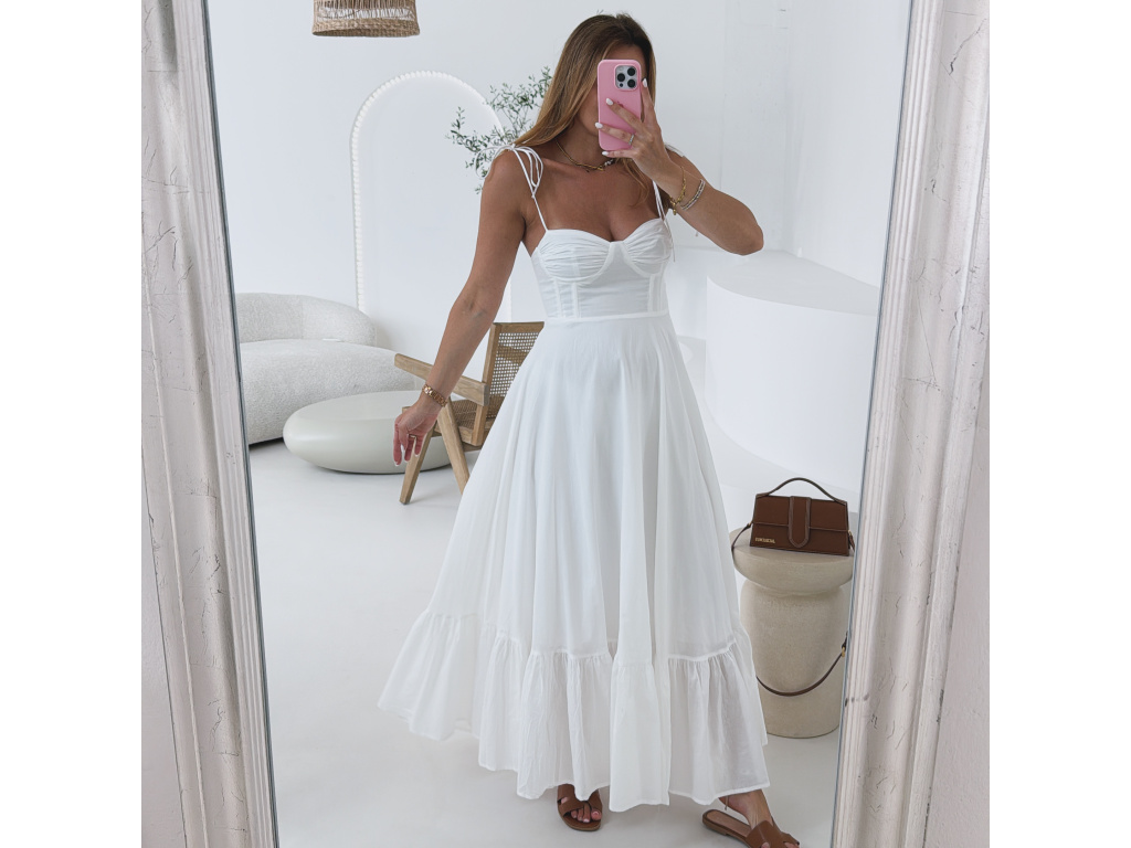 Romantické bavlněné šaty s korzetovým živůtkem a bohatou, splývavou sukní. Ramínka na zavazování umožňují nastavit délku podle potřeby. Šaty mají boční zip pro pohodlné oblékání a jsou celé vypodšívkované. Dostupné ve velikosti S,M a L. V oblasti prsou jsou elastické.