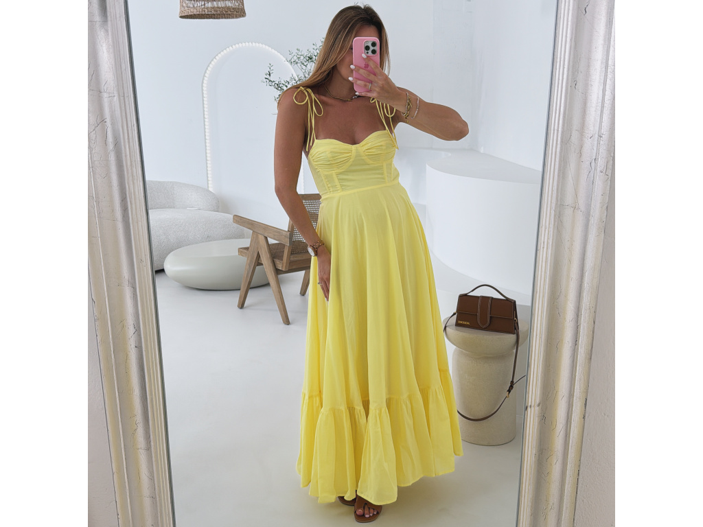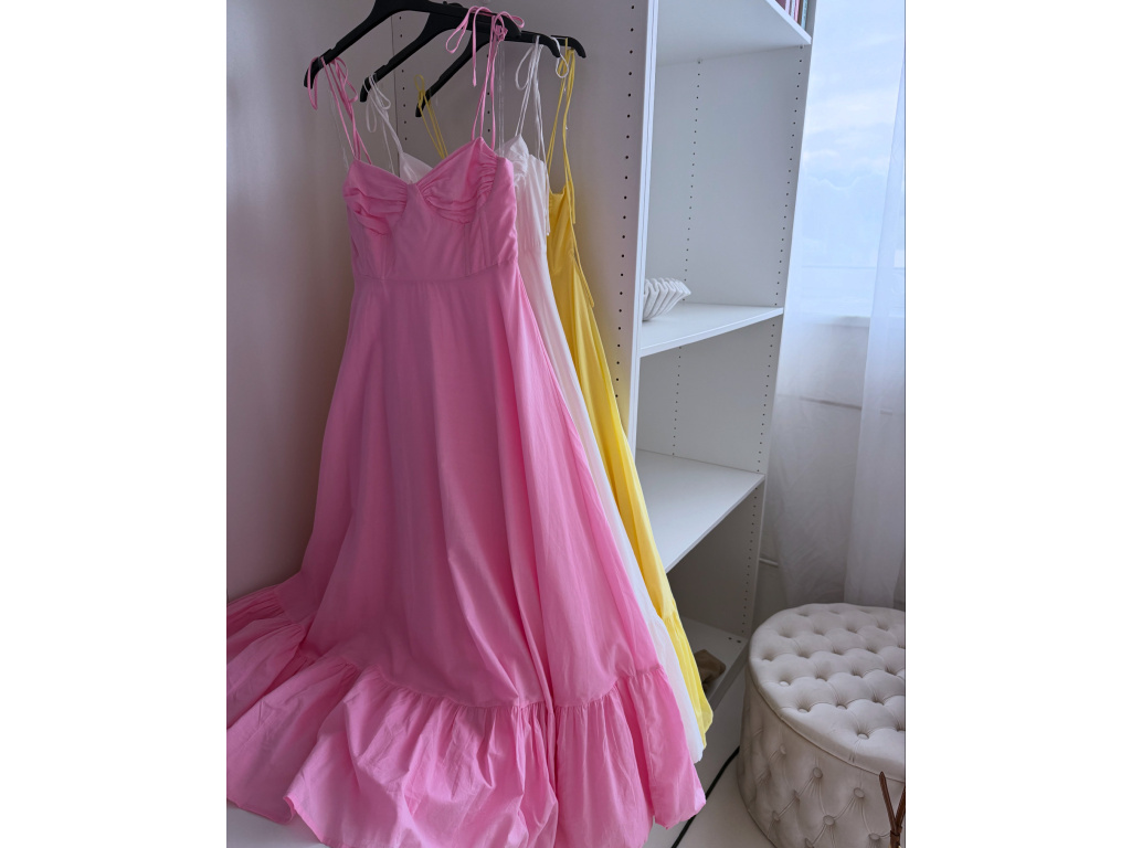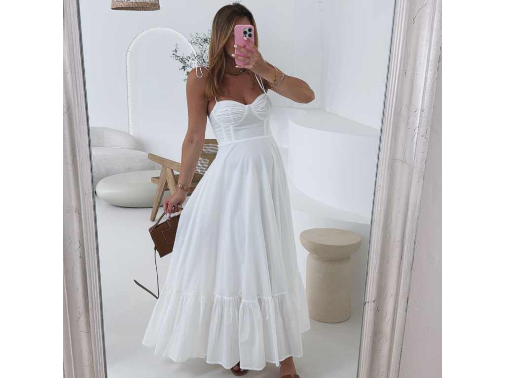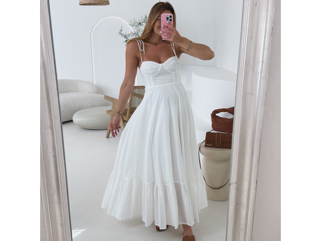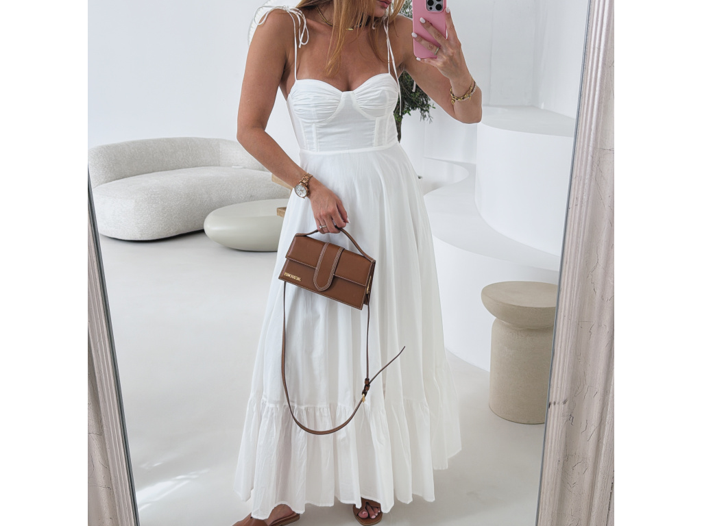 Romantické bavlněné šaty s korzetovým živůtkem a bohatou, splývavou sukní. Ramínka na zavazování umožňují nastavit délku podle potřeby. Šaty mají boční zip pro pohodlné oblékání a jsou celé vypodšívkované. Dostupné ve velikosti S,M a L. V oblasti prsou jsou elastické.