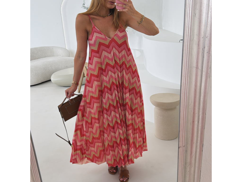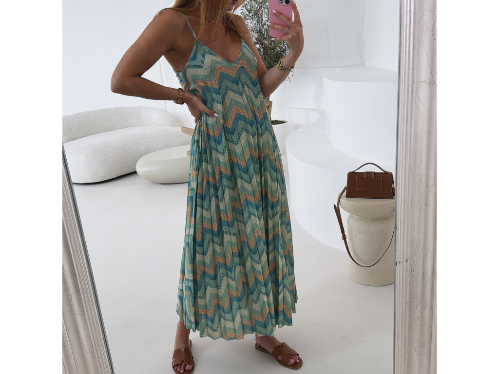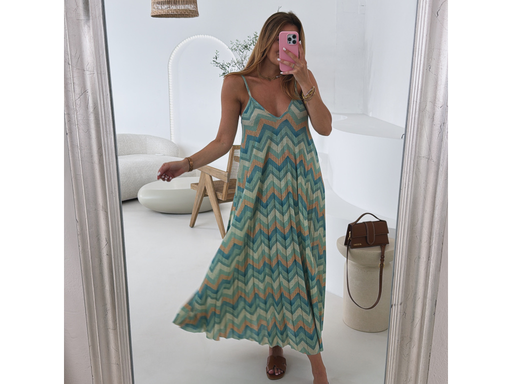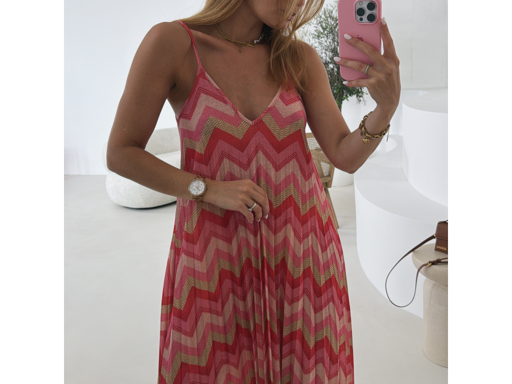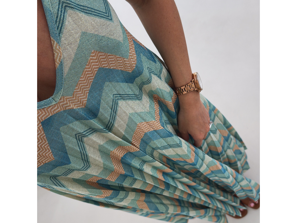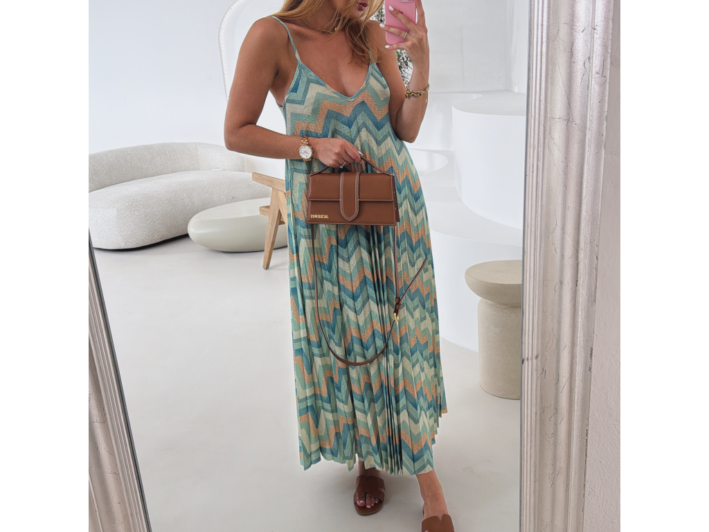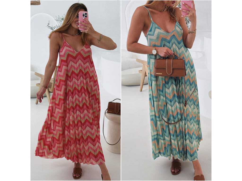 Lehké maxi šaty s výrazným cik-cak vzorem ve dvou barevných provedeních. Volný, splývavý střih a tenká ramínka zajišťují pohodlí i elegantní vzhled. Ideální volba pro letní dny, dovolenou nebo stylové městské procházky. Velikost je univerzální, sedí na XS až M. Šaty mají zlatou, třpytivou nit.
