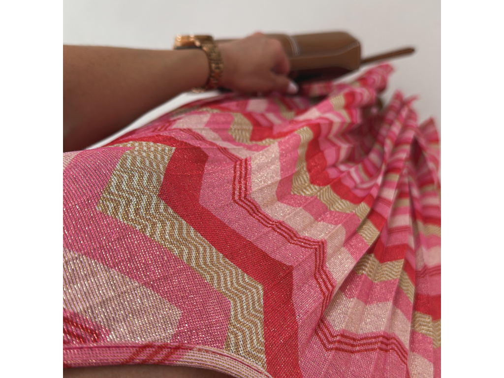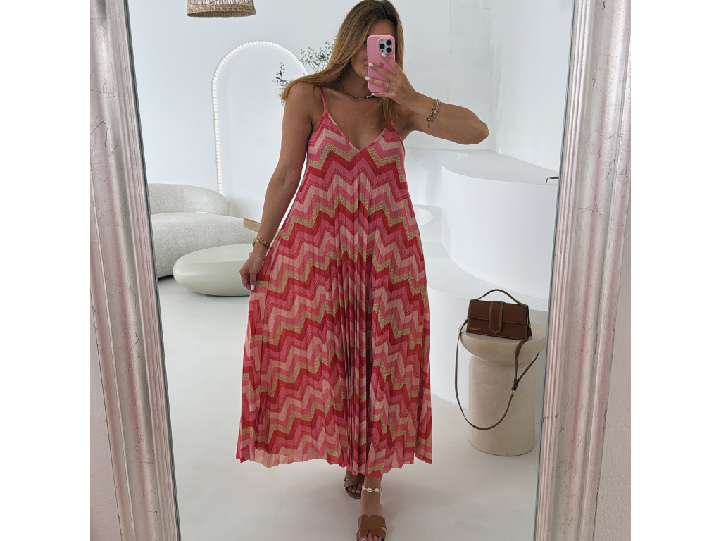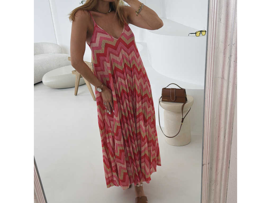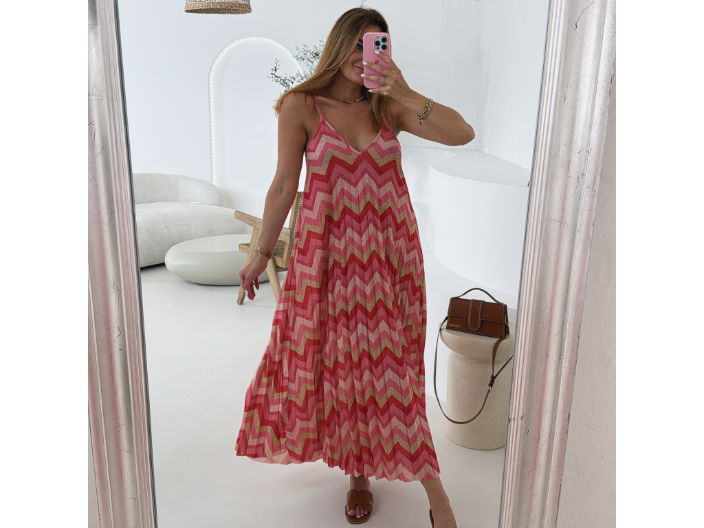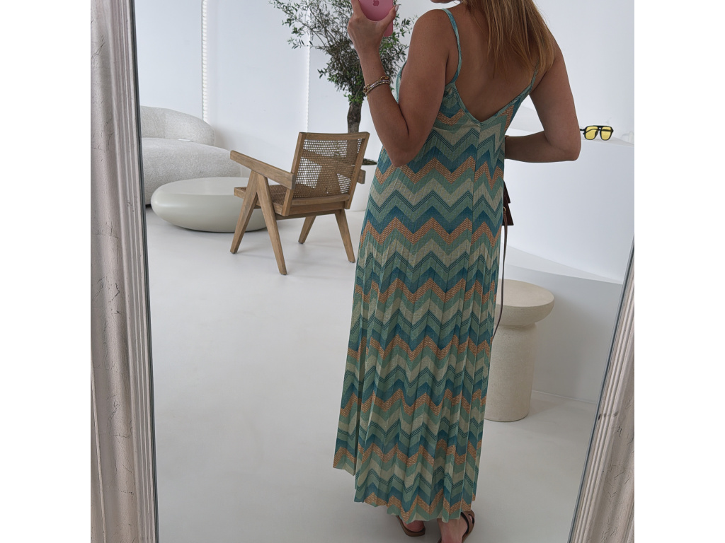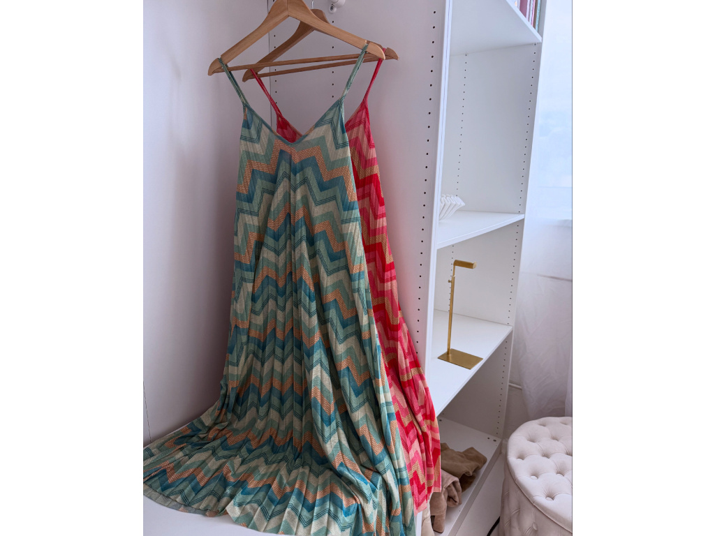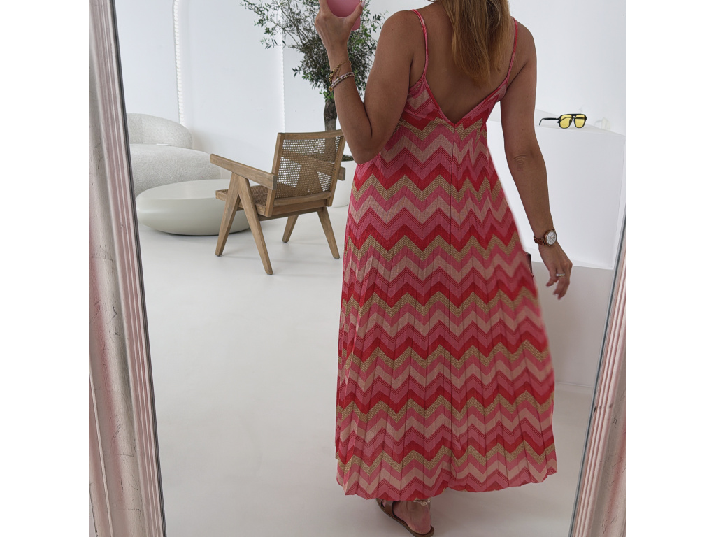 Lehké maxi šaty s výrazným cik-cak vzorem ve dvou barevných provedeních. Volný, splývavý střih a tenká ramínka zajišťují pohodlí i elegantní vzhled. Ideální volba pro letní dny, dovolenou nebo stylové městské procházky. Velikost je univerzální, sedí na XS až M. Šaty mají zlatou, třpytivou nit.