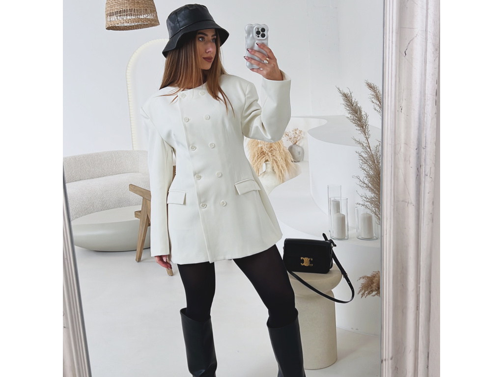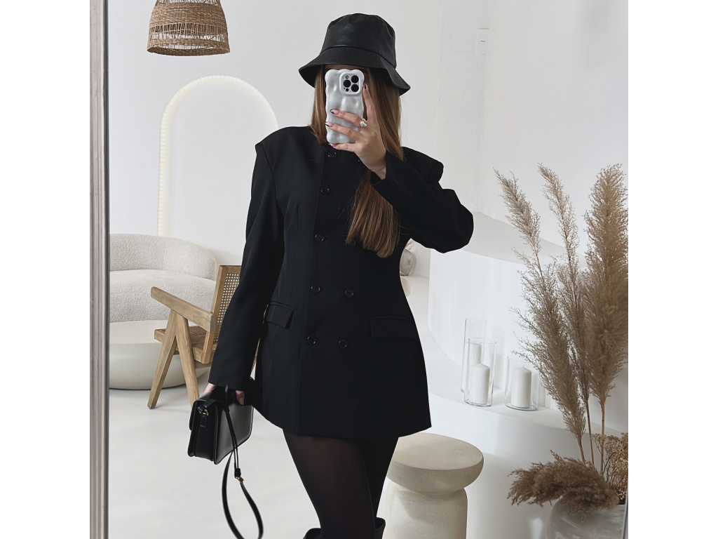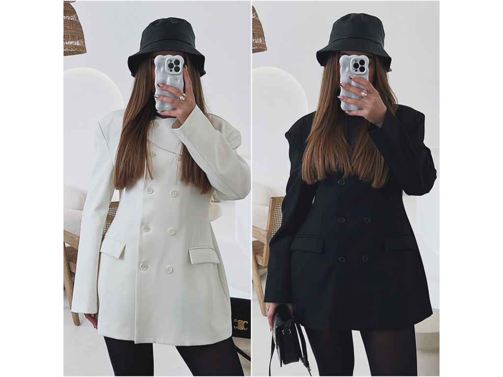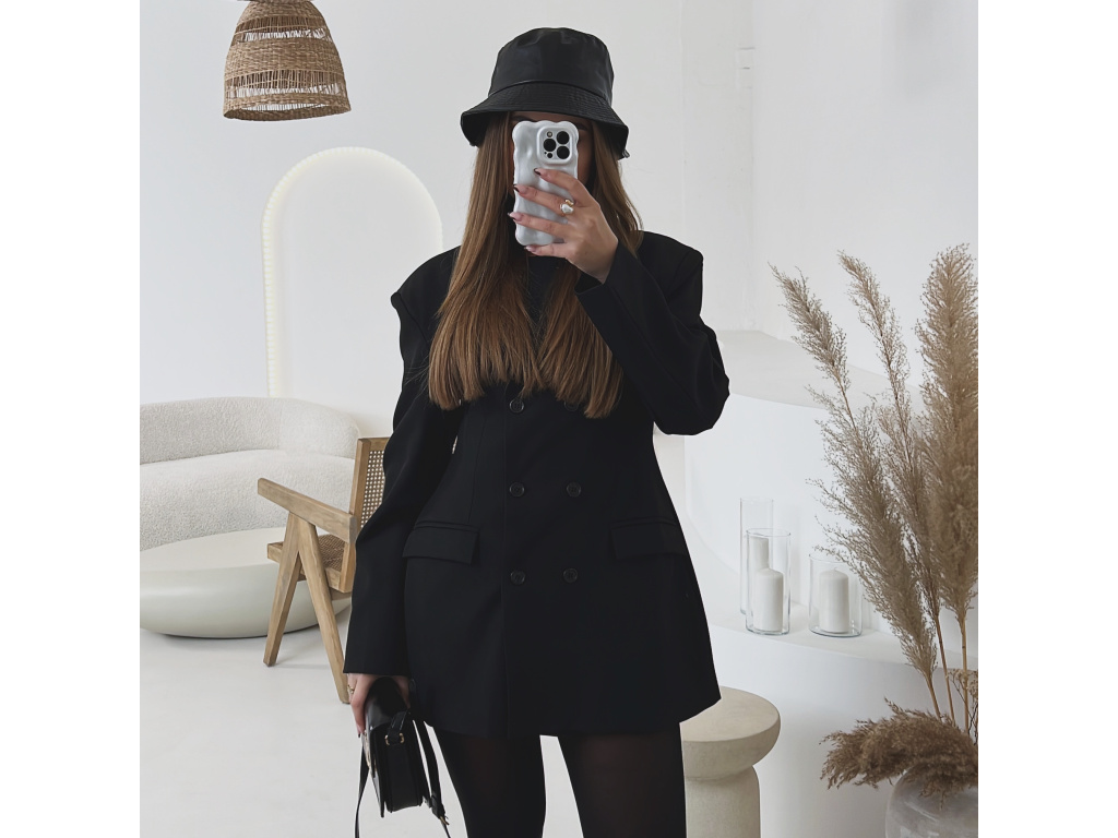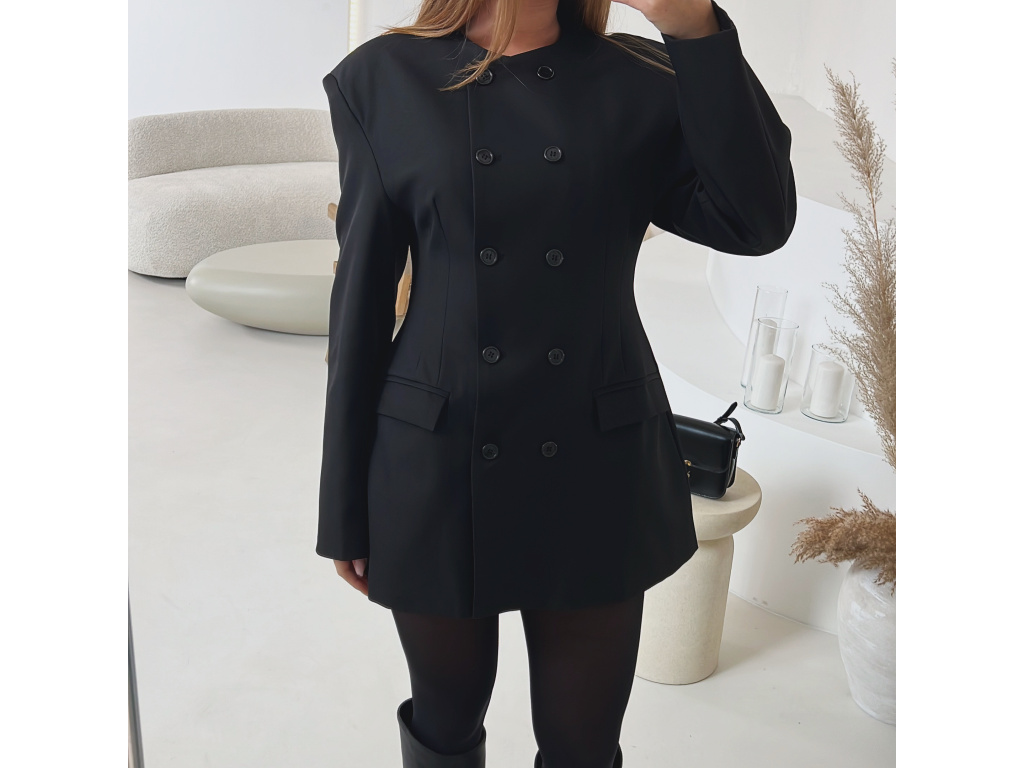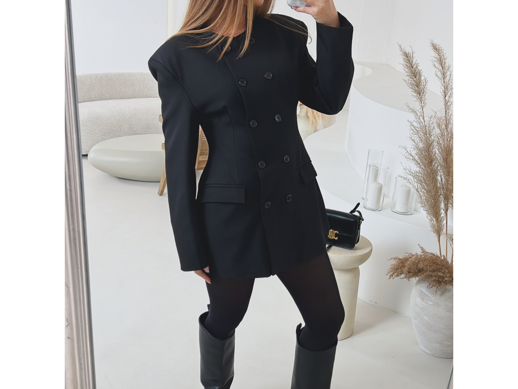 Elegantní, prodloužené a kvalitně ušité sako se siluetou sakových šatů působí nadčasově a stylově. Má výrazně vystužená ramena, která dodávají moderní strukturovaný vzhled, a je kompletně podšité pro maximální komfort. Zapínání je řešeno dvouřadými knoflíky, vzadu je decentní rozparek pro volnost pohybu. Ideální k nošení jako mini šaty nebo jako delší sako přes outfit.