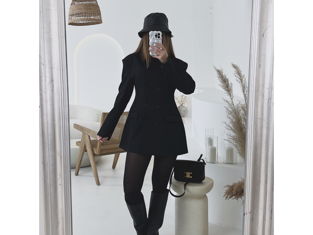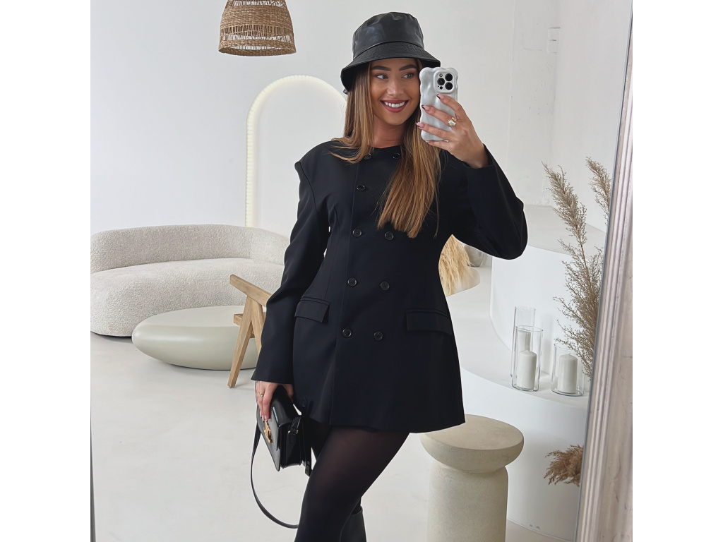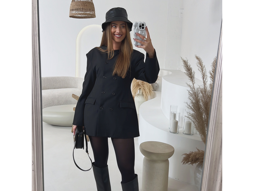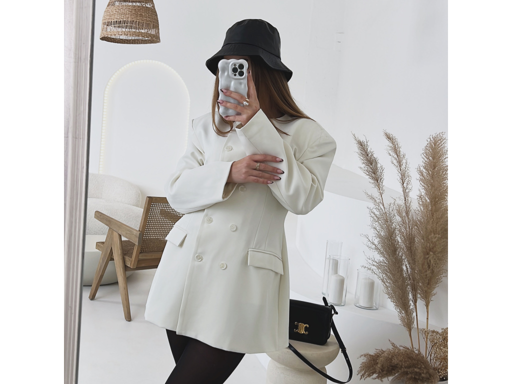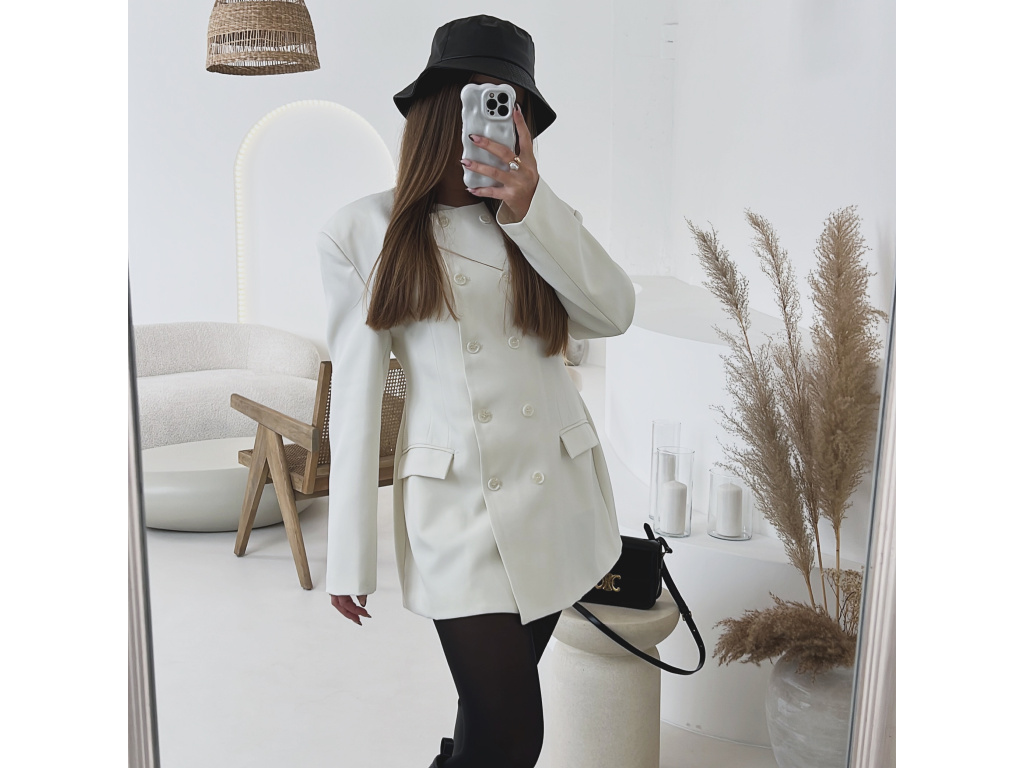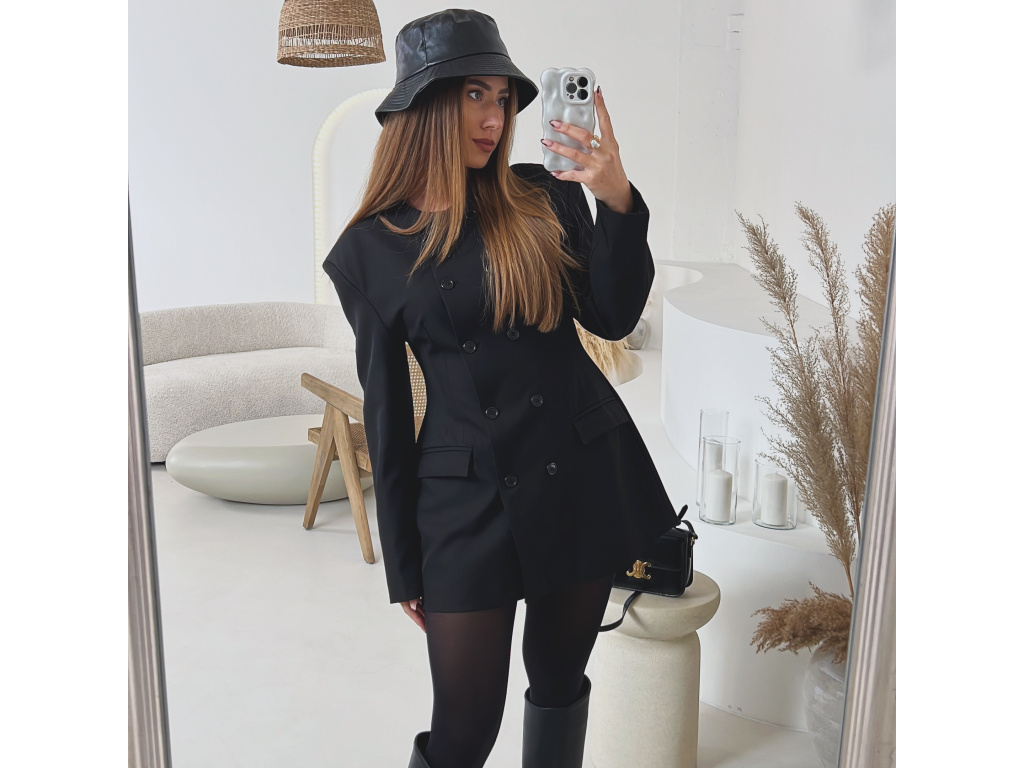 Elegantní, prodloužené a kvalitně ušité sako se siluetou sakových šatů působí nadčasově a stylově. Má výrazně vystužená ramena, která dodávají moderní strukturovaný vzhled, a je kompletně podšité pro maximální komfort. Zapínání je řešeno dvouřadými knoflíky, vzadu je decentní rozparek pro volnost pohybu. Ideální k nošení jako mini šaty nebo jako delší sako přes outfit.