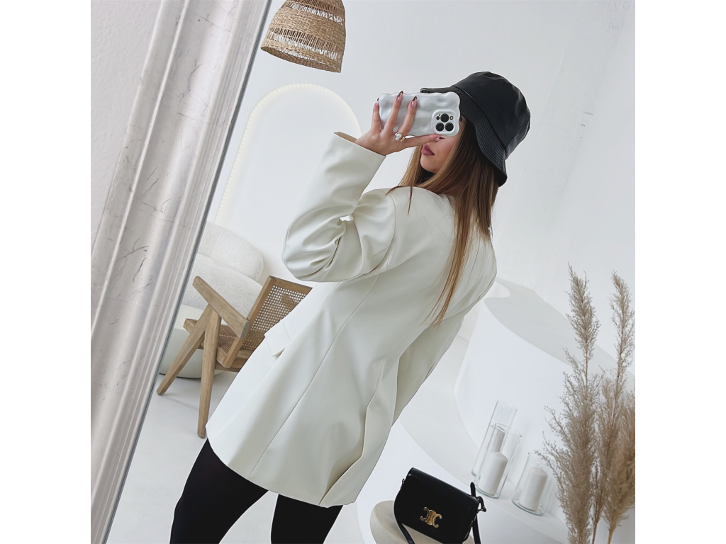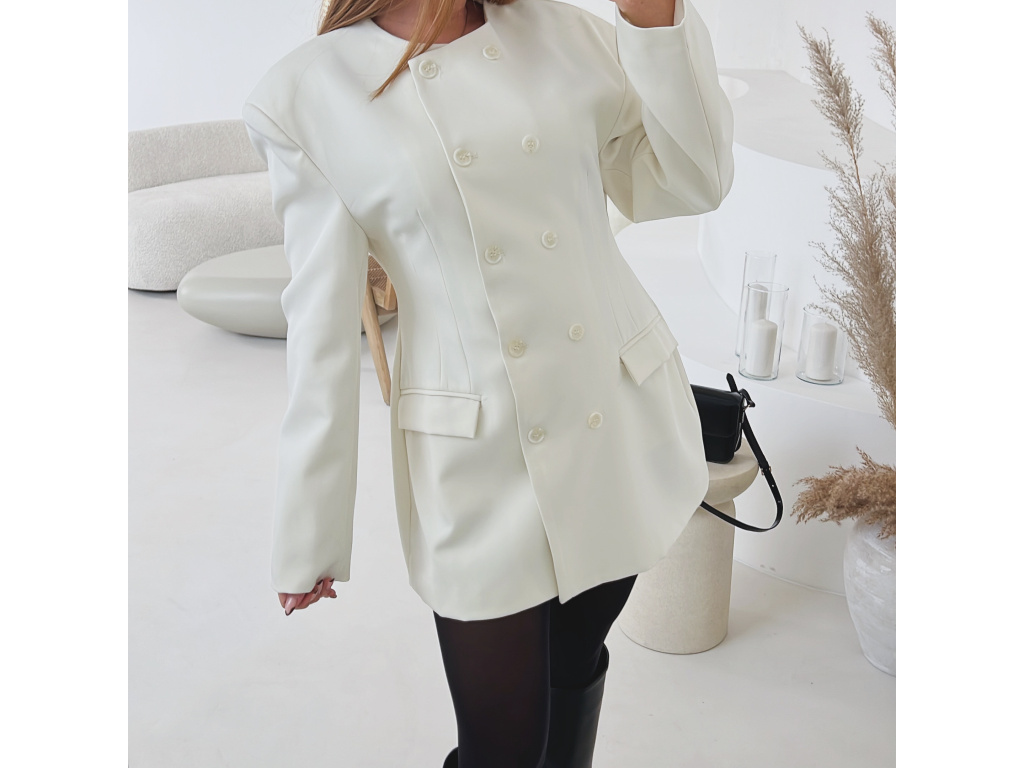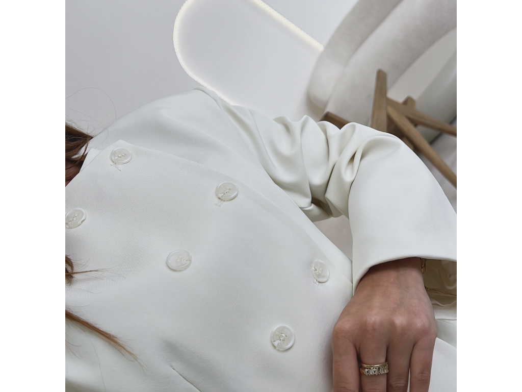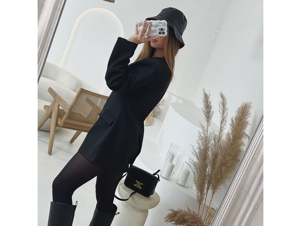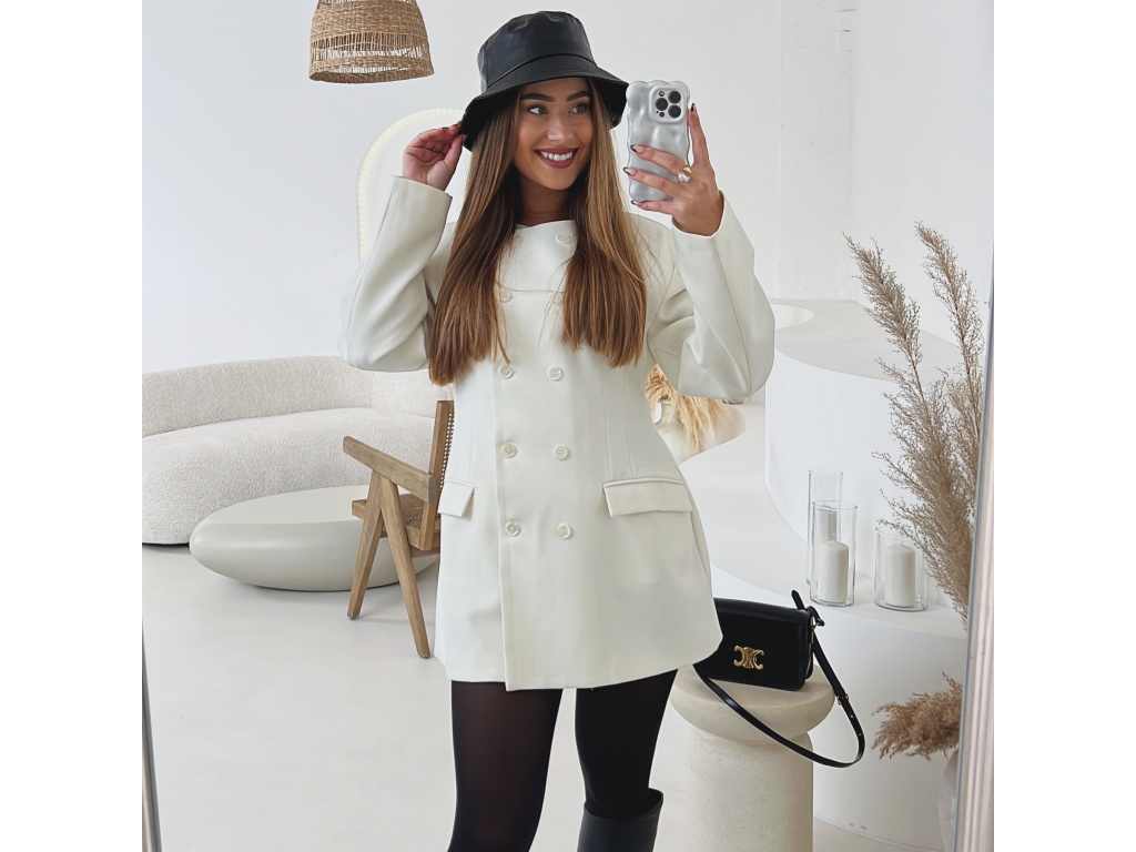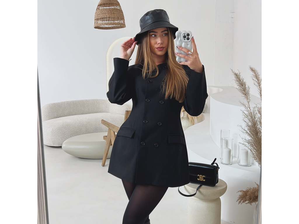 Elegantní, prodloužené a kvalitně ušité sako se siluetou sakových šatů působí nadčasově a stylově. Má výrazně vystužená ramena, která dodávají moderní strukturovaný vzhled, a je kompletně podšité pro maximální komfort. Zapínání je řešeno dvouřadými knoflíky, vzadu je decentní rozparek pro volnost pohybu. Ideální k nošení jako mini šaty nebo jako delší sako přes outfit.