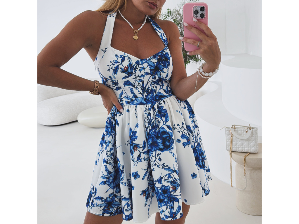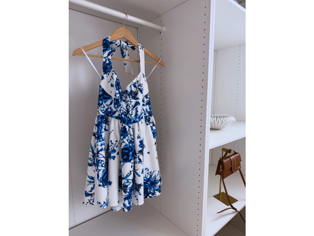 Elegantní korzetové mini šaty s výrazným modrobílým květinovým potiskem. Horní část tvoří korzetový střih, který se zavazuje za krkem a krásně zvýrazní ramena i dekolt. Zapínání je řešeno skrytým zipem na boku pro čistý vzhled a pohodlné oblékání. Rozšířená sukně dodává šatům hravost a ženskost – ideální na letní oslavy či dovolenou. Velikost je S a M.